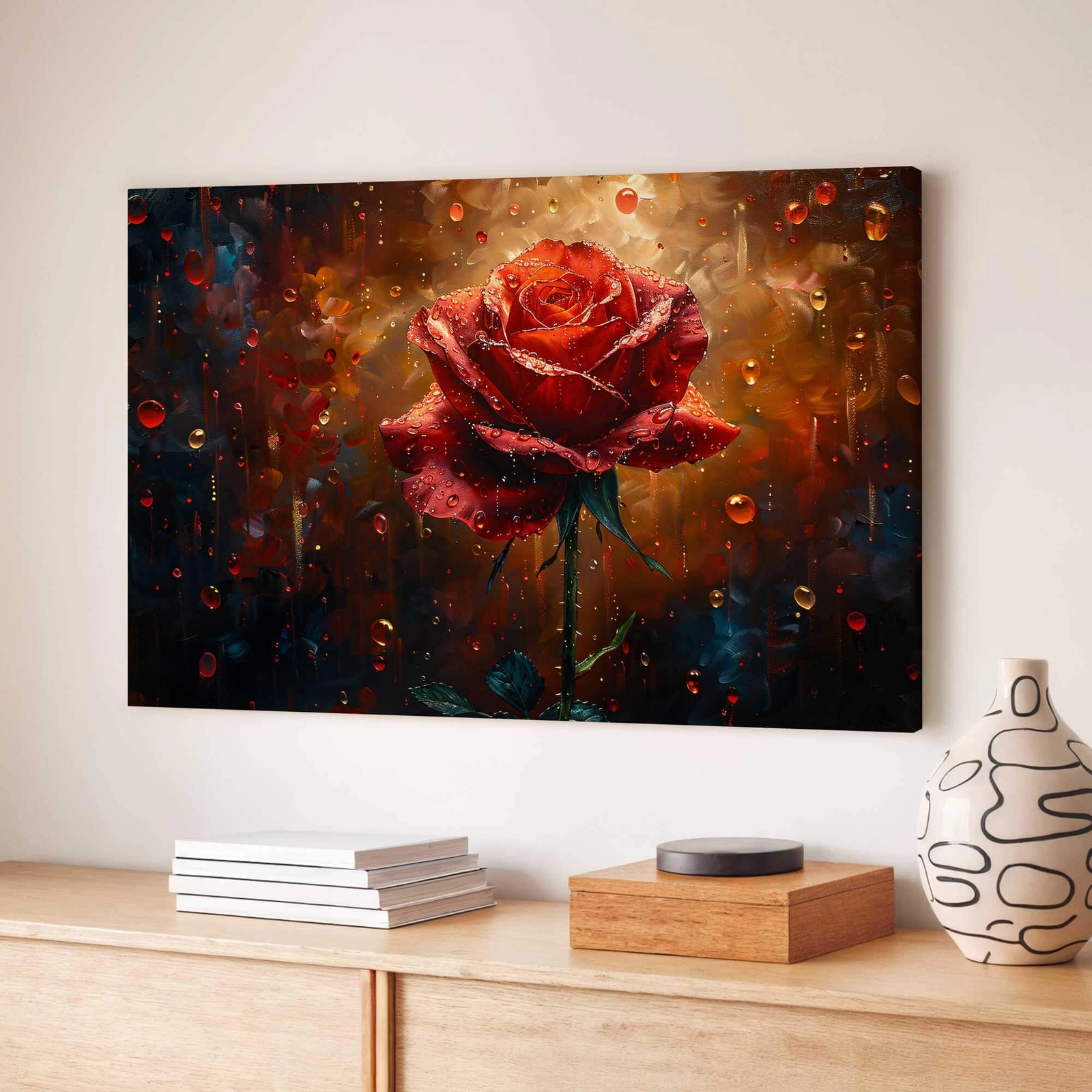 - Obraz Na Płótnie Róża W Deszczu to wyjątkowa dekoracja, która łączy elegancję natury z nutą romantyzmu. Soczysta czerwień róży pokrytej kroplami deszczu nada wnętrzu niepowtarzalny charakter, wprowadzając atmosferę pasji i subtelnego uroku.