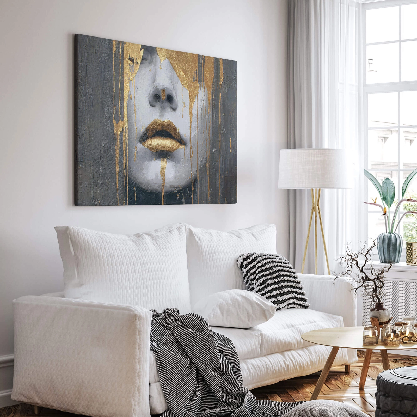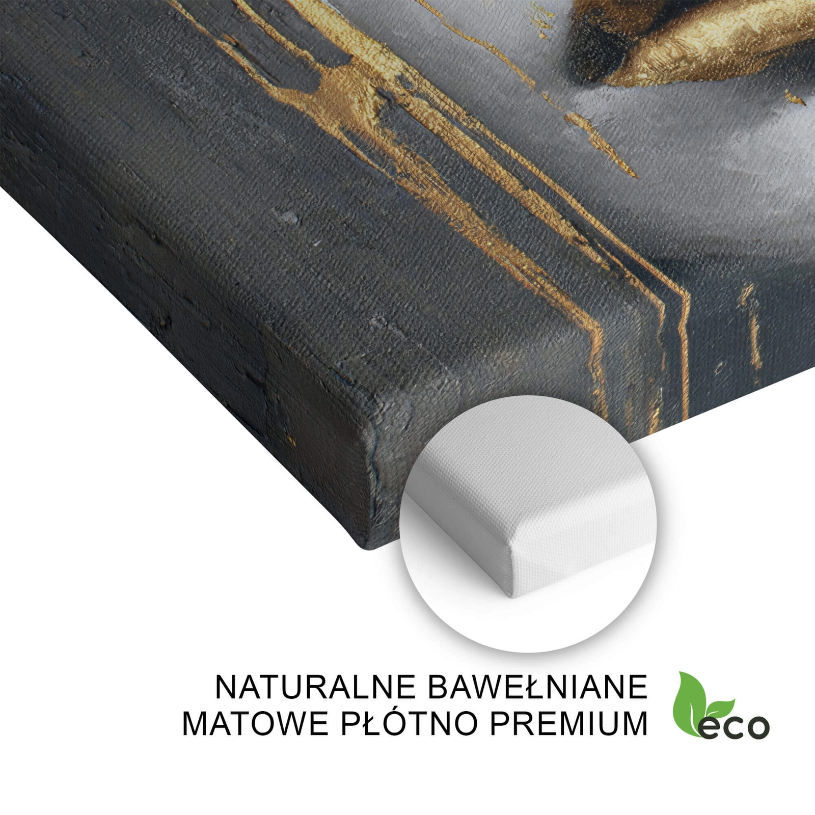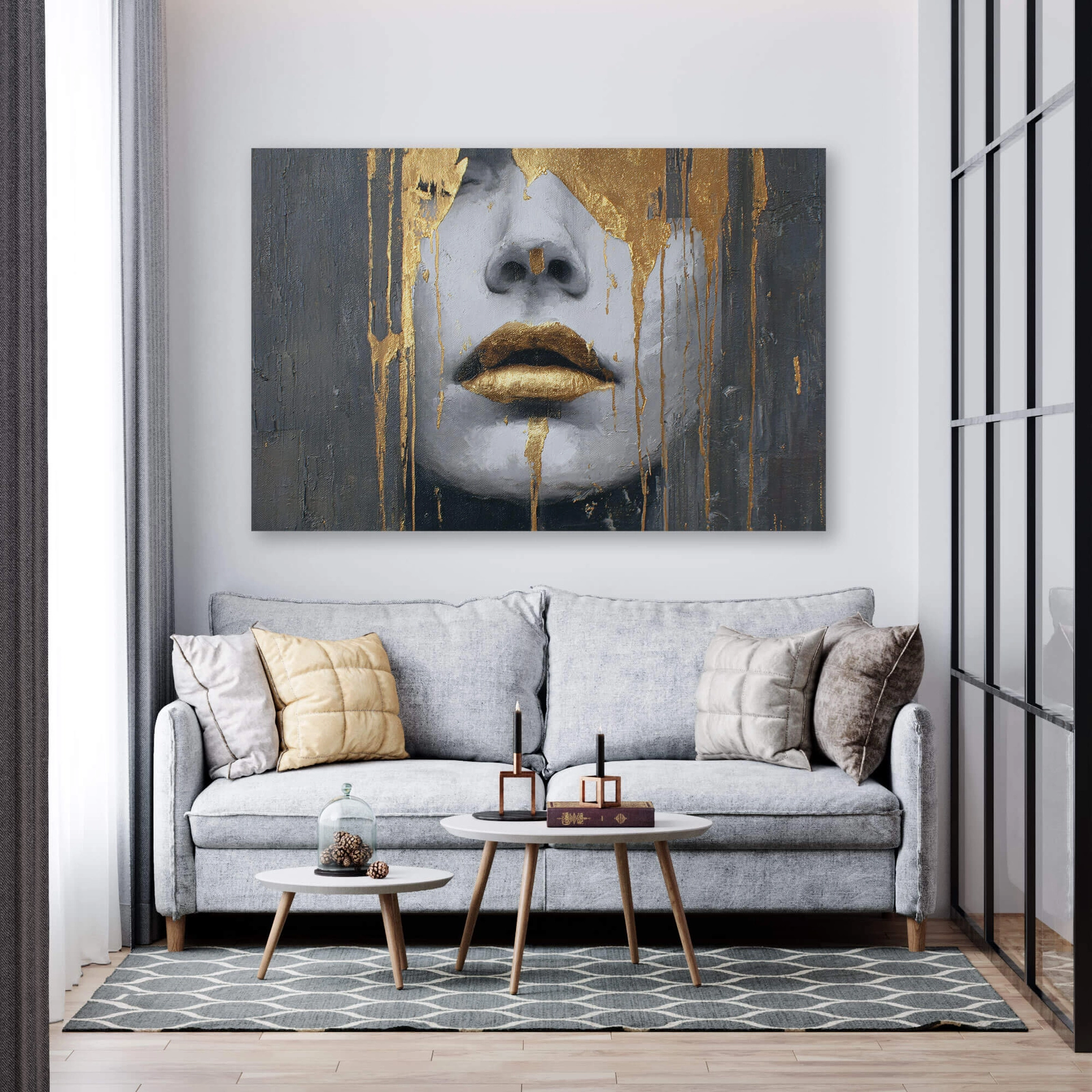 - Obraz na płótnie „Złote Milczenie” to nowoczesna dekoracja łącząca chłodne szarości z luksusowym złotem. Subtelna twarz i dynamiczne akcenty tworzą elegancki, wyrazisty element idealny do wnętrz glamour, loft i przestrzeni premium.