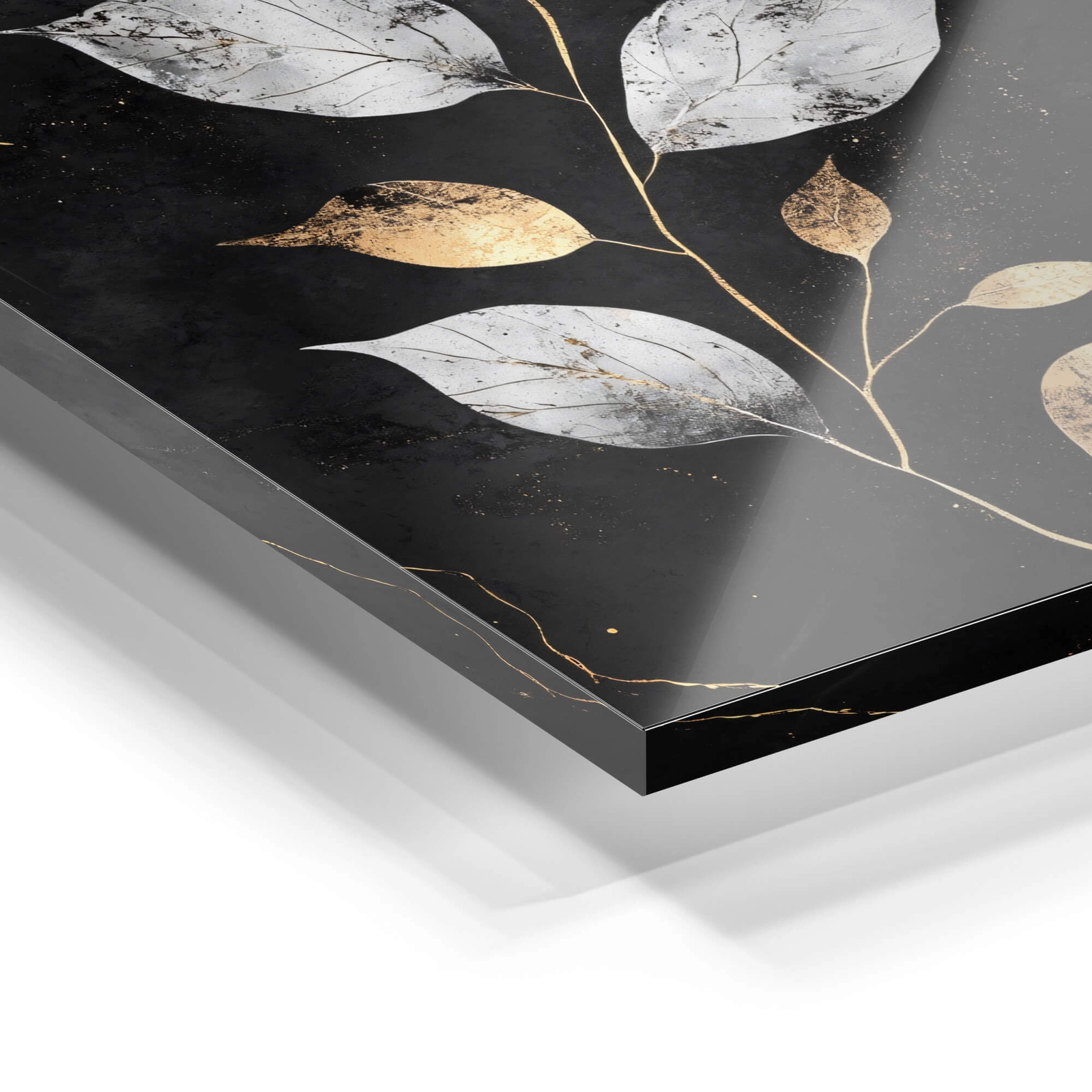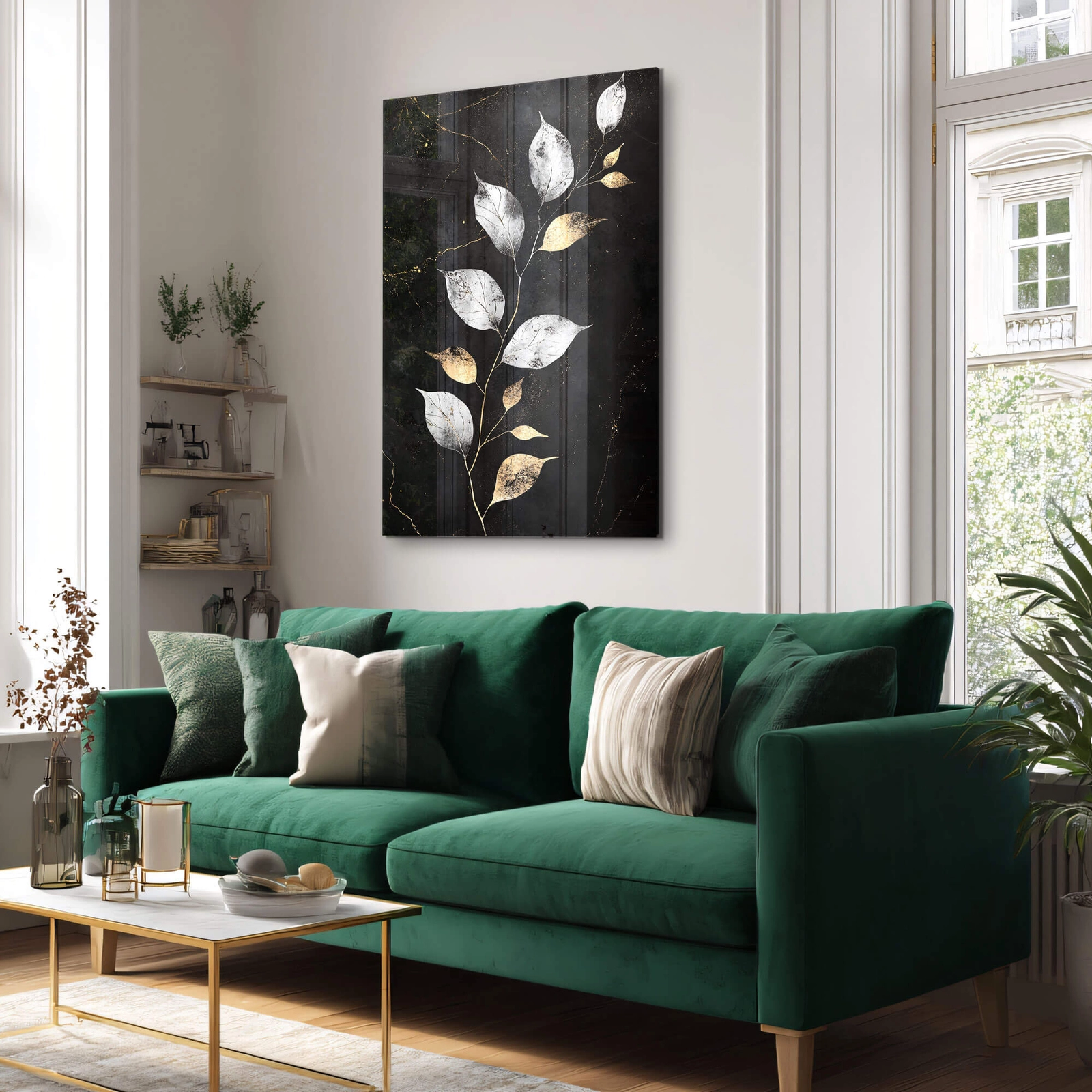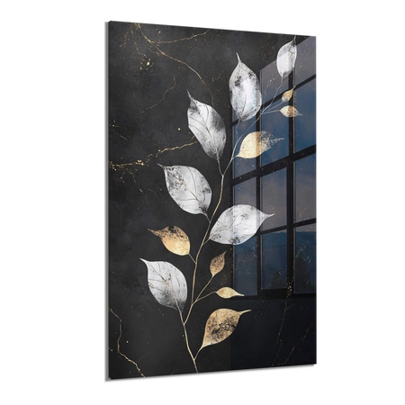 - Obraz na szkle akrylowym „Złoto i Natura” to elegancka dekoracja, łącząca nowoczesny minimalizm z motywem roślinnym. Metaliczne liście w odcieniach srebra i złota kontrastują z ciemnym, marmurowym tłem, tworząc efekt głębi i luksusu.