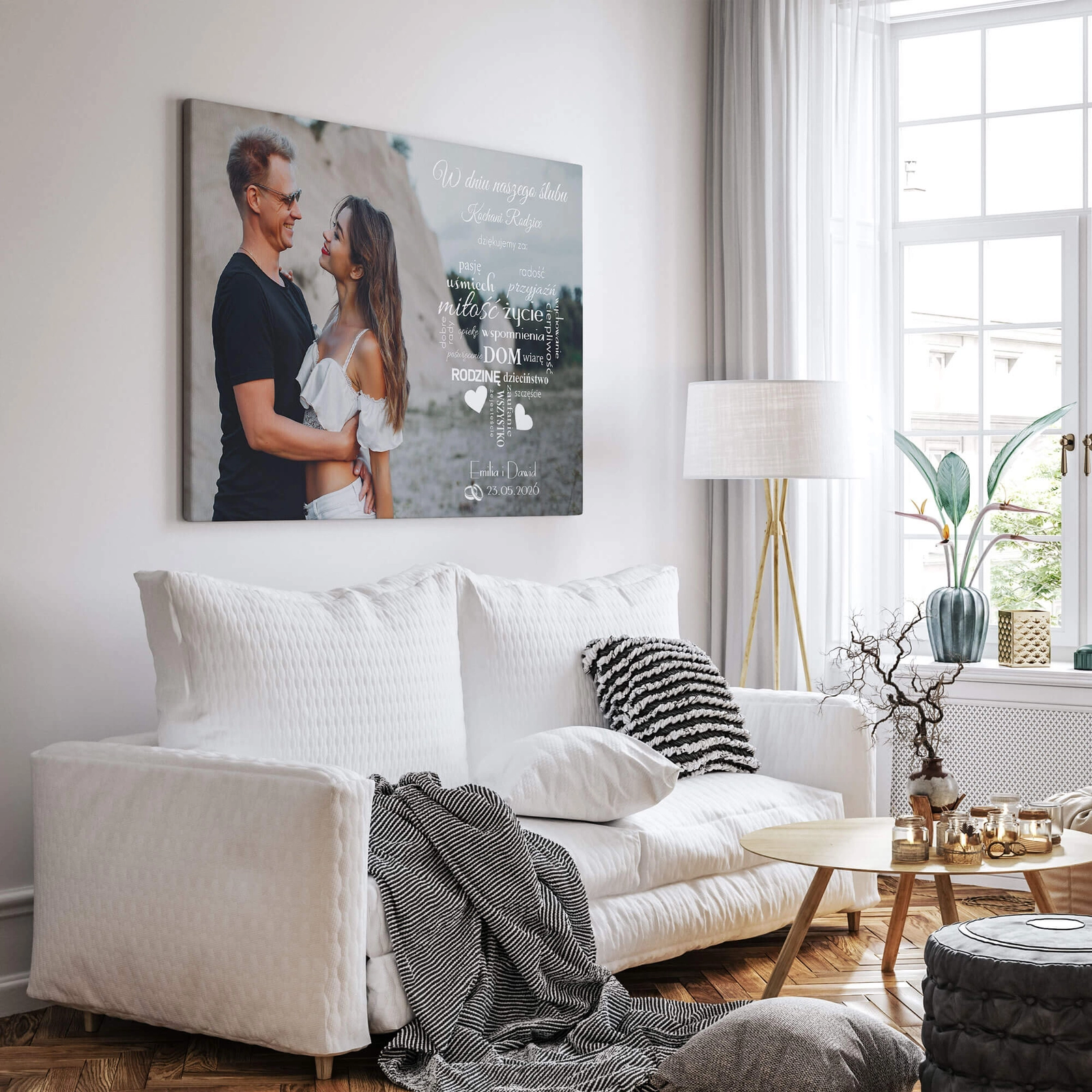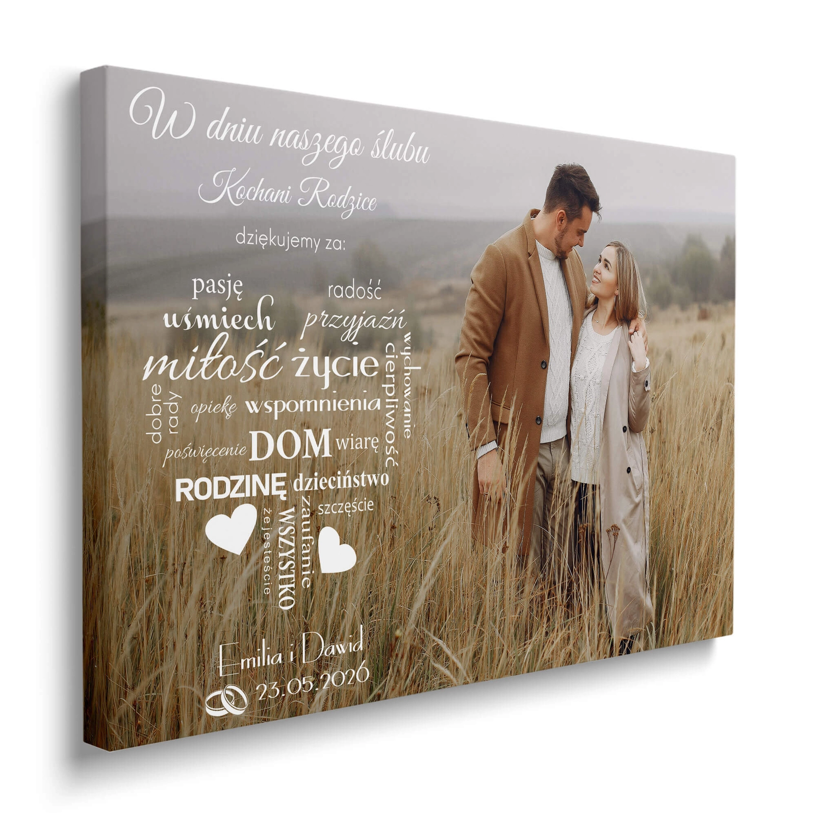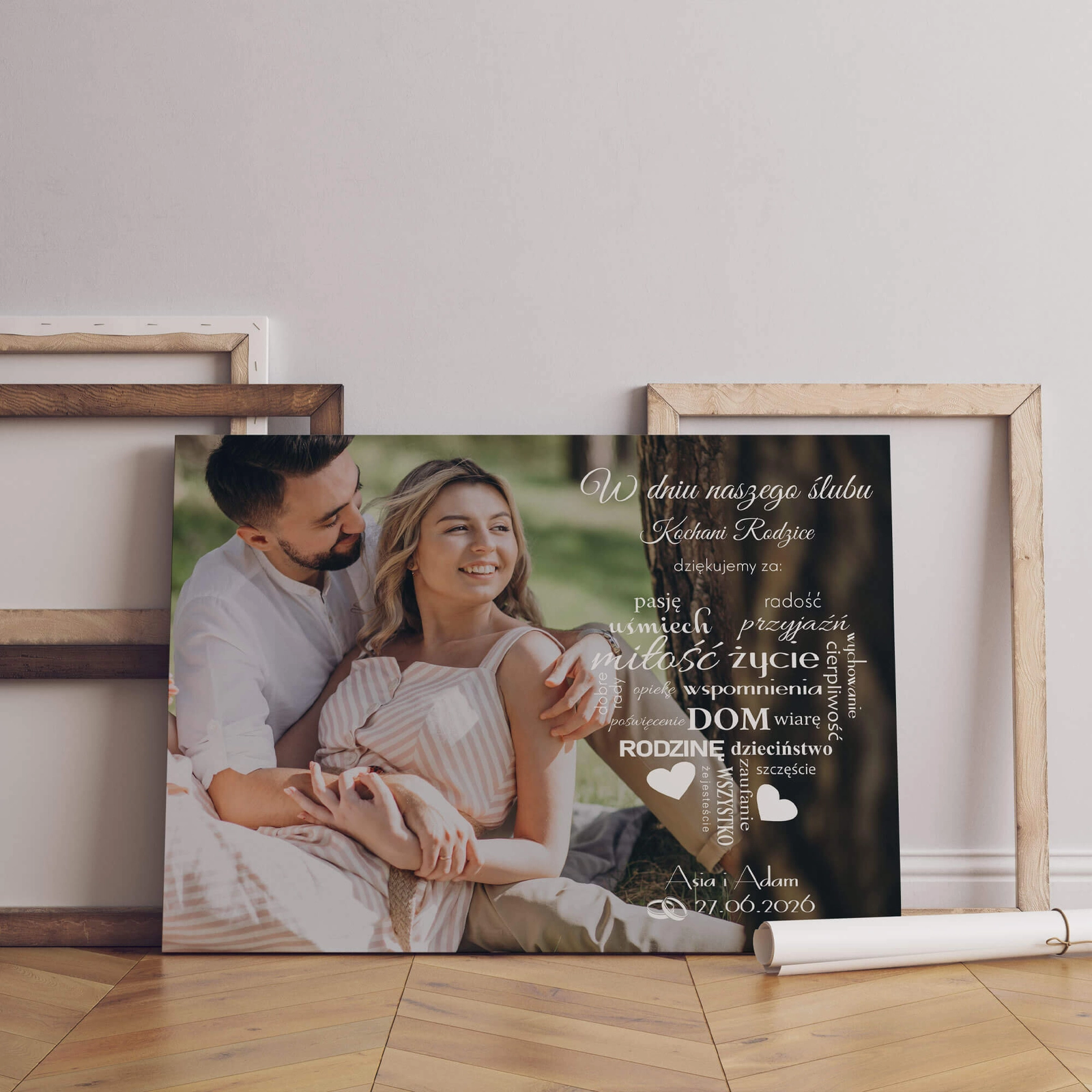 - Podziękowanie dla rodziców w formie obrazu na płótnie z wybranym zdjęciem pary młodej i dedykacją. Przeznaczone do wręczenia w dniu ślubu jako osobista forma wyrażenia wdzięczności za relację, wsparcie i wspólną drogę.