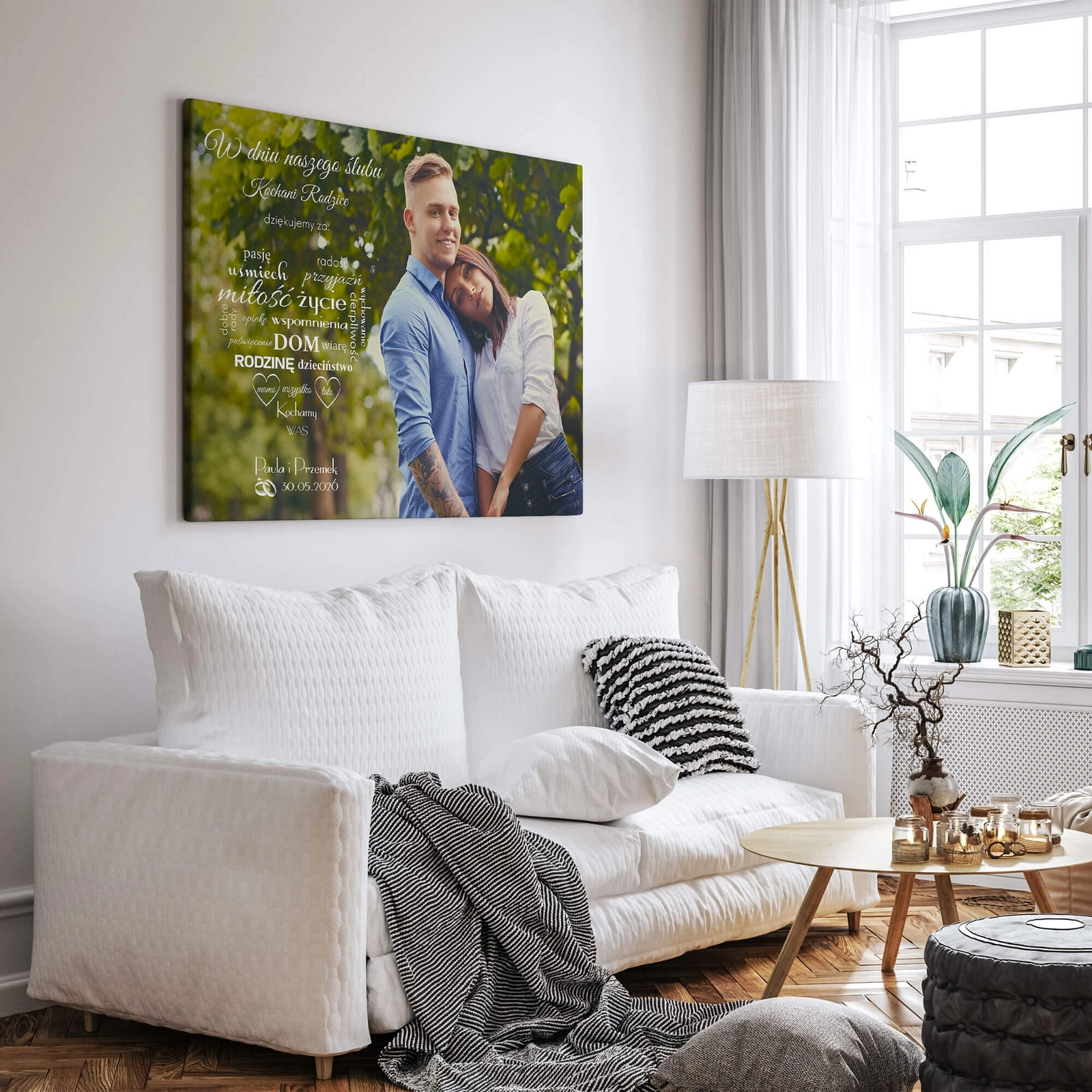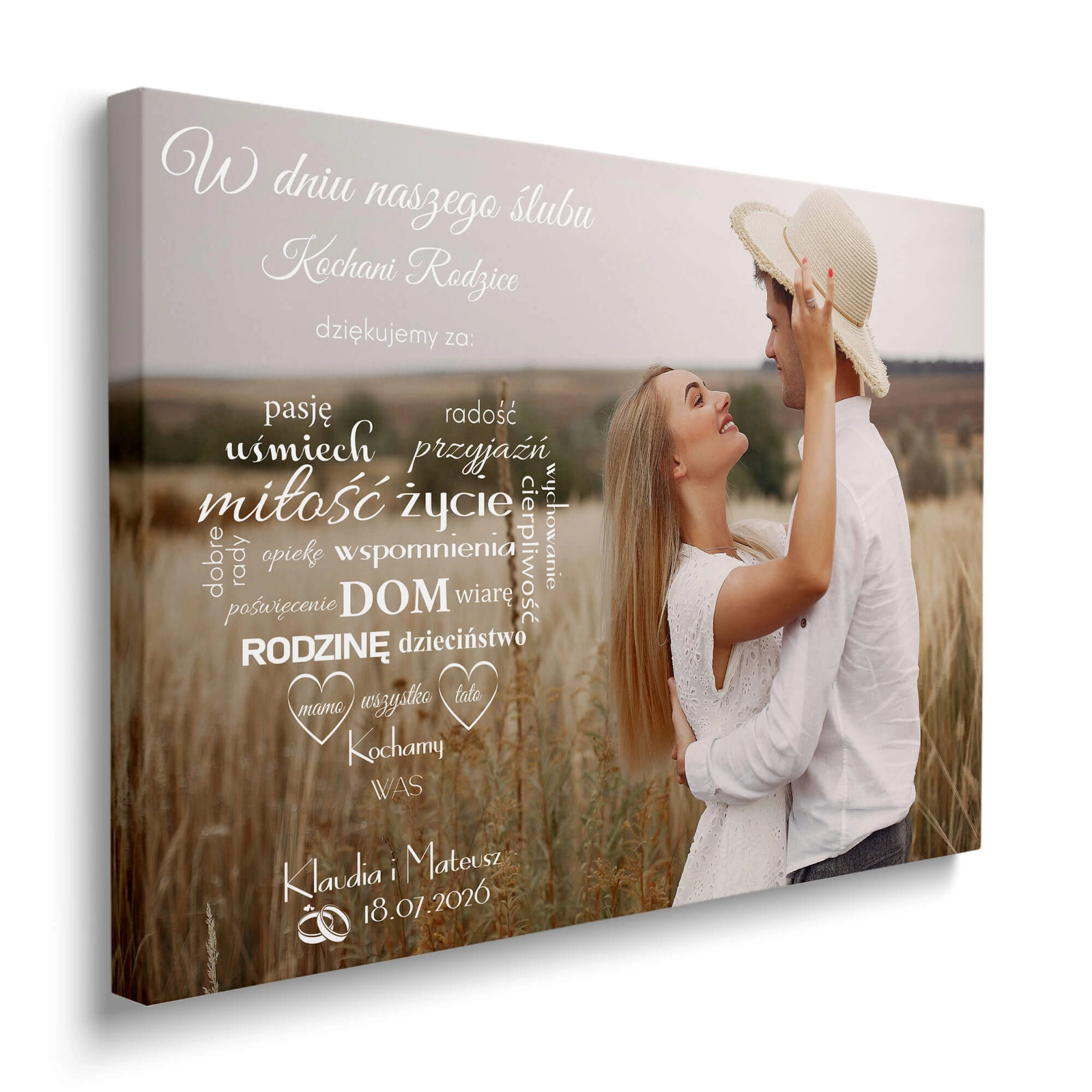 - Podziękowanie dla rodziców w formie obrazu na płótnie z wybranym zdjęciem pary młodej i dedykacją. Przeznaczone do wręczenia w dniu ślubu jako osobista forma wyrażenia wdzięczności za relację, wsparcie i wspólną drogę.
