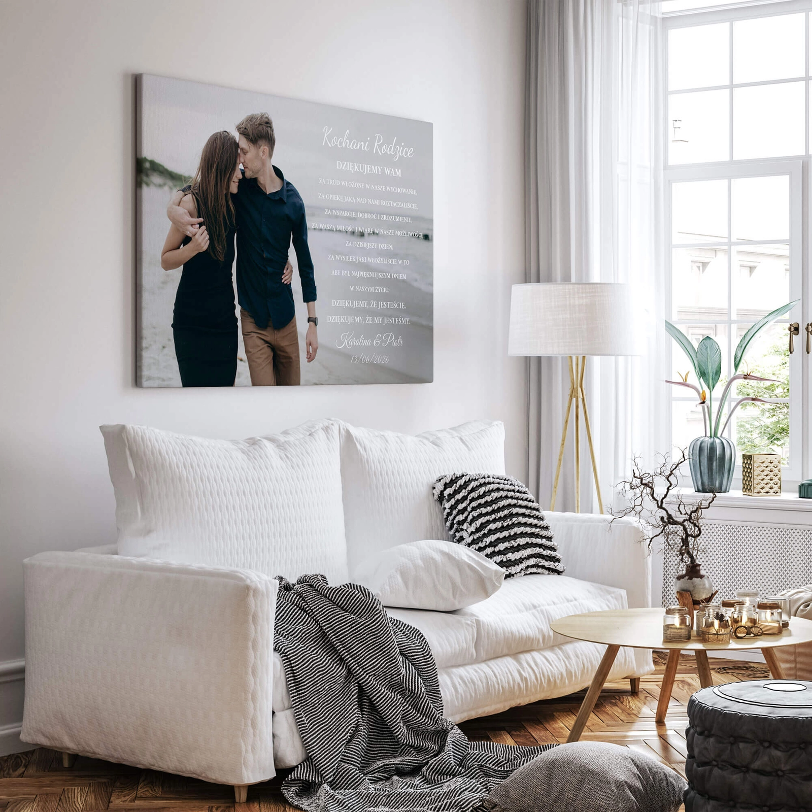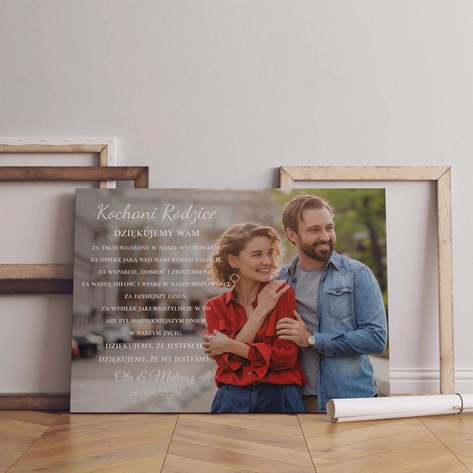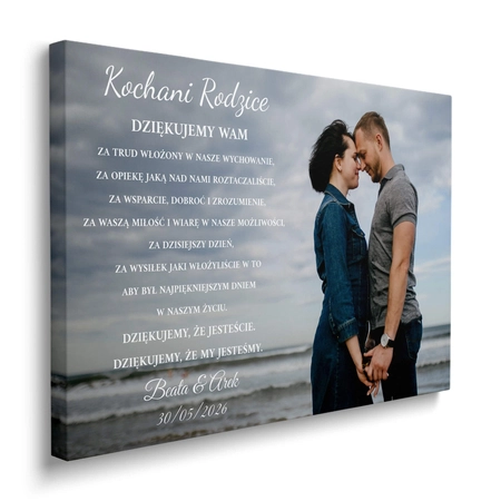 - Podziękowanie dla rodziców w formie obrazu na płótnie z wybranym zdjęciem pary młodej i dedykacją. Przeznaczone do wręczenia w dniu ślubu jako osobista forma wyrażenia wdzięczności za relację, wsparcie i wspólną drogę.