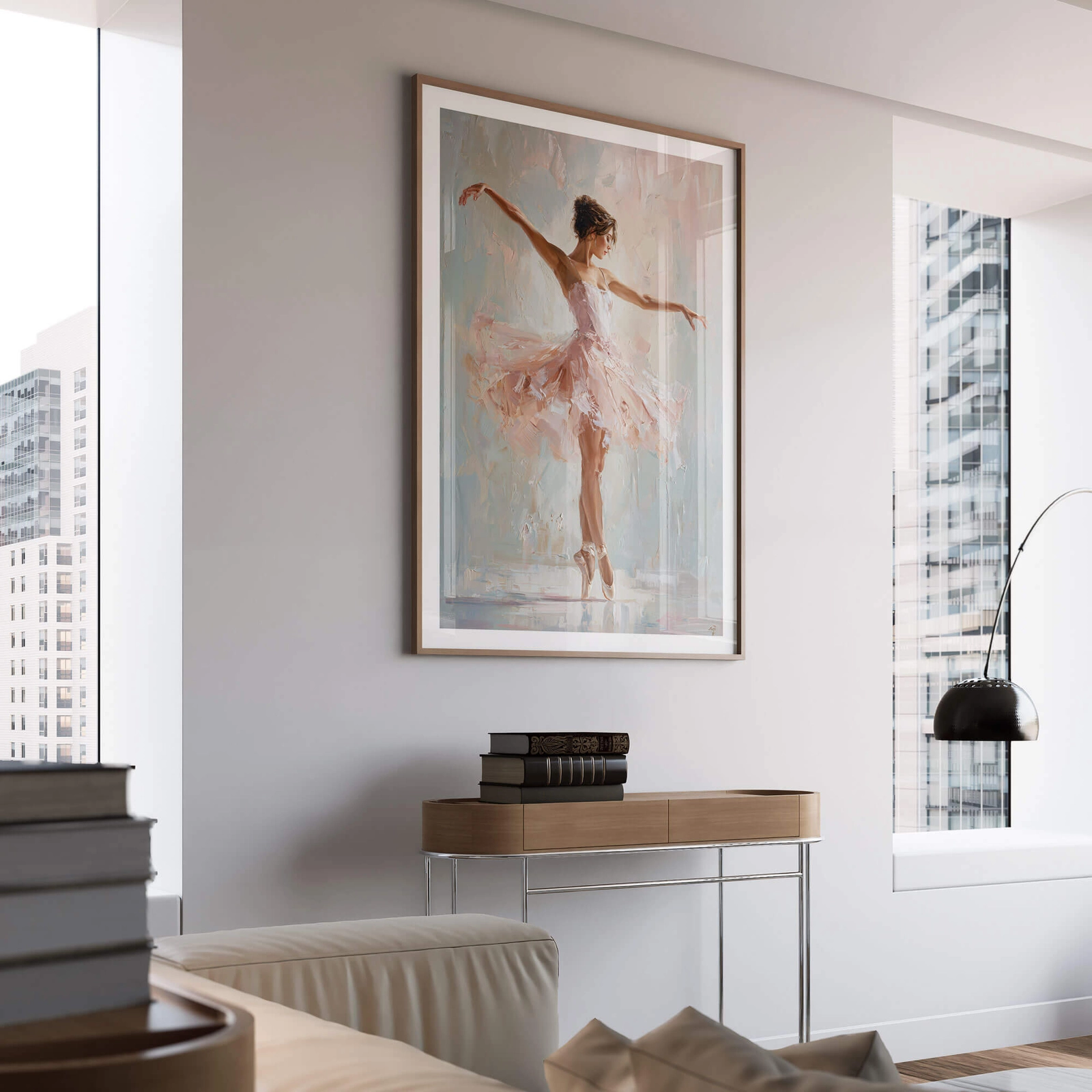 - "Plakat Baletnica W Różu" to niezwykle subtelna dekoracja, która łączy w sobie lekkość i elegancję sztuki baletu. Malarska faktura oraz pastelowe barwy nadają wnętrzu wyjątkowego klimatu, wprowadzając harmonię i spokój.