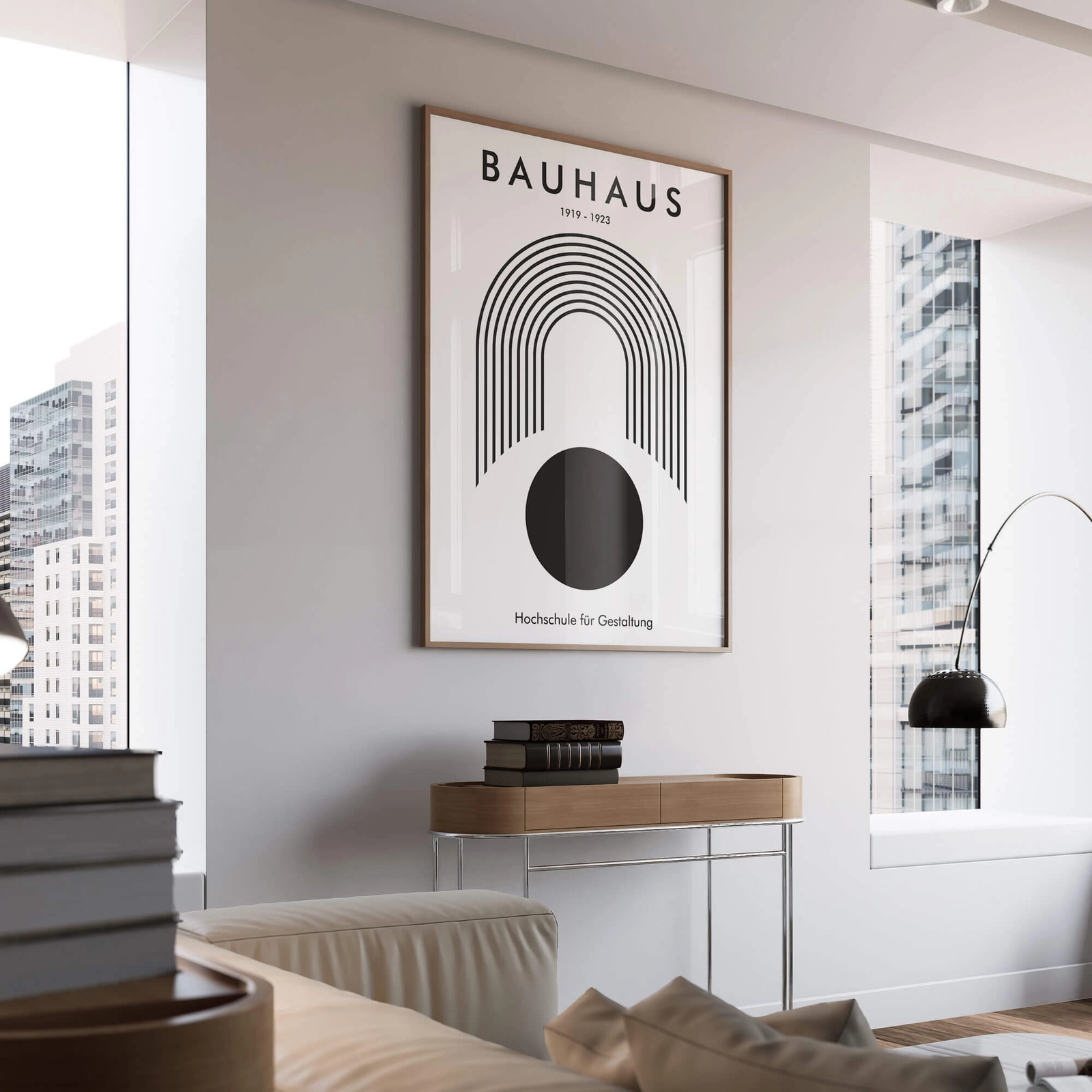 - Nowoczesny, czarno biały plakat inspirowany niemiecką szkołą Bauhaus. Grafika łączy minimalizm, geometrię i funkcjonalność. Kontrastujące kształty w czerni i bieli tworzą kompozycję, która zatrzymuje wzrok i nadaje przestrzeni nowoczesnego charakteru.