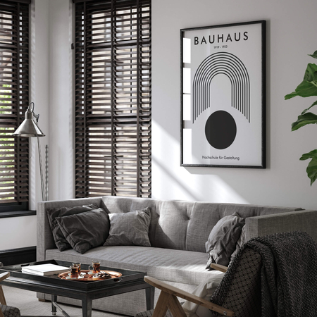- Nowoczesny, czarno biały plakat inspirowany niemiecką szkołą Bauhaus. Grafika łączy minimalizm, geometrię i funkcjonalność. Kontrastujące kształty w czerni i bieli tworzą kompozycję, która zatrzymuje wzrok i nadaje przestrzeni nowoczesnego charakteru.