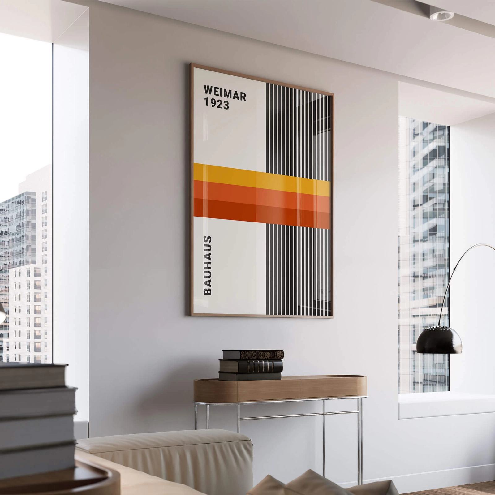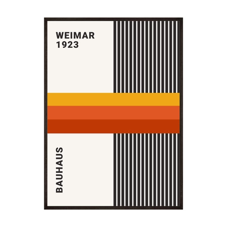 - Plakat Bauhaus Art to połączenie geometrycznej prostoty i nowoczesnej elegancji. Ciepłe odcienie pomarańczu i beżu kontrastują z czernią, tworząc wyrazistą, harmonijną kompozycję. Idealny do wnętrz w stylu modern, scandi lub retro.
