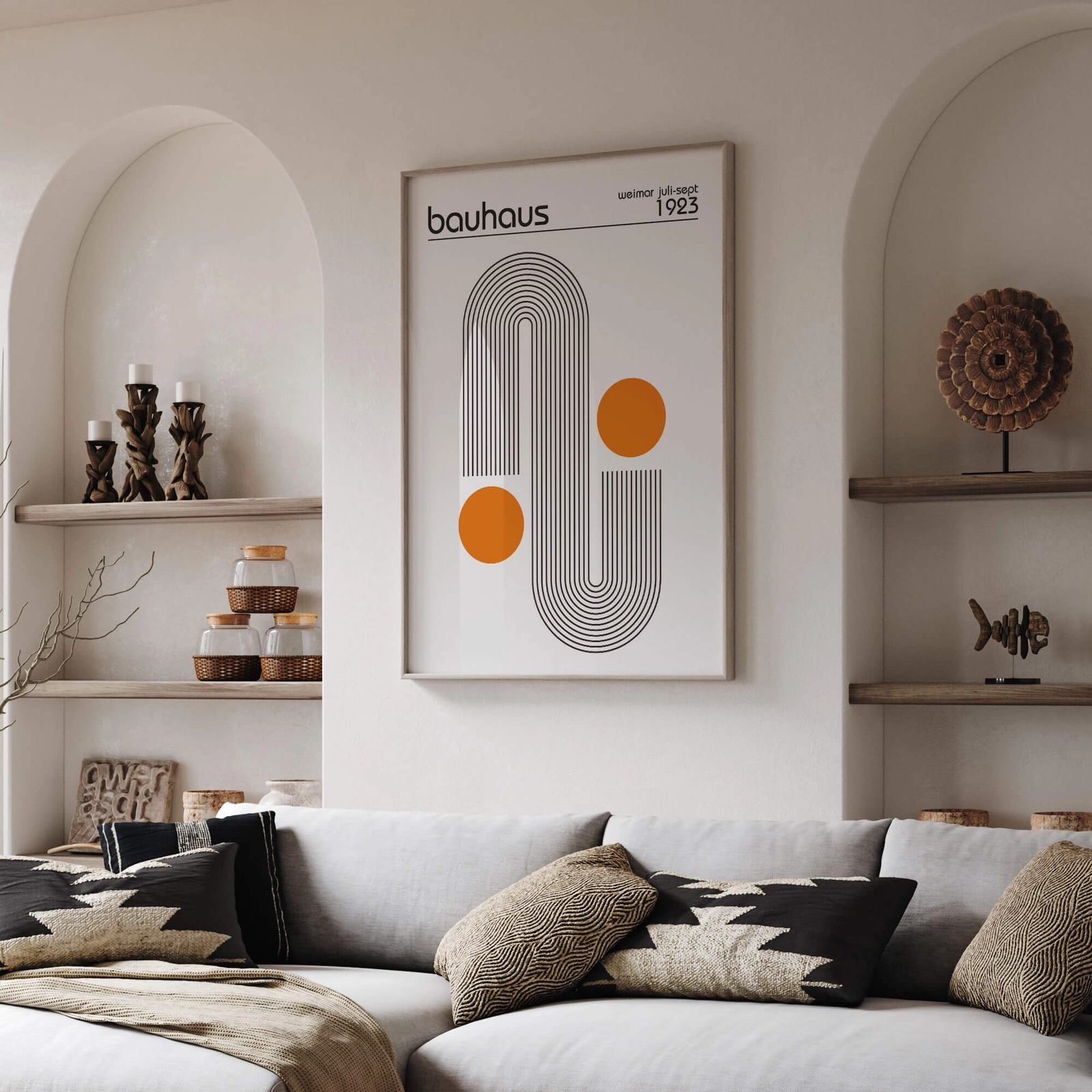 - Zanurz się w świecie ponadczasowego designu. Plakat bauhaus to geometryczna kompozycja, czyste linie i kontrast pomiędzy czernią a pomarańczem. To harmonijna całość, która idealnie oddaje ducha modernizmu i filozofii Bauhausu, czyli prostotę i piękno.