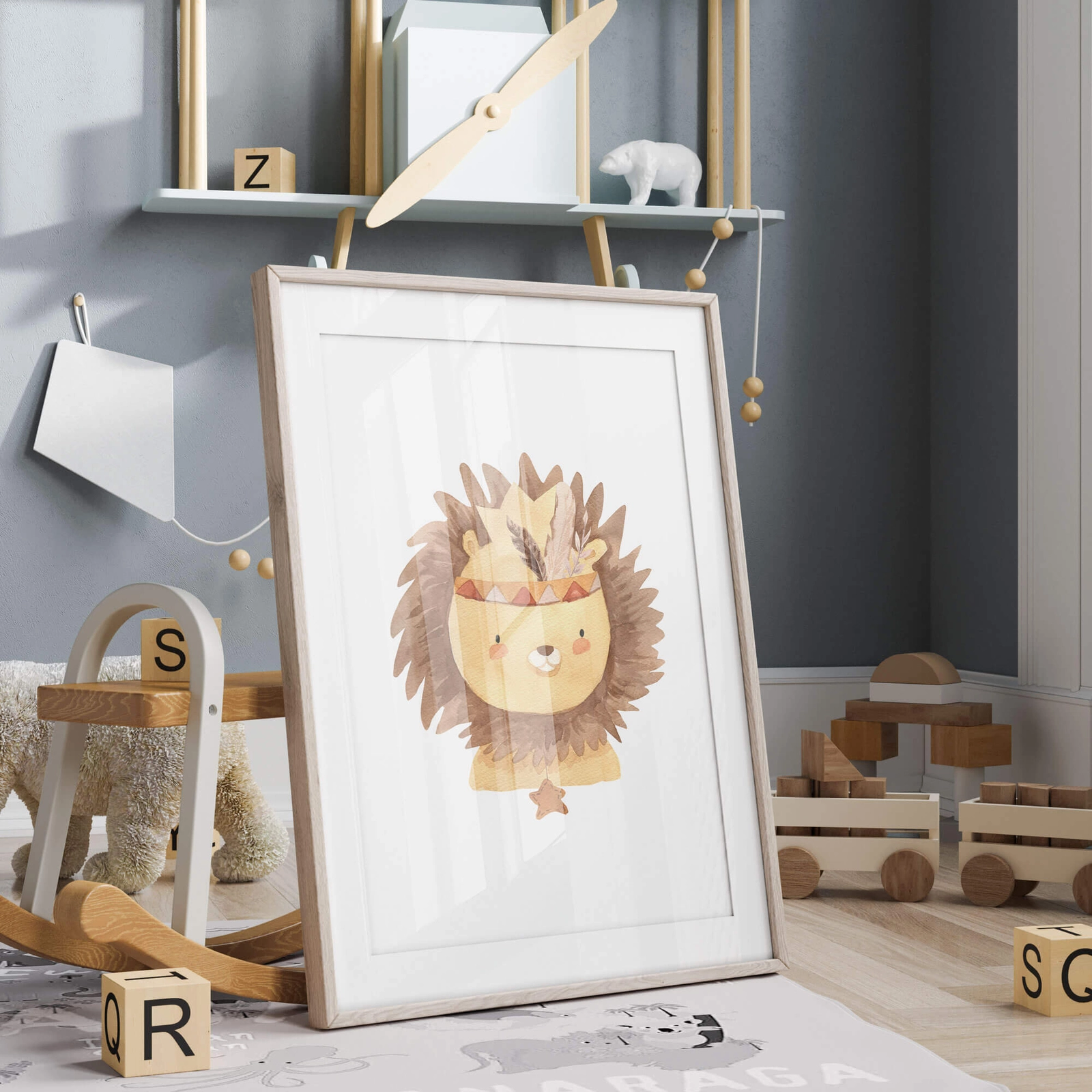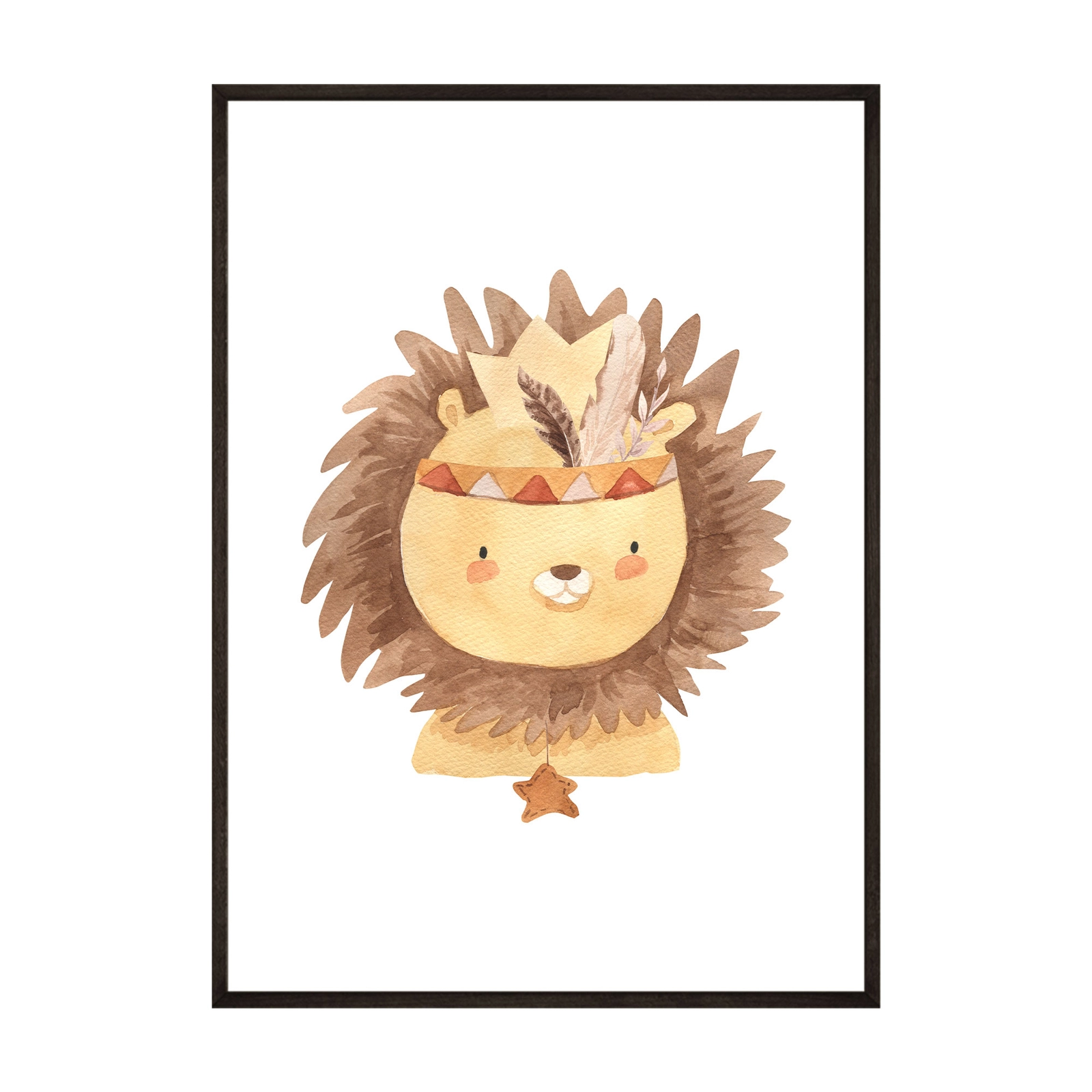 - Uroczy plakat dla dzieci w stylu boho z lwem w roli głównej. Zachowany w barwach inspirowanych naturą będzie wspaniale wyglądał na ścianie w pokoju dziecka. Całość wygląda tak jakby plakat był namalowany akwarelami.