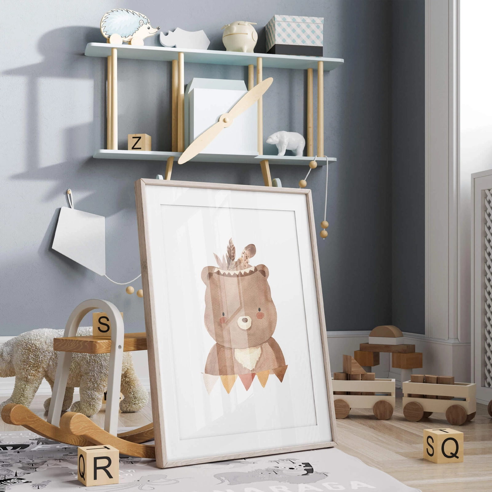 - Uroczy plakat dla dzieci w stylu boho z niedźwiadkiem w roli głównej. Zachowany w barwach inspirowanych naturą będzie wspaniale wyglądał na ścianie w pokoju dziecka. Całość wygląda tak jakby plakat był namalowany akwarelami.