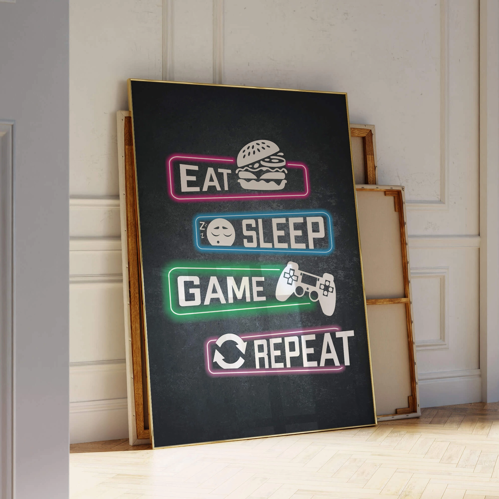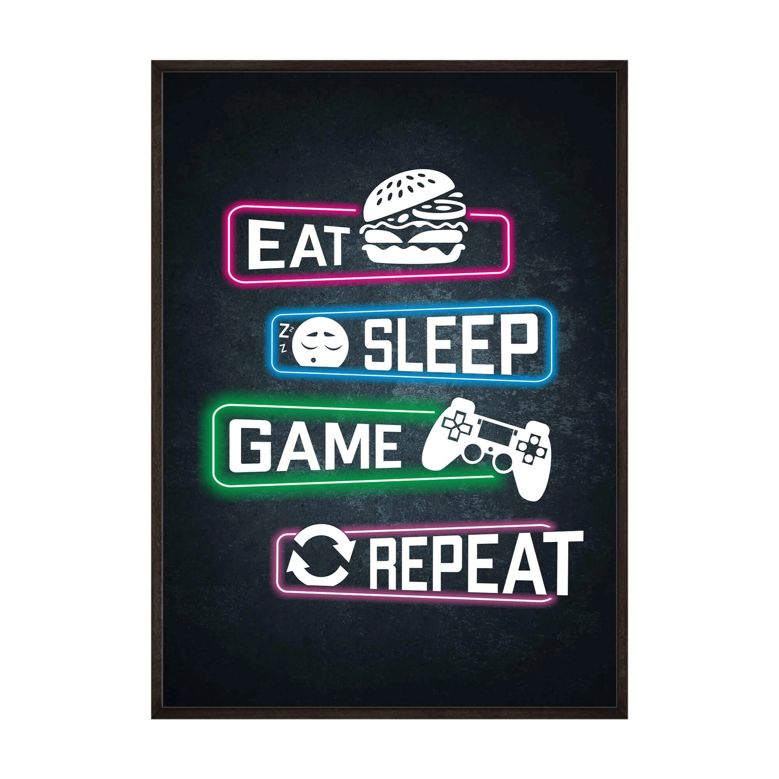 - Plakat "Eat Sleep Game Repeat" to stylowy, neonowy plakat dla prawdziwych gamerów. Energetyczne kolory i kultowe hasło tworzą idealną dekorację do pokoju gracza. Dodaj charakteru swojej przestrzeni i pokaż, czym żyjesz – Eat. Sleep. Game. Repeat.