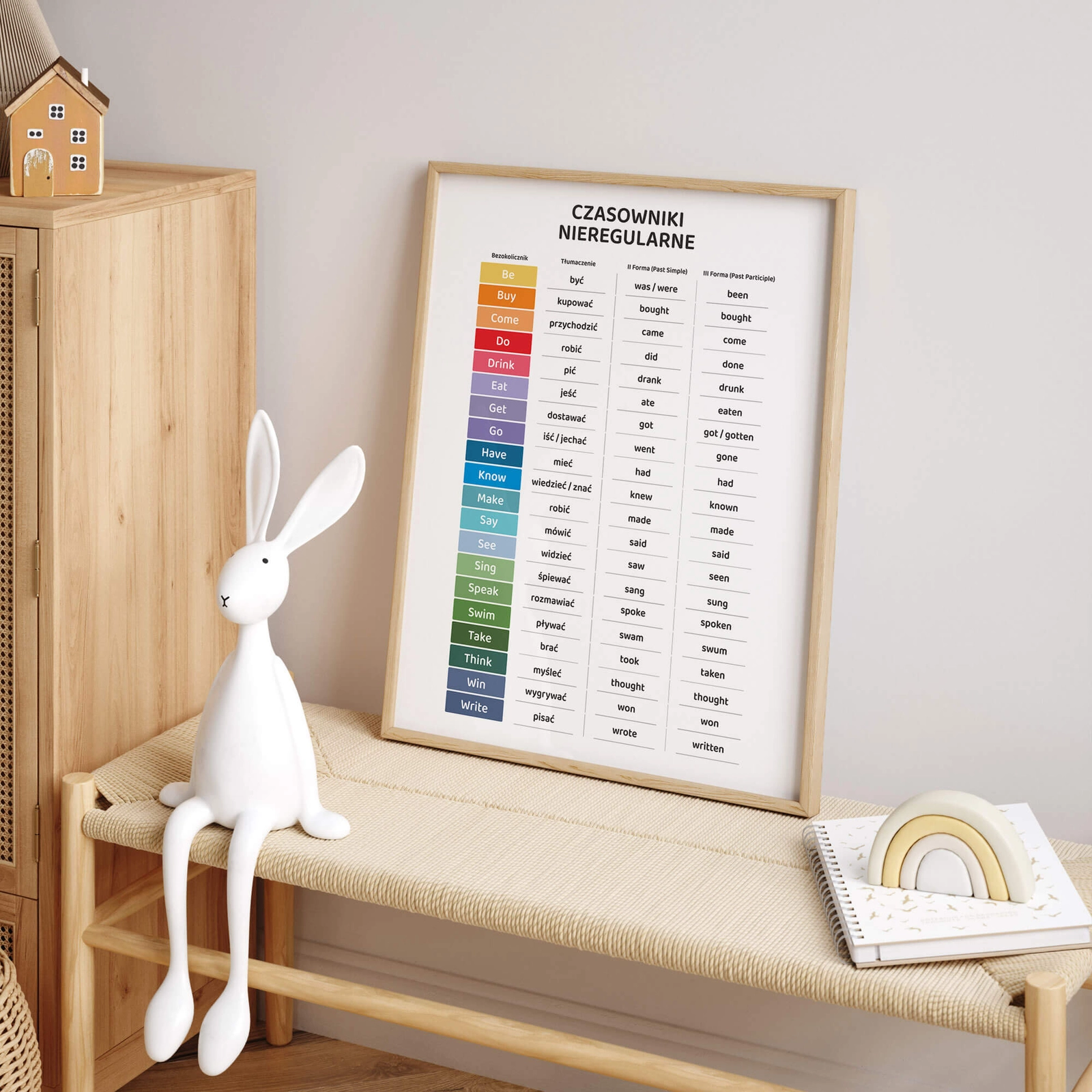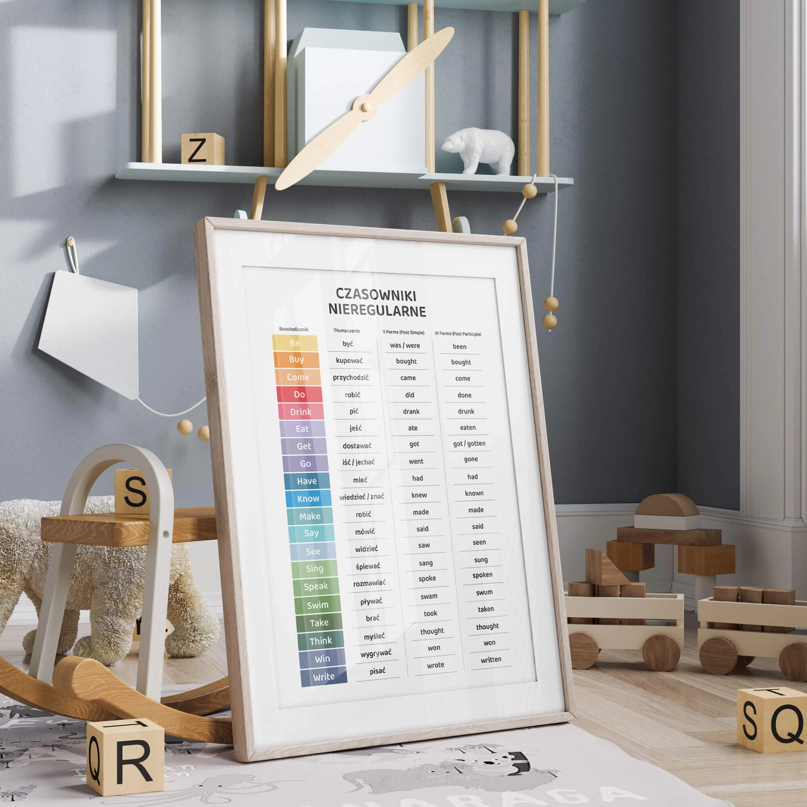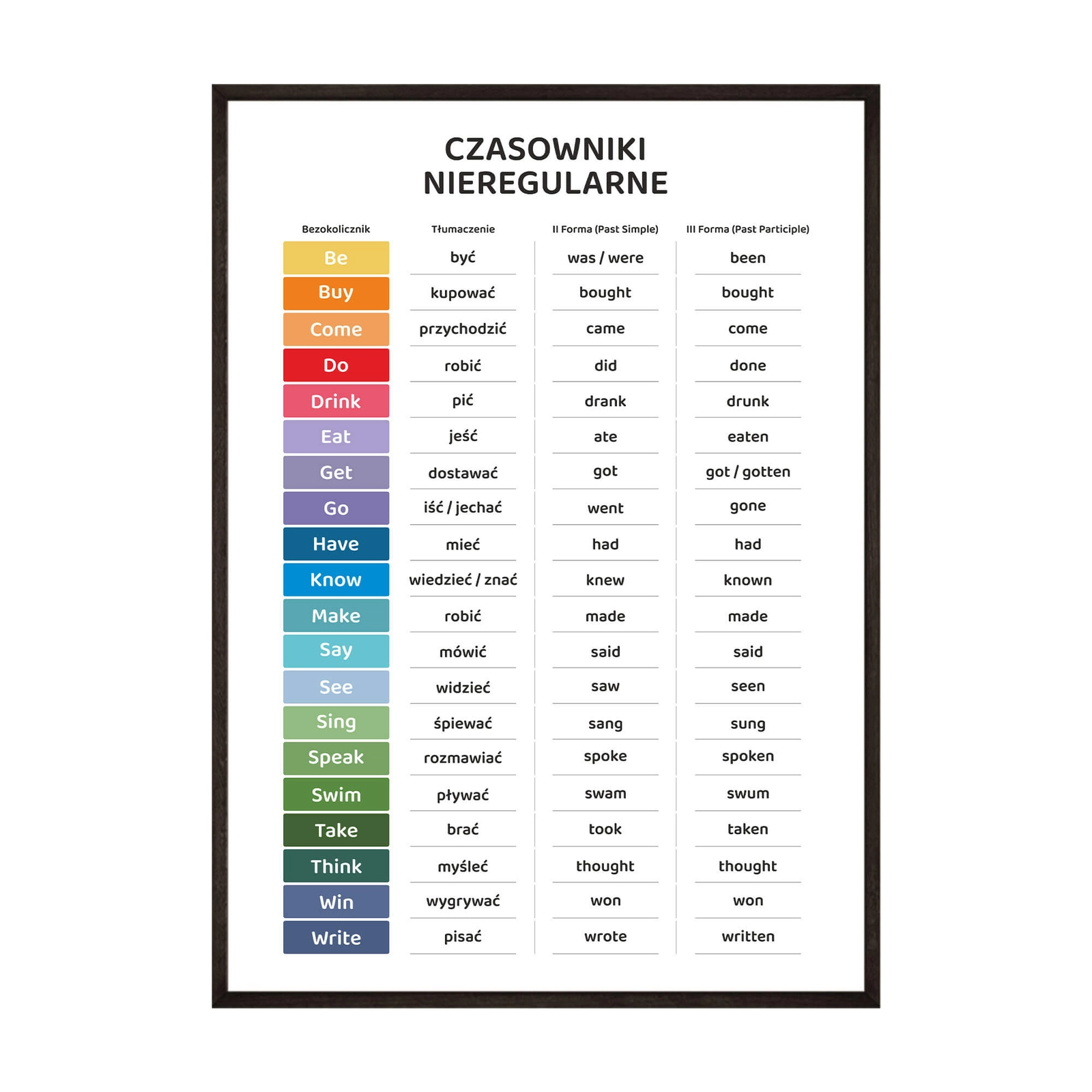- Plakat edukacyjny – Czasowniki Nieregularne to praktyczna pomoc w nauce języka angielskiego. Zawiera najbardziej popularne czasowniki nieregularne, które są niezbędne w codziennej komunikacji. Przejrzysty układ sprawia, że nauka stanie się przyjemnością.