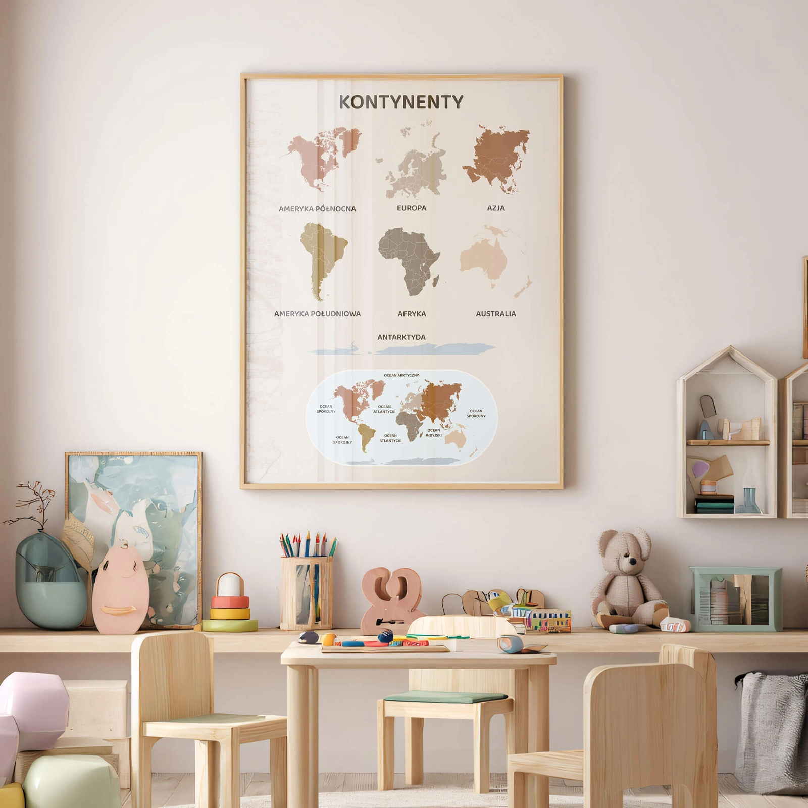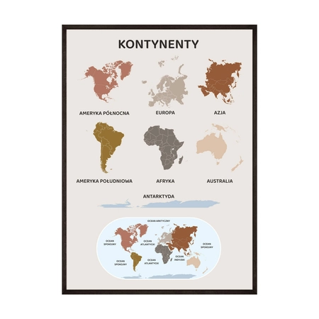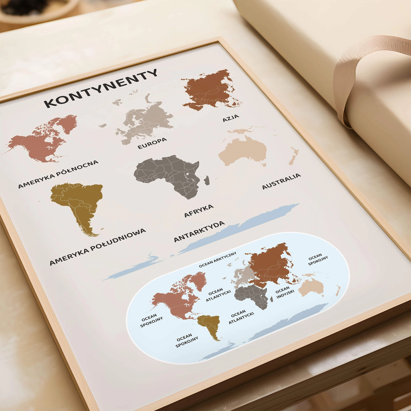 - Odkryj świat z bliska! Plakat Edukacyjny Mapa Kontynentów pokazuje siedem kontynentów oraz oceany w atrakcyjnej graficznej formie, ułatwiając zapamiętywanie i rozwijając zainteresowania geograficzne. To idealne połączenie nauki i dekoracji.