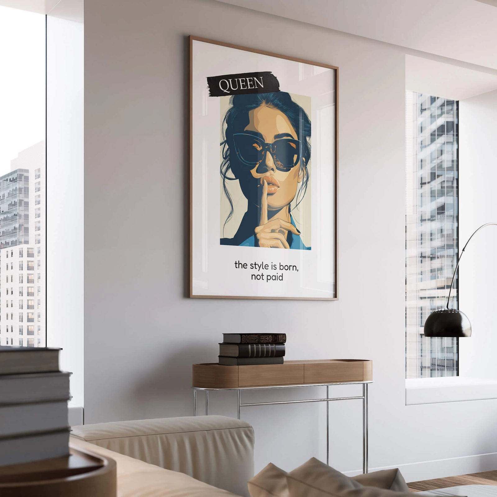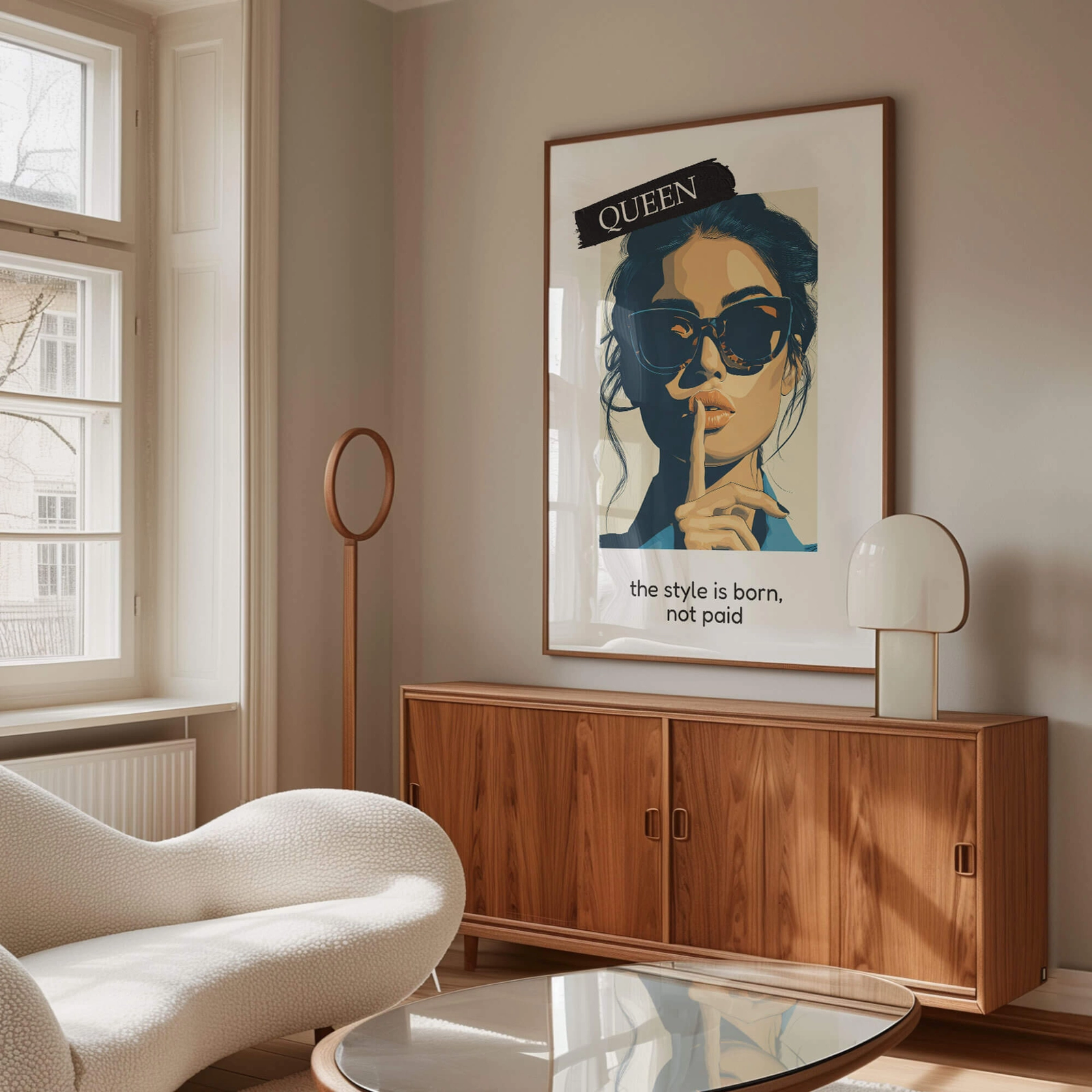 - Nowoczesna ilustracja z kobiecym portretem i typografią, oparta na kontrastach i prostym układzie. Sprawdza się jako wyrazisty element ścienny w nowoczesnych wnętrzach, garderobach i biurach, gdzie ważny jest spójny styl i forma.