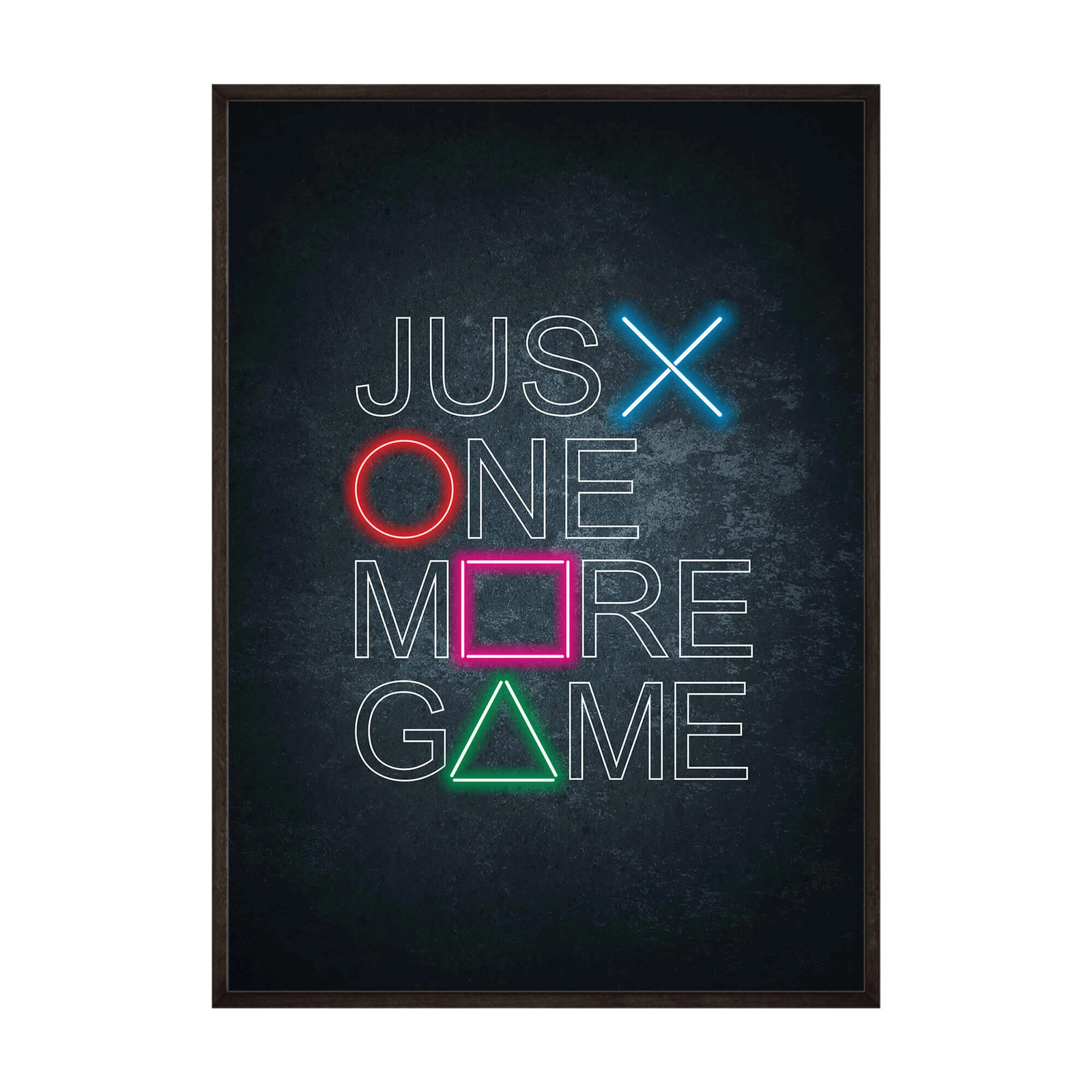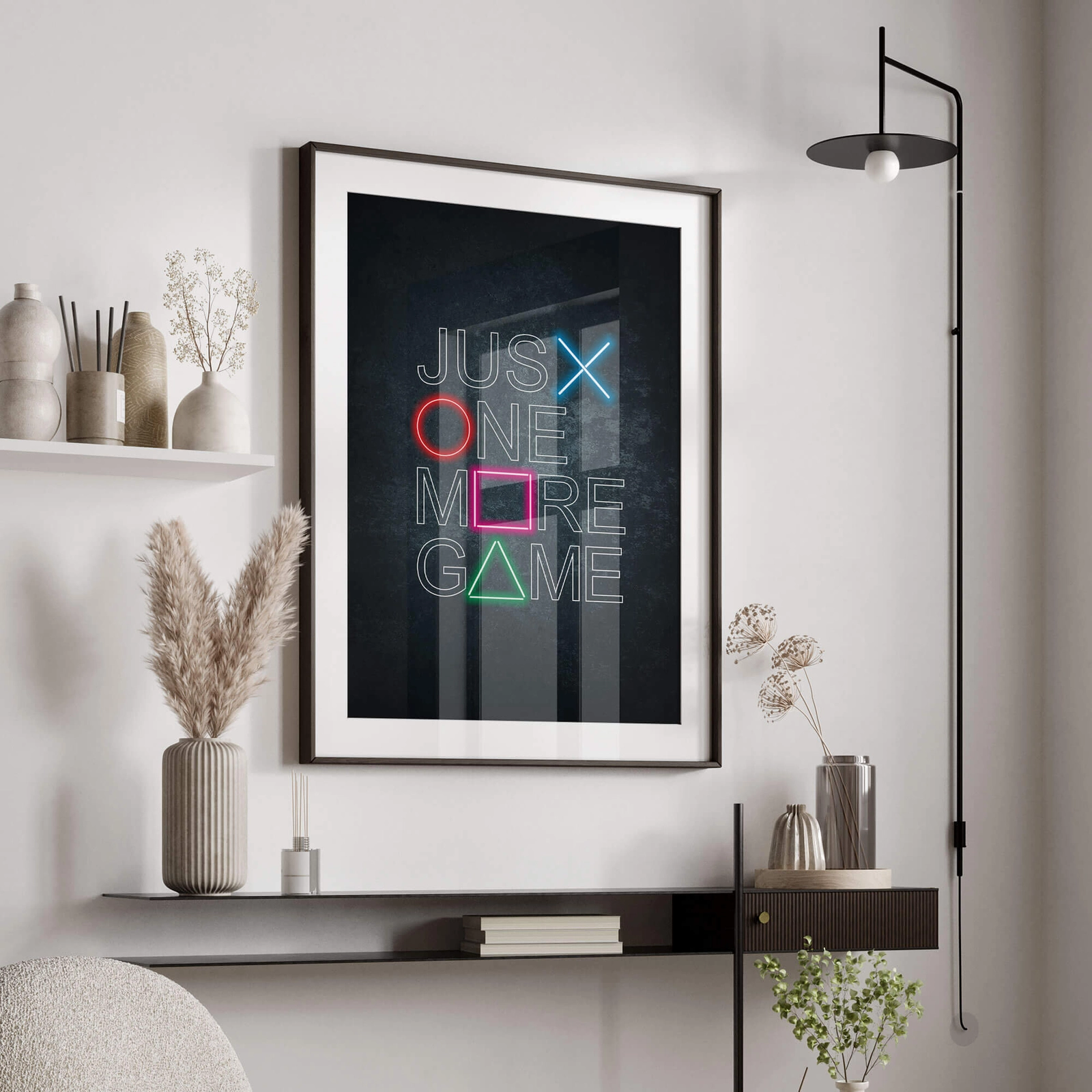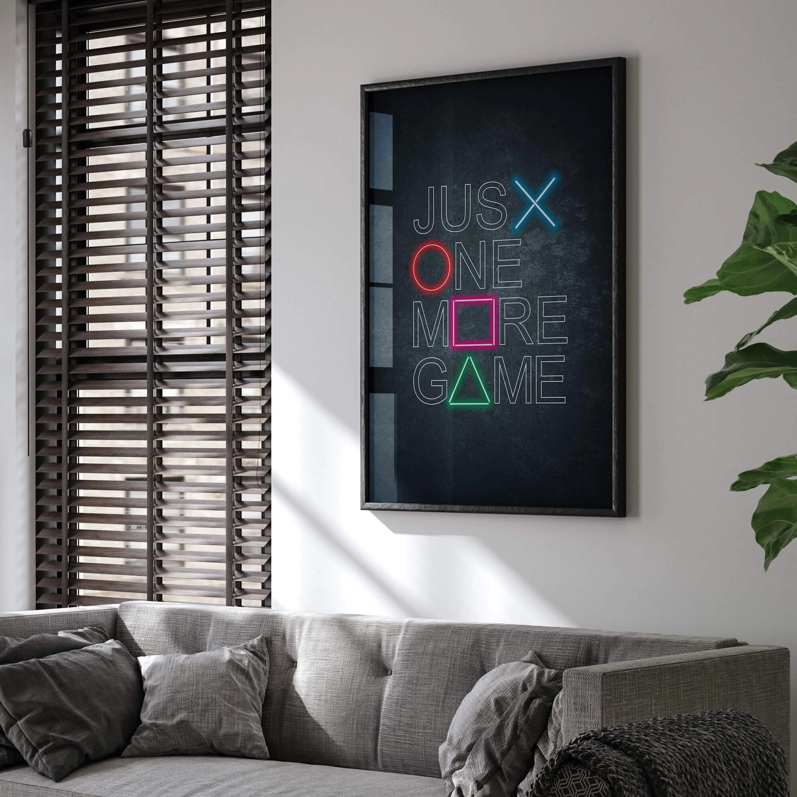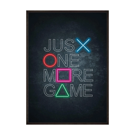 - Plakat "Just One More Game" to nowoczesna grafika dla każdego pasjonata gier. Minimalistyczny desing oraz neonowe akcenty podkreślające przyciski pada sprawiają, że plakat idealnie wpasowuje się w wystrój pokoju gracza.