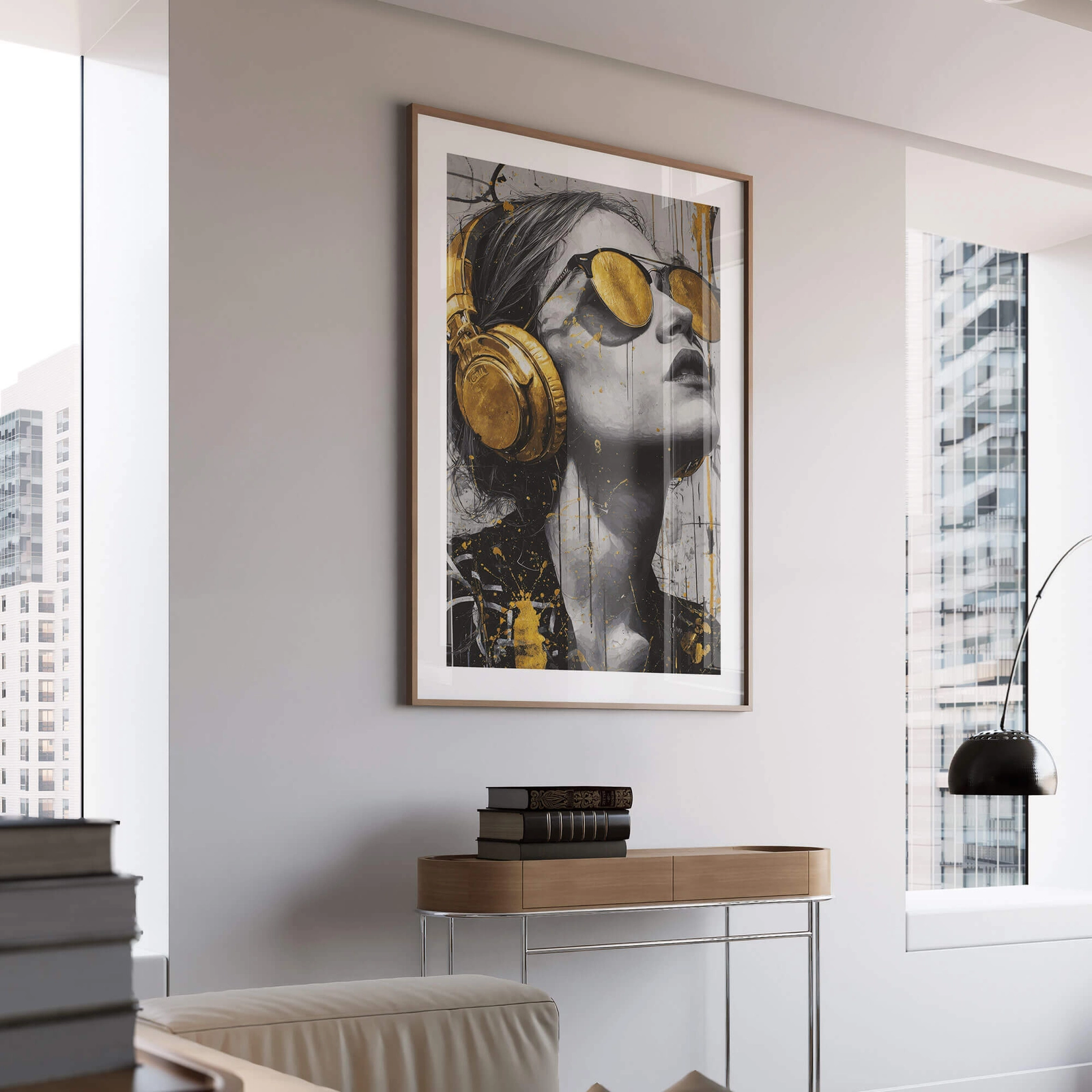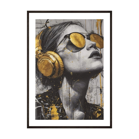 - Nowoczesny plakat z motywem kobiecej postaci w złotych słuchawkach. Stonowana kolorystyka z wyraźnymi, złotymi akcentami sprawdzi się w mieszkaniach, loftach i przestrzeniach kreatywnych jako uporządkowany, wyrazisty element ściany.