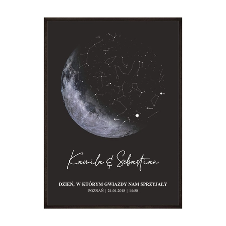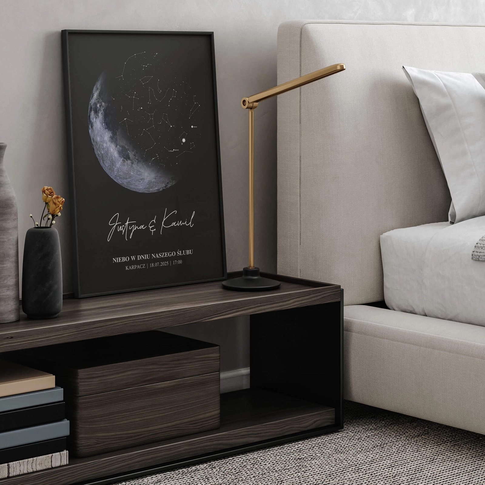 - Personalizowany plakat z mapą nieba przedstawia układ gwiazd dokładnie z wybranego miejsca i daty. Idealny na wyjątkowy prezent na każdą okazję. Minimalistyczny i pełen symboliki – uchwyci najważniejszy moment i zamieni go w piękną, trwałą pamiątkę.