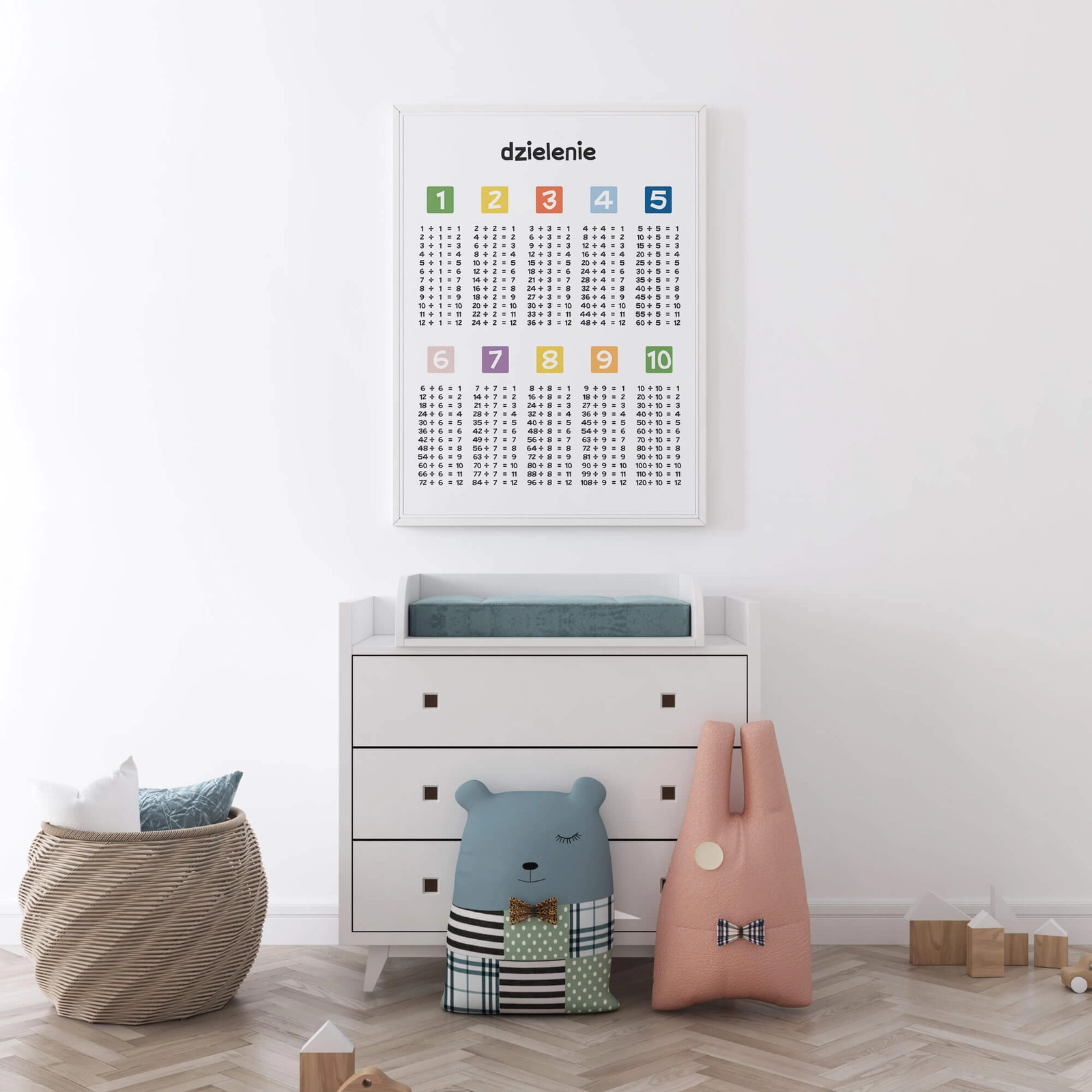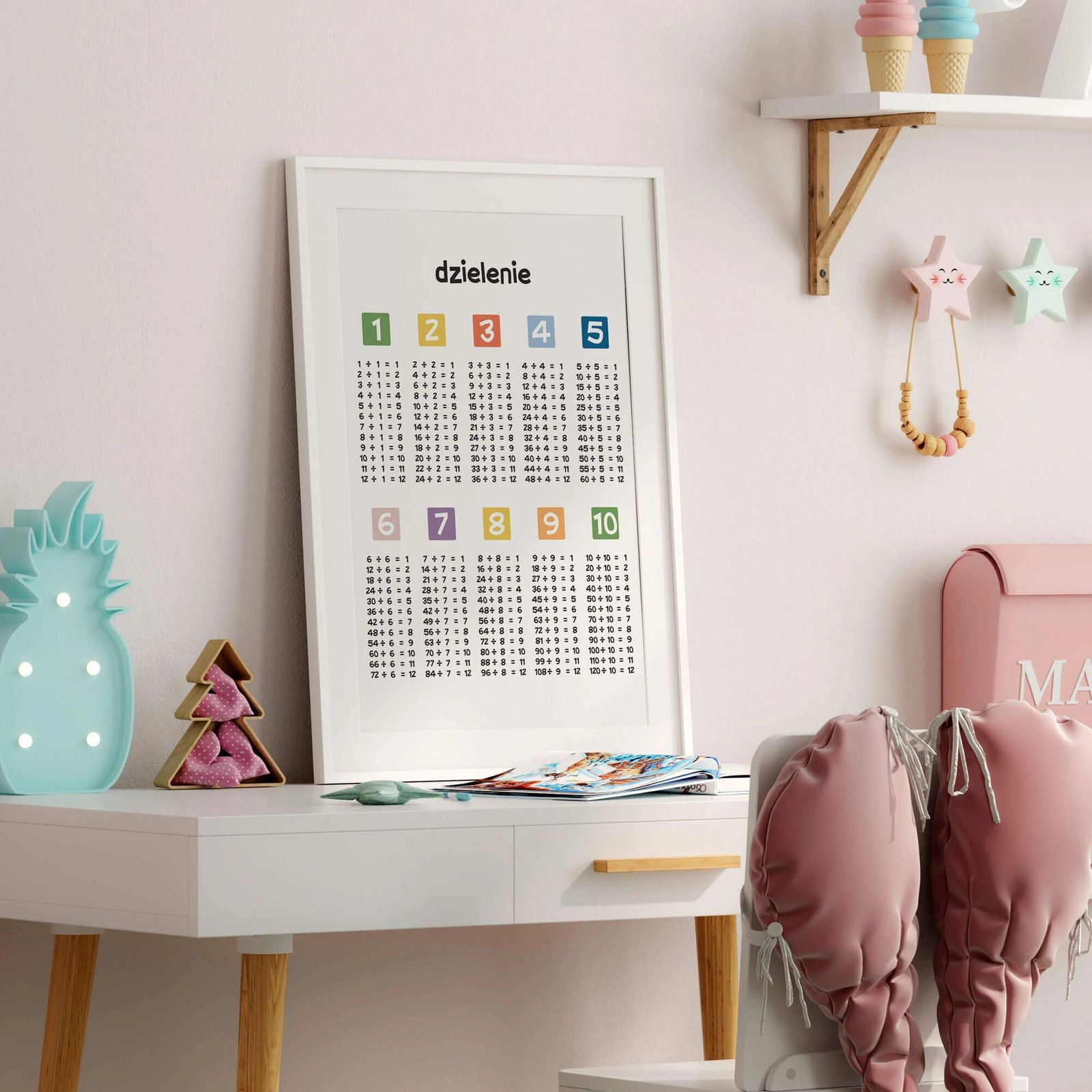 - Praktyczny i kolorowy plakat z działaniami dzielenia to świetna pomoc naukowa dla dzieci uczących się podstaw matematyki. Dzięki uporządkowanej formie i czytelnym przykładom ułatwia zrozumienie dzielenia oraz wspomaga codzienną naukę.