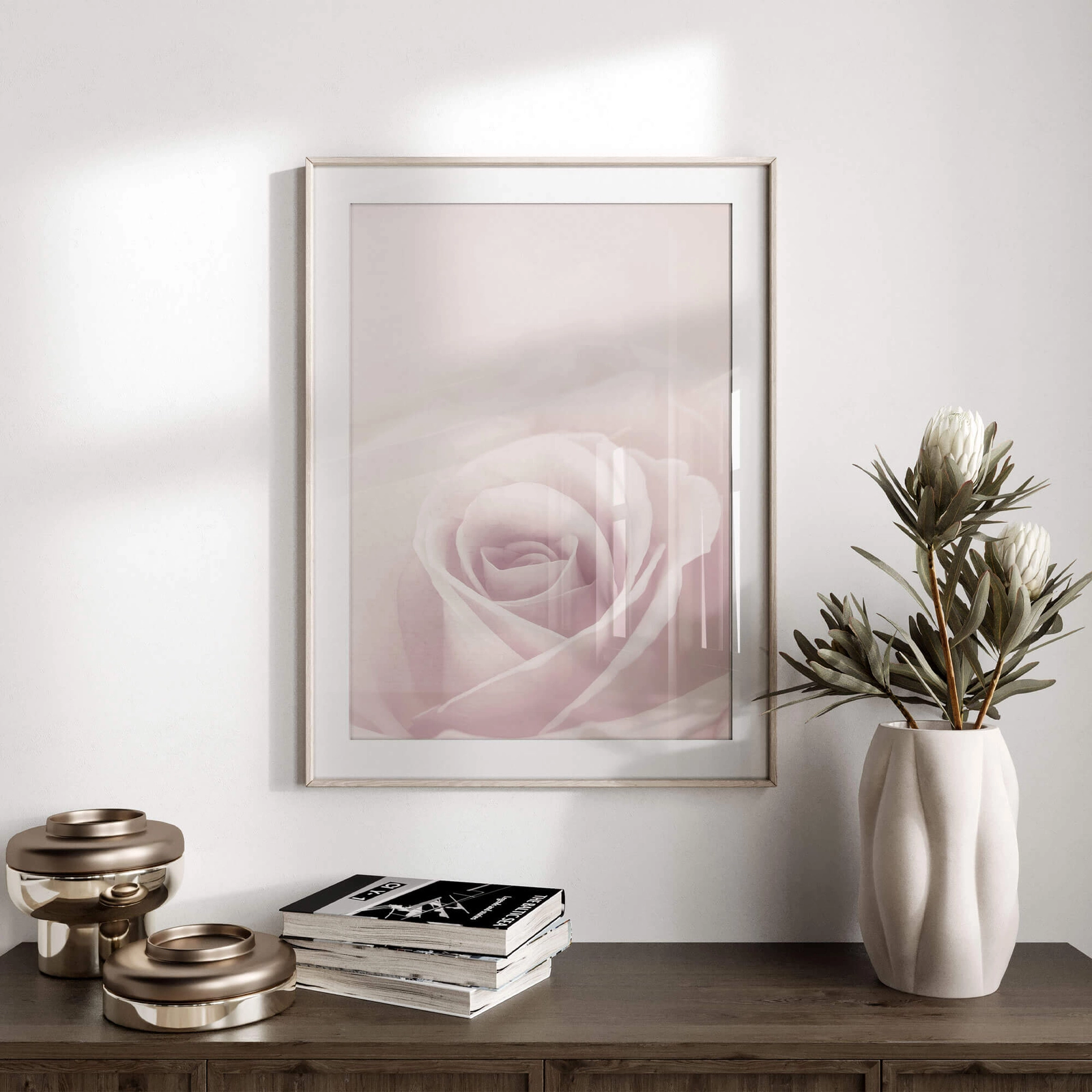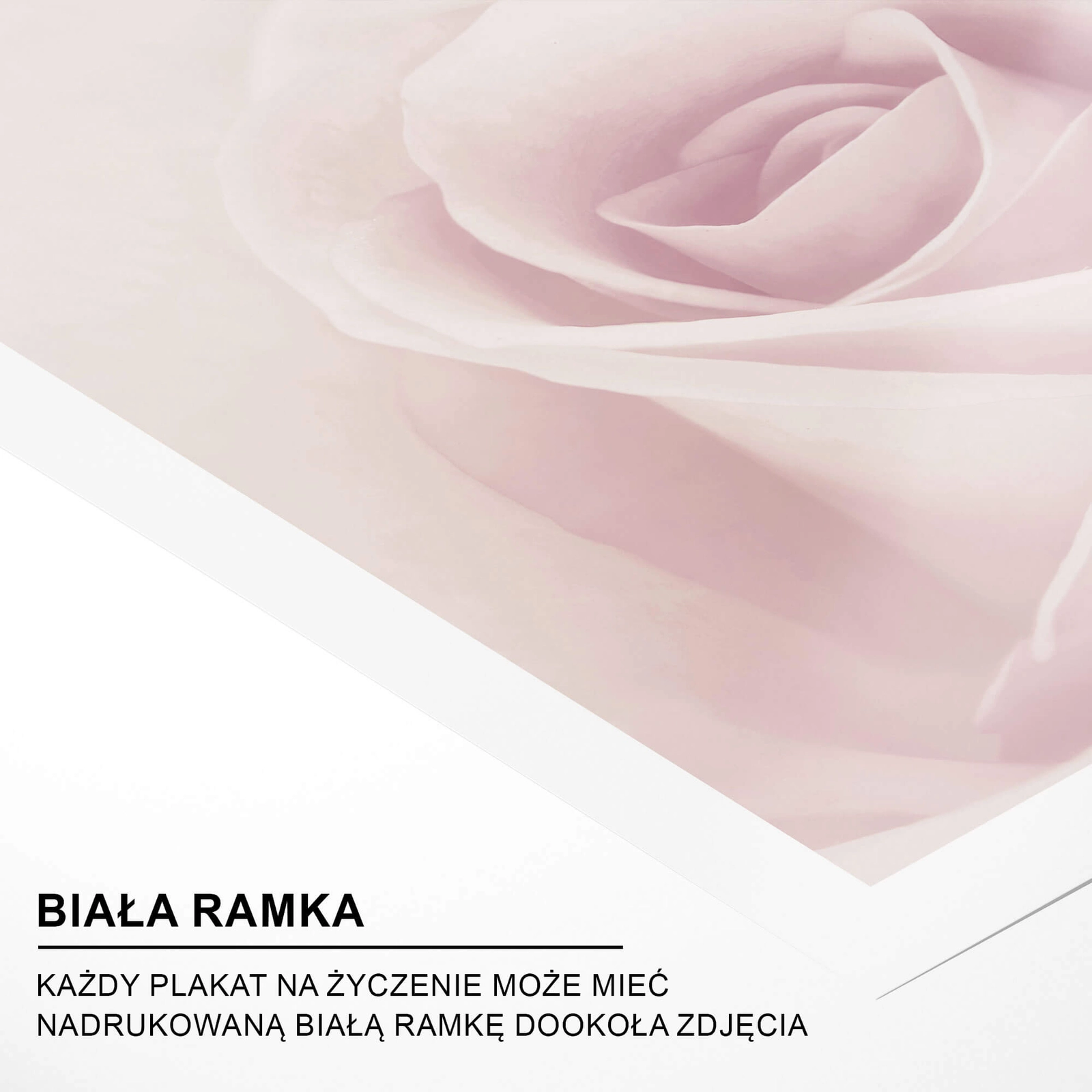 - Piękny plakat fotograficzny ukazujący kwiat róży w dużym zbliżeniu. Utrzymany w jasnych, pastelowych barwach na pewno doda Twojej galerii obrazów odrobinę romantyzmu oraz doskonale połączy się z innymi plakatami botanicznymi oraz typograficznymi.