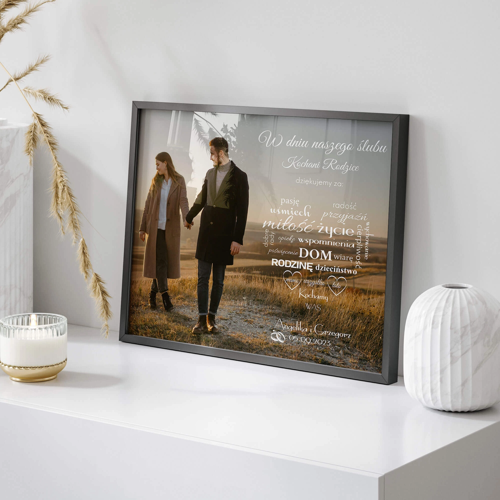 - Przepiękny, personalizowany plakat jako prezent dla rodziców z Waszym zdjęciem to nie tylko dekoracja. To bardzo osobista i wyjątkowa pamiątka na lata, która przypomni rodzicom ten wyjątkowy dzień, a Wam pozwoli podziękować im za cały trud wychowania.