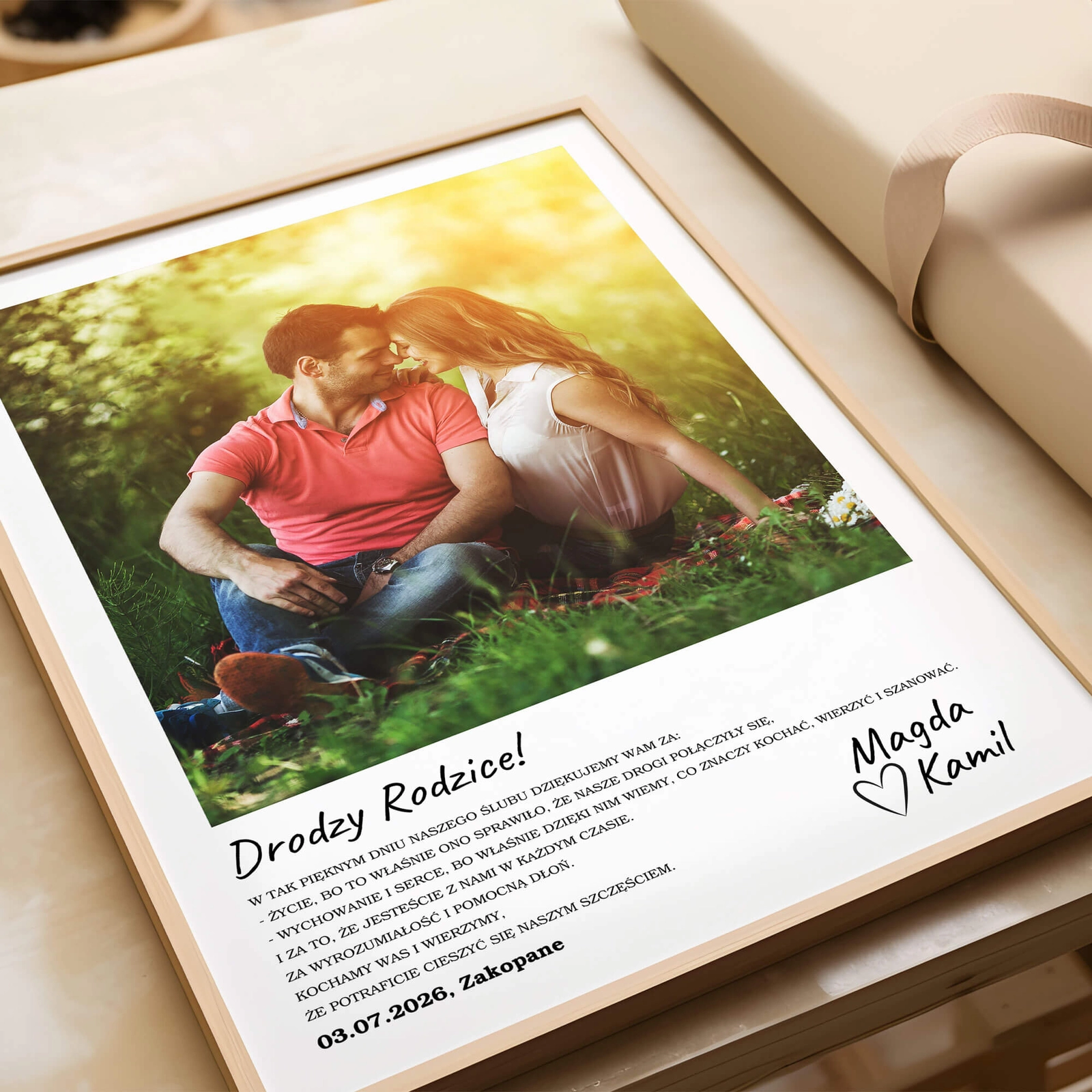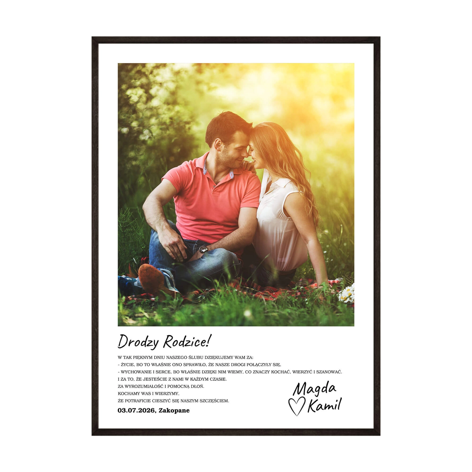 - Personalizowany plakat ze zdjęciem to osobisty sposób podziękowania rodzicom. Pozwala w spokojnej, czytelnej formie wyrazić wdzięczność za obecność, wsparcie i wspólną drogę. Po uroczystości pozostaje jako trwała pamiątka tego wyjątkowego dnia.