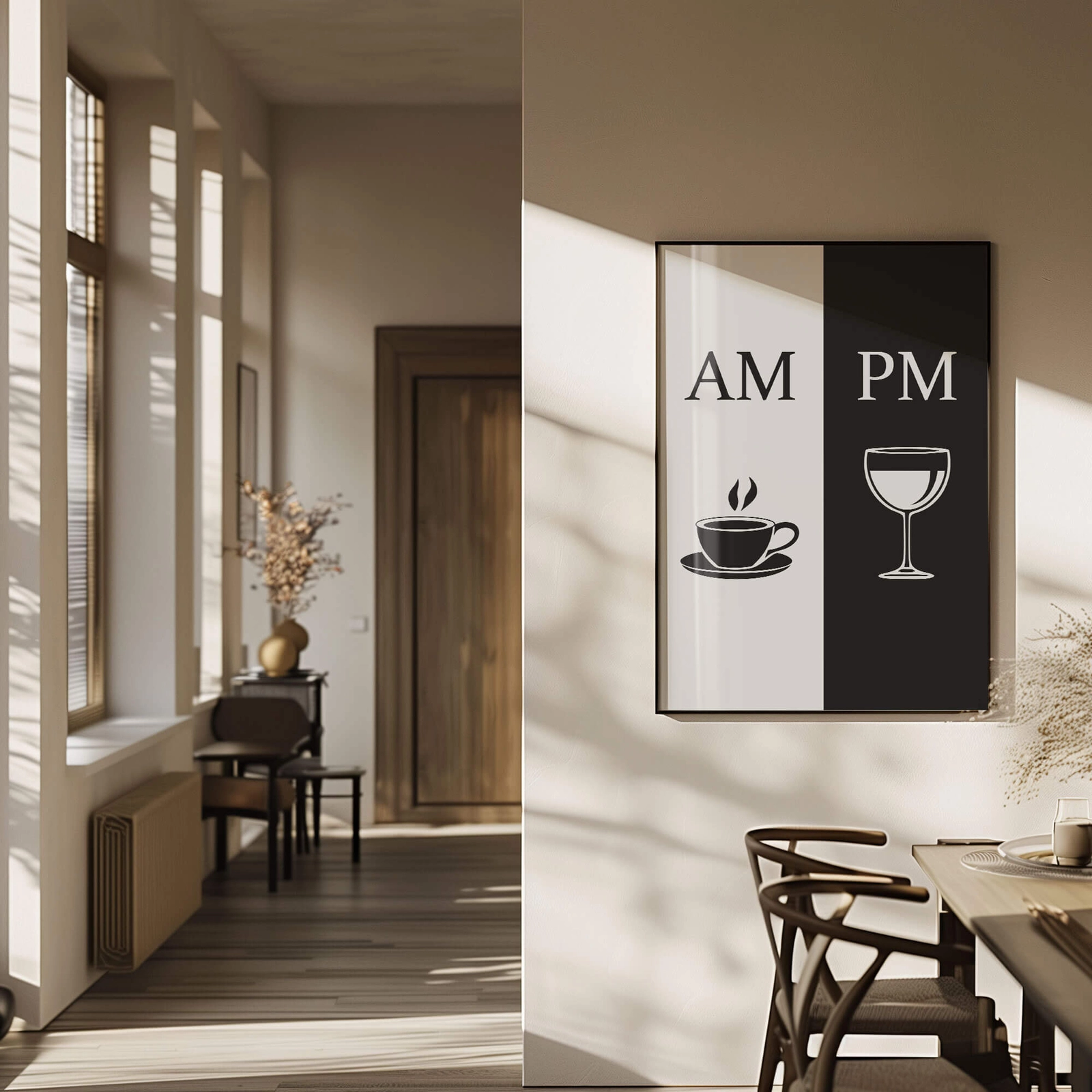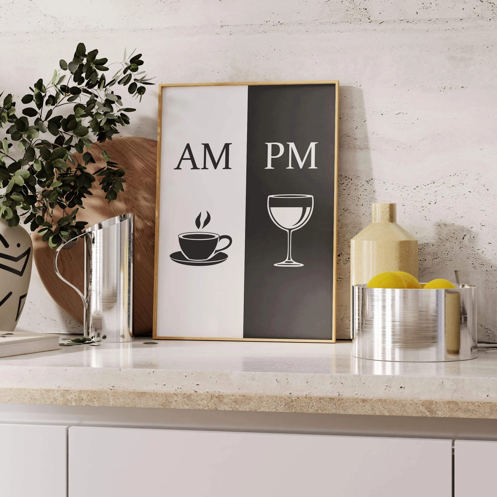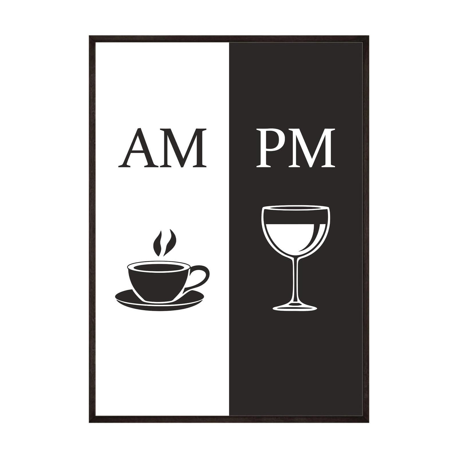 - Minimalistyczny i humorystyczny plakat w stylu black & white przedstawiający z jednej strony filiżankę aromatycznej kawy na dobry start, z drugiej kieliszek wina na relaksujący finał. Bo przecież każdy zasługuje na swoje AM i PM!