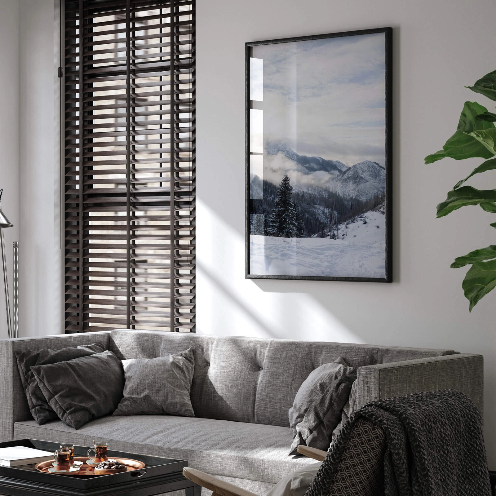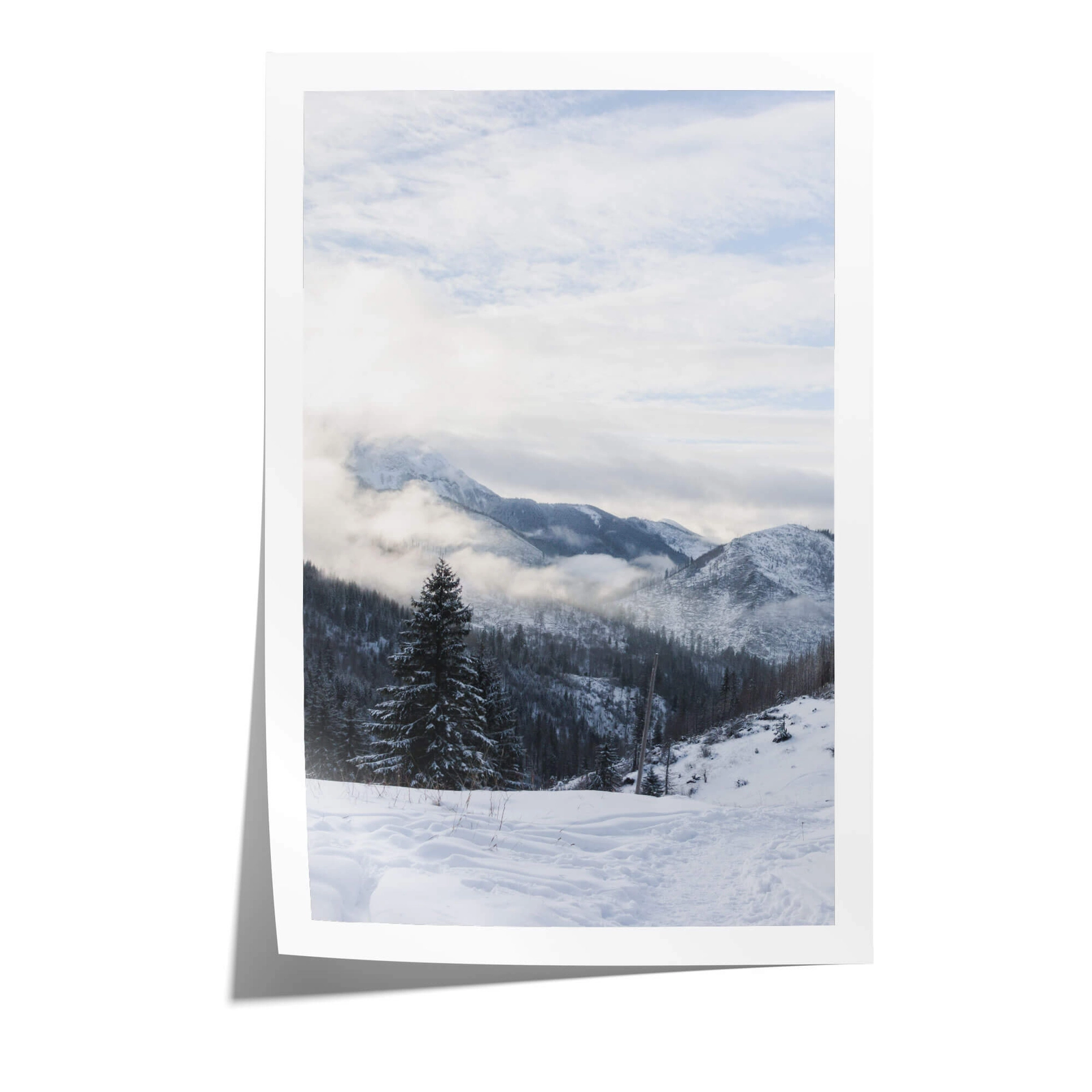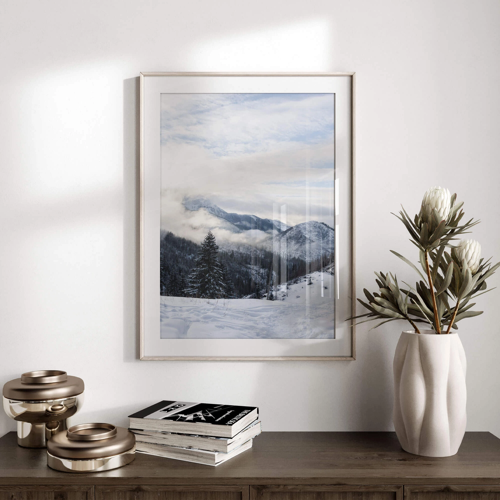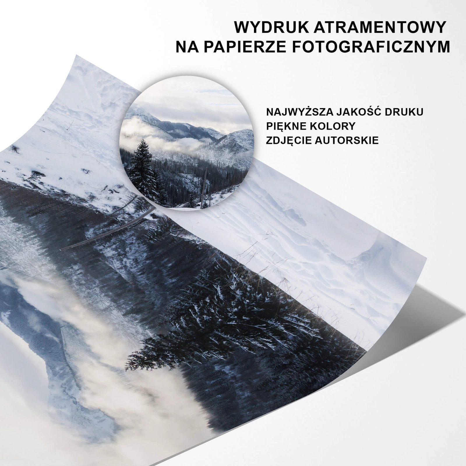 - Przepiękny plakat fotograficzny z widokiem na zaśnieżone góry przykryte chmurami. Ten plakat emanuje zimową i czarującą atmosferą oraz wprowadza duży powiew świeżości do każdego pomieszczenia, w którym zostanie powieszony.