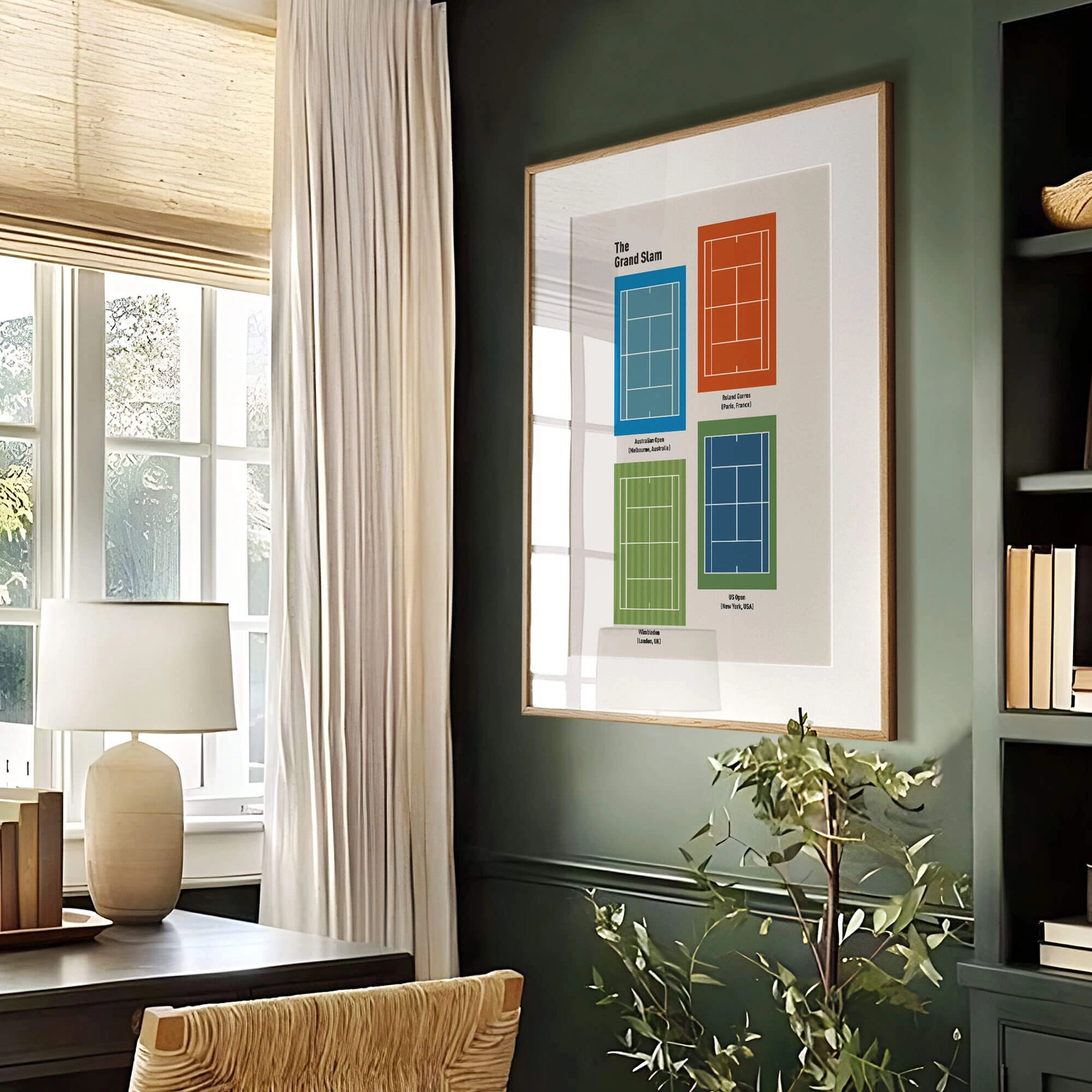 - Minimalistyczny plakat The Grand Slam to stylowy hołd dla czterech legendarnych turniejów tenisowych. Geometryczne korty, stonowane kolory i nowoczesna typografia tworzą elegancką dekorację ścienną, idealnie skrojoną pod wszystkich fanów tenisa.