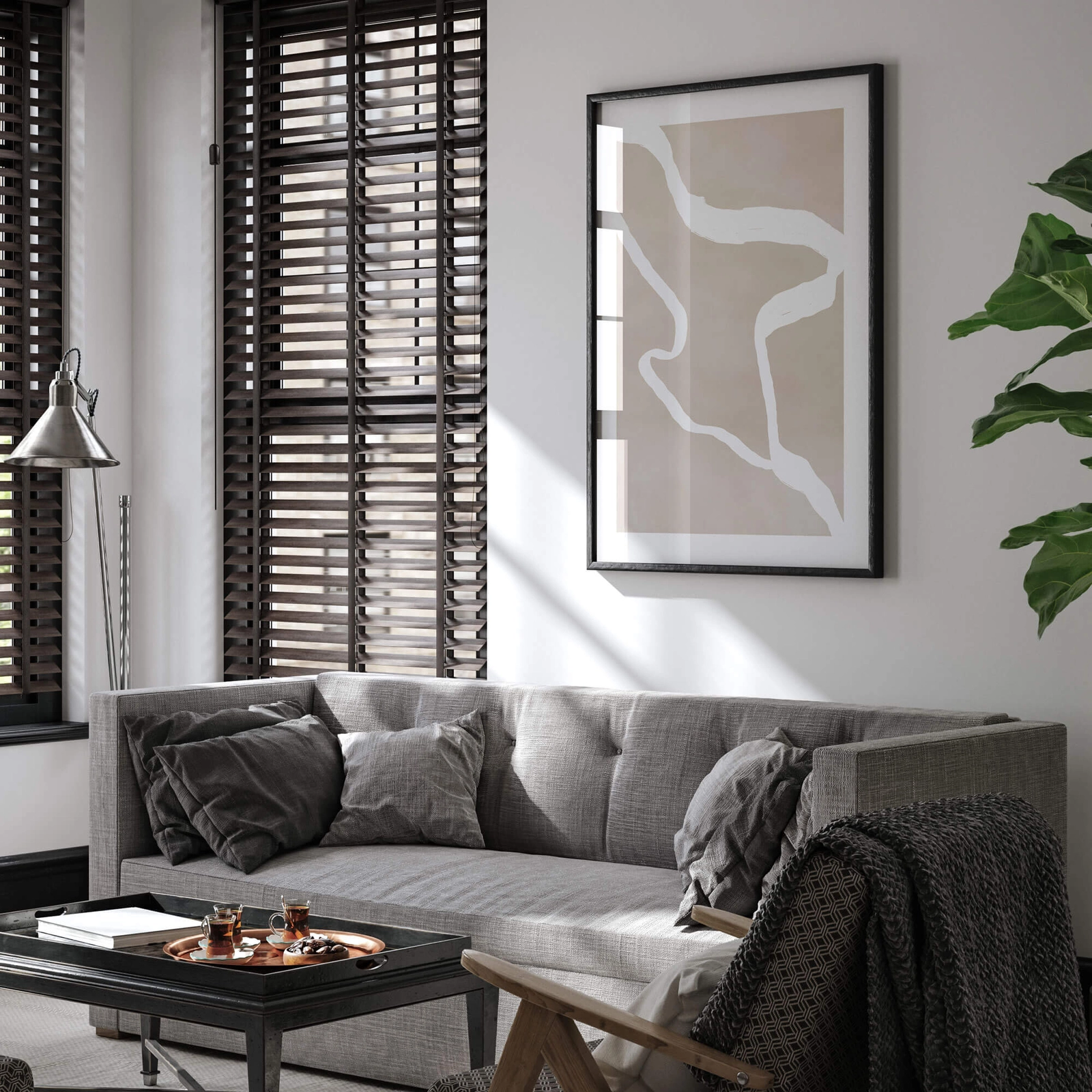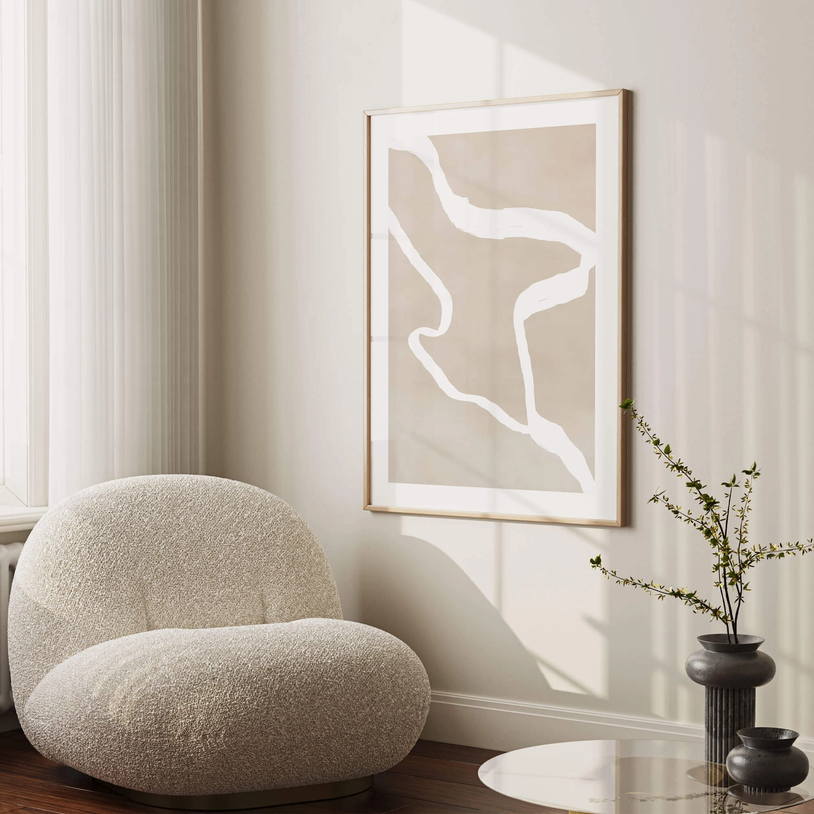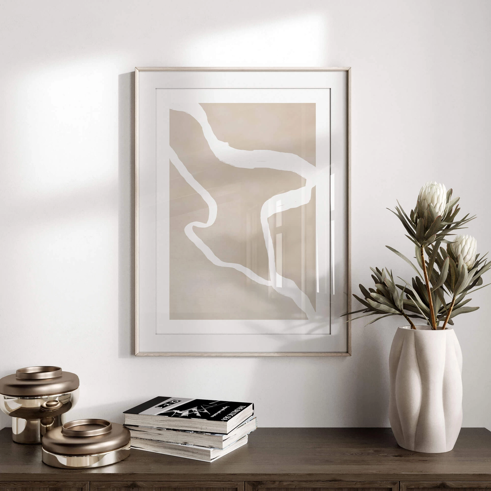 - Modny plakat graficzny przedstawiający białe linie na nierównym kolorystycznie beżowym tle. Plakat posiada nadrukowaną dookoła białą ramkę. Grafika doskonale odnajdzie się w pomieszczeniach urządzonych niemal w każdym stylu.