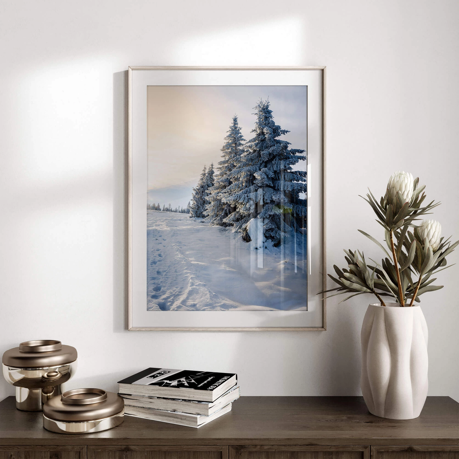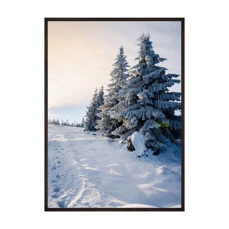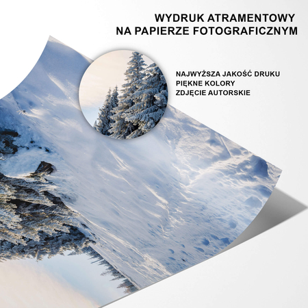 - Plakat zaśnieżone świerki to piękny, zimowy plakat, na którym główny plan tworzą pokryte śniegiem drzewa świerkowe skąpane w promieniach słońca. Ten plakat emanuje wręcz zimową i czarującą atmosferą.