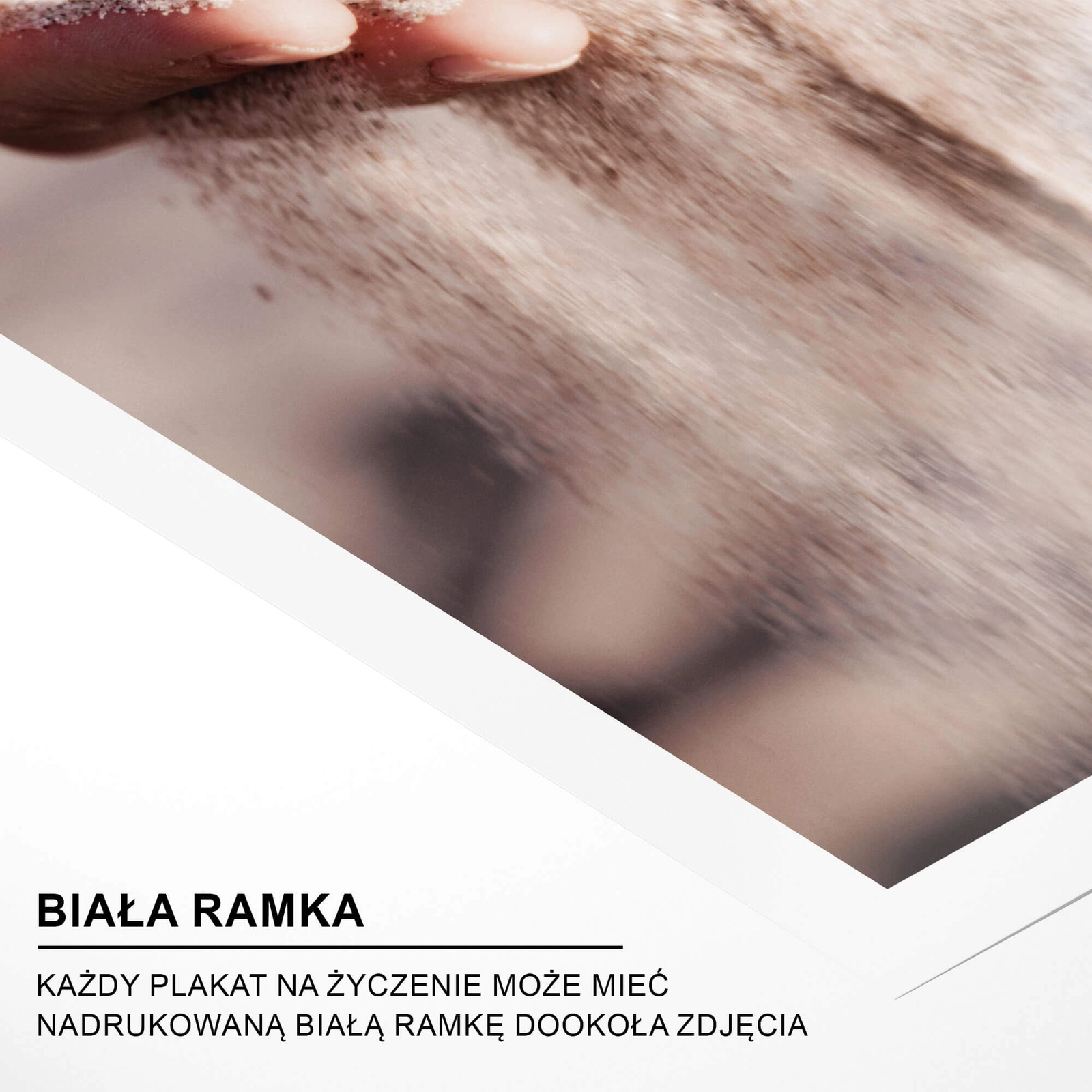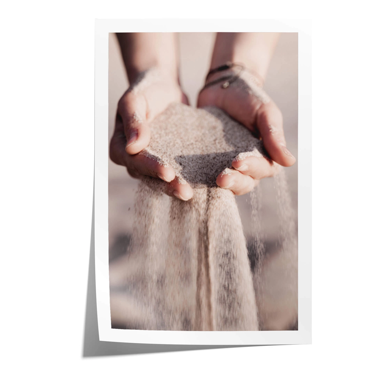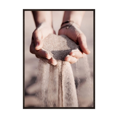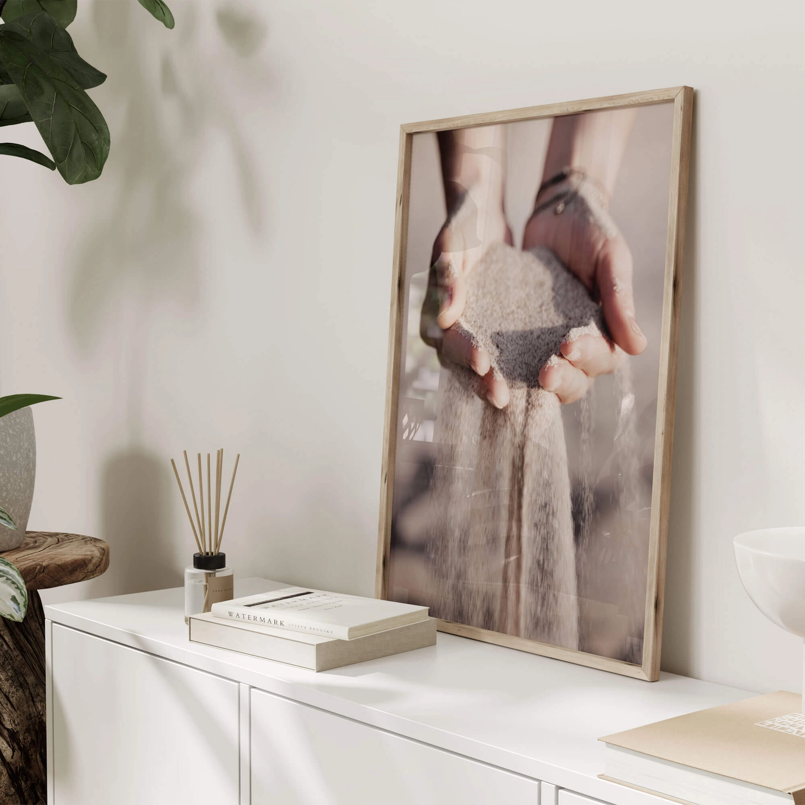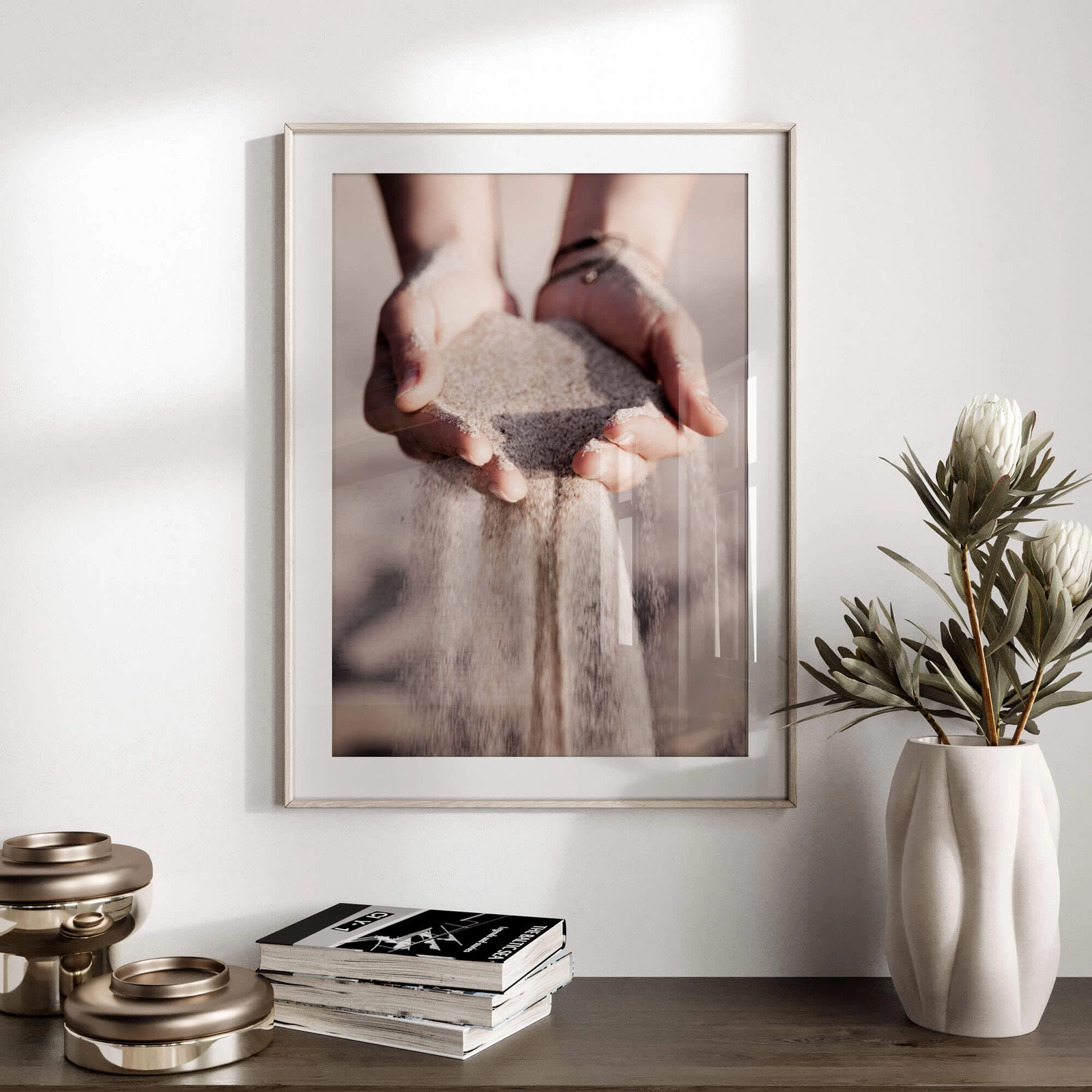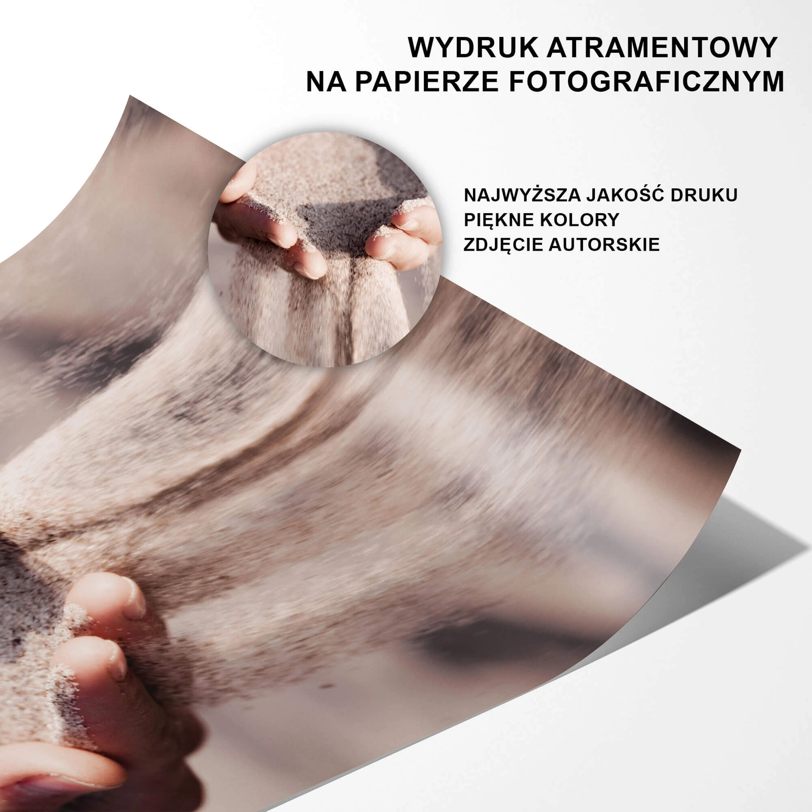 - Piękna fotografia przedstawiająca piasek przesypujący się przez kobiece dłonie i palce. Fotografia z neutralnymi kolorami to świetny pomysł na to, aby Twój dom stał się miejscem, w którym zbierasz energię siłę.