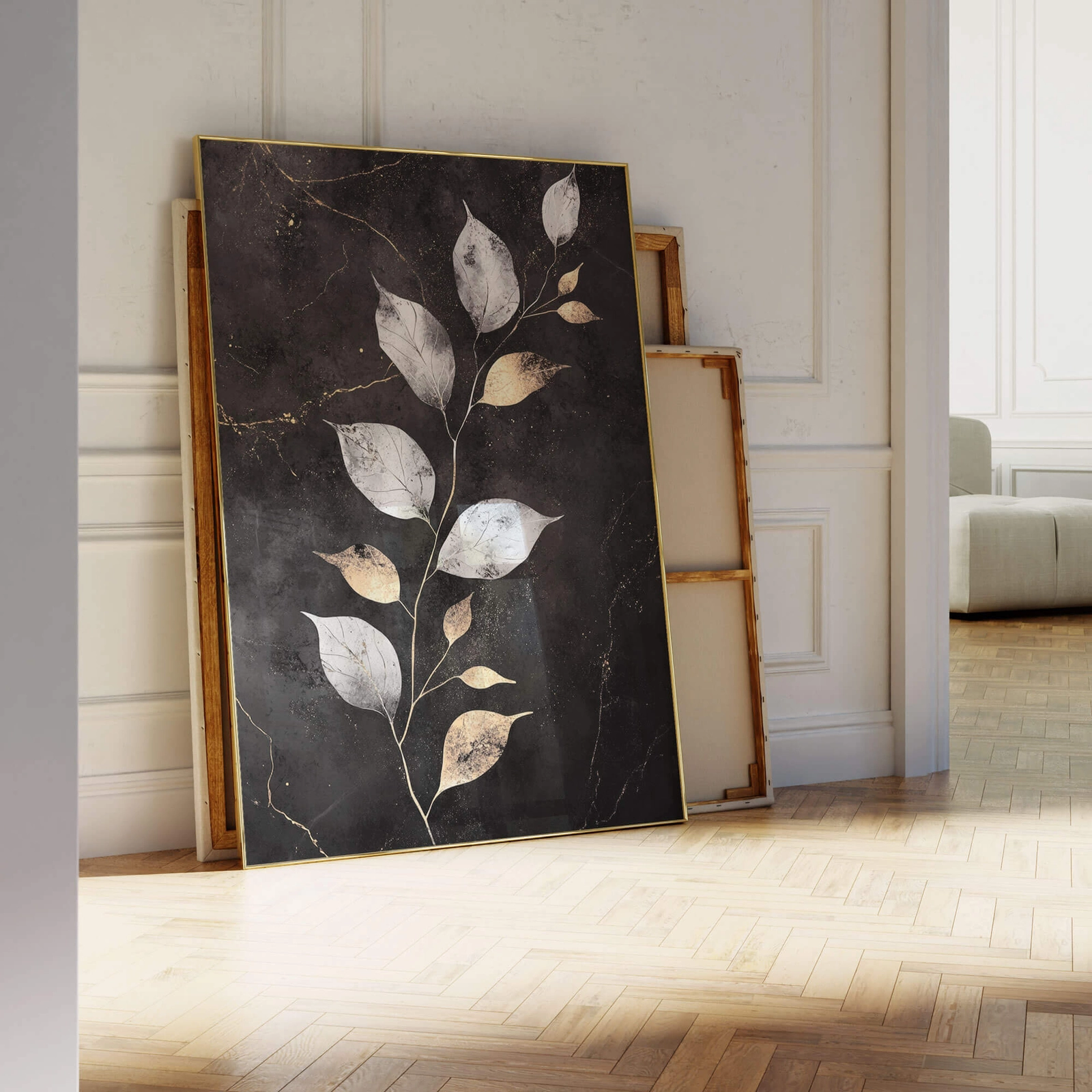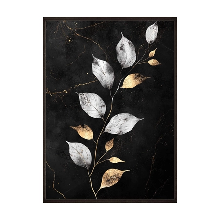 - Wprowadź do swojego wnętrza odrobinę luksusu dzięki plakatowi „Złoto i Srebro Natury”. Ta nowoczesna kompozycja botaniczna zachwyca kontrastem czarnego, głębokiego tła z subtelnym blaskiem złotych i srebrnych liści, idealnie wpisując się w styl glamour.