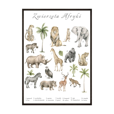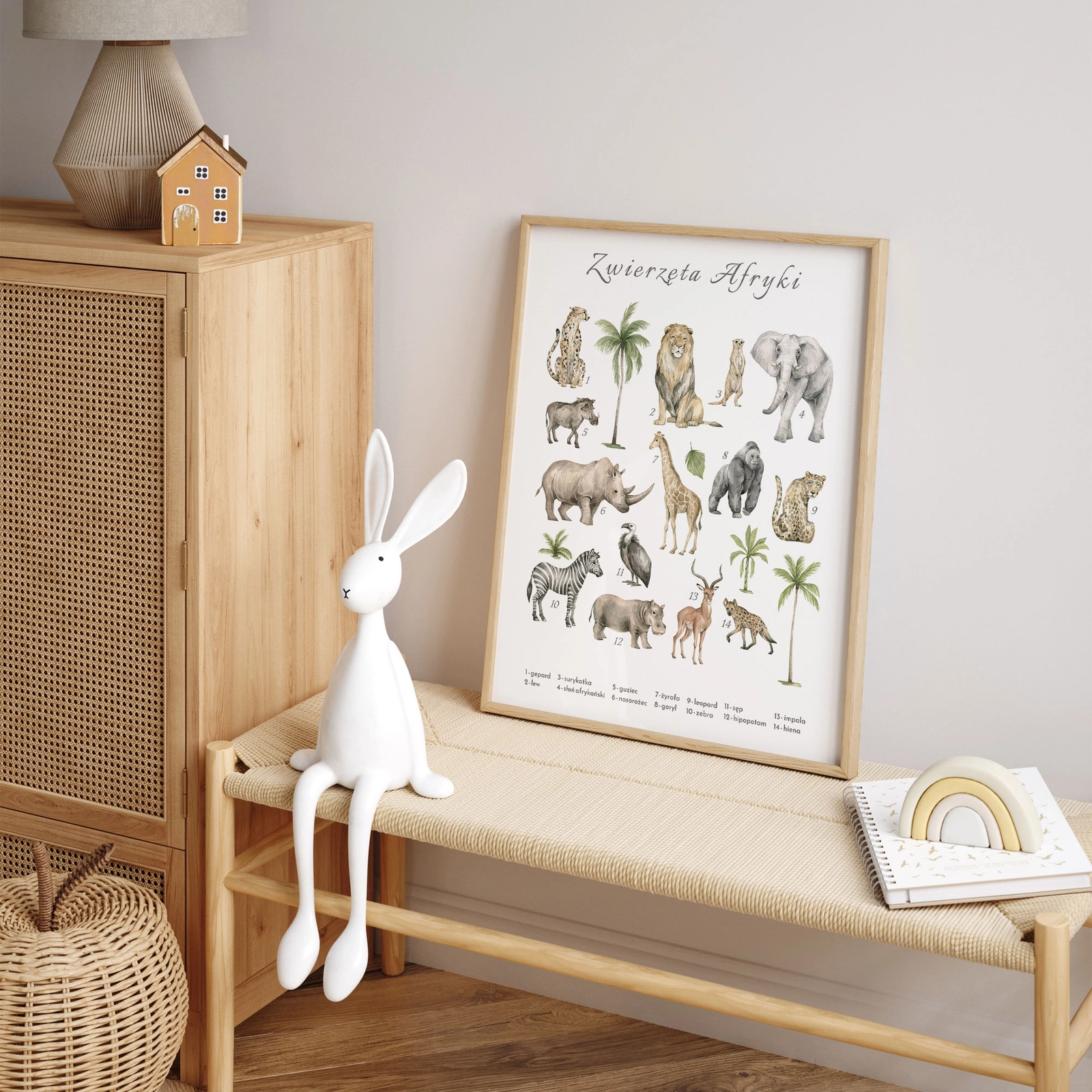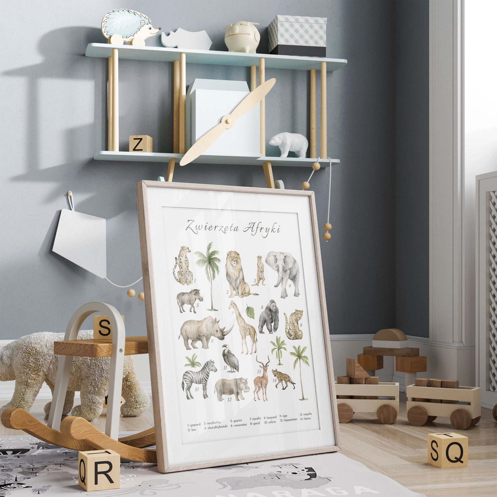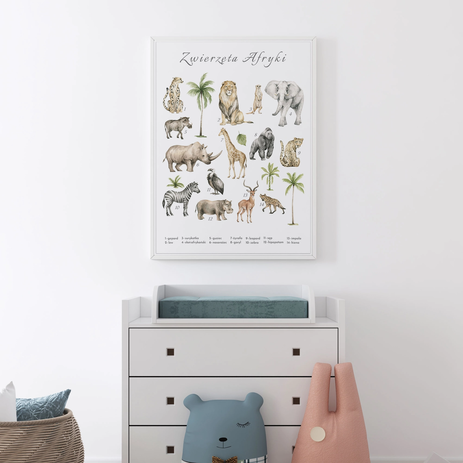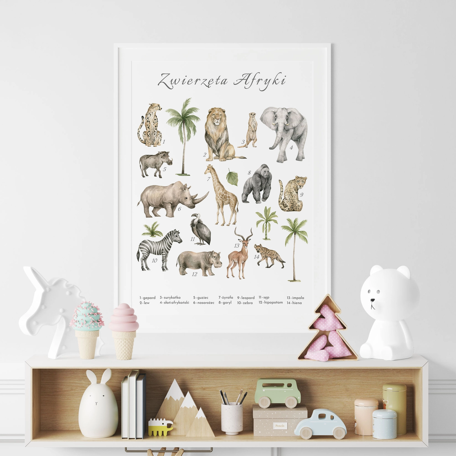 - Plakat zwierzęta Afryki to urocza grafika z motywem zwierząt zamieszkujących i pochodzących z terenów afrykańskich. Jest to stylowa dekoracja, która nie tylko uczy, ale również świetnie wygląda w każdym dziecięcym pokoju.