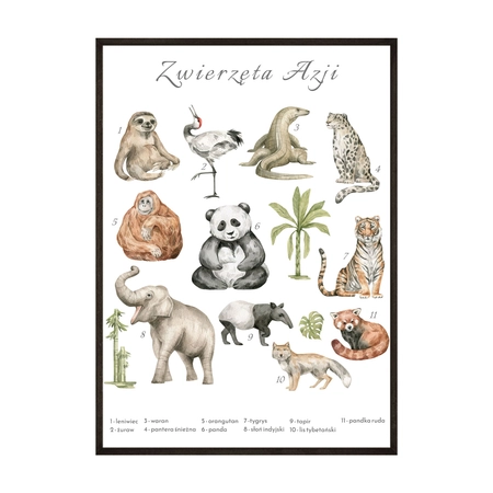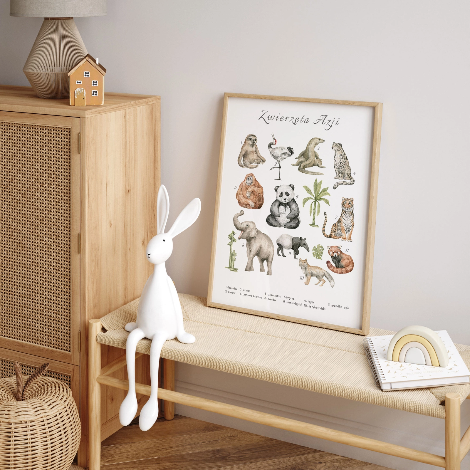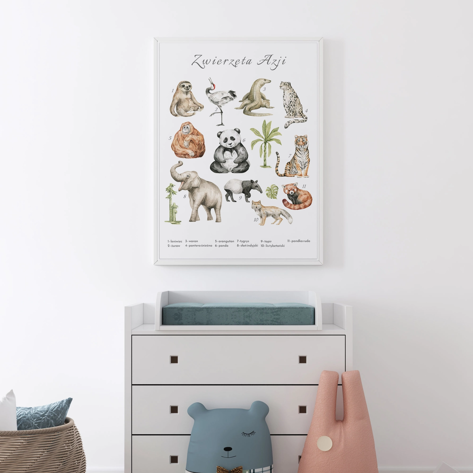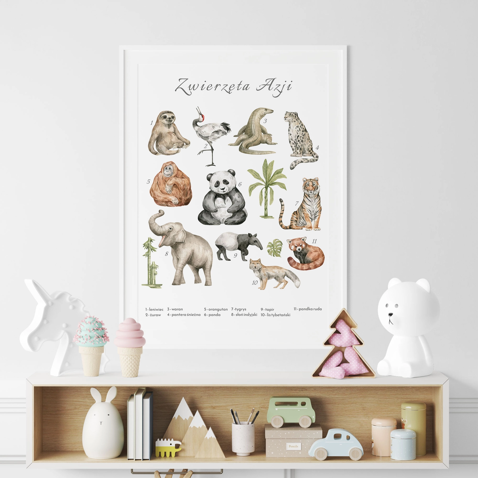 - Plakat zwierzęta Azji to urocza grafika z motywem zwierząt zamieszkujących i pochodzących z terenów azjatyckich. Jest to stylowa dekoracja, która nie tylko uczy, ale również świetnie wygląda w każdym dziecięcym pokoju.