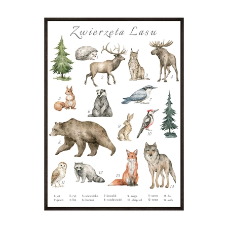 - Plakat zwierzęta lasu to urocza grafika z motywem leśnych zwierząt, która rozpoczyna naszą nową kolekcję plakatów edukacyjnych dla najmłodszych. Jest to stylowa dekoracja, która nie tylko uczy, ale również świetnie wygląda w każdym dziecięcym pokoju.