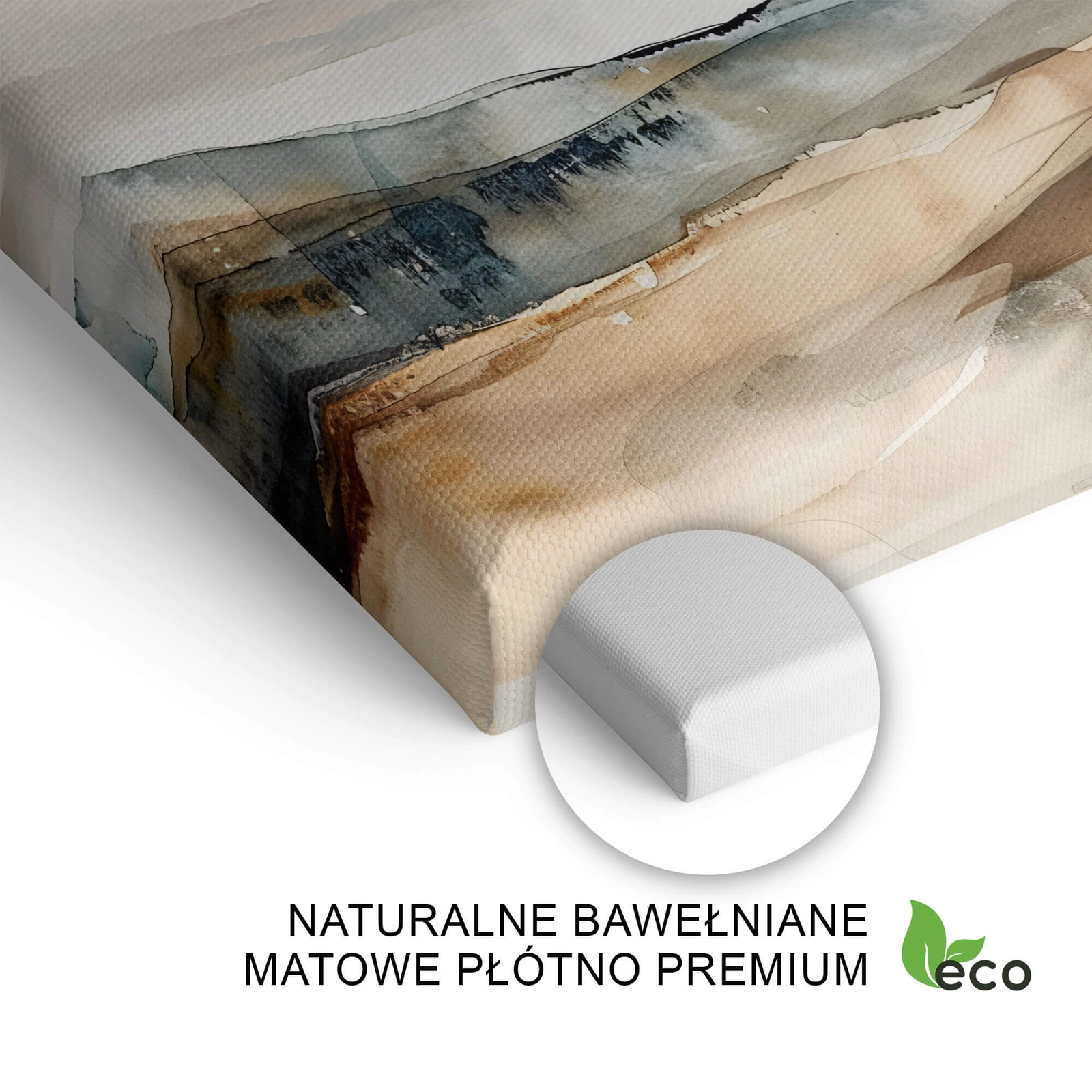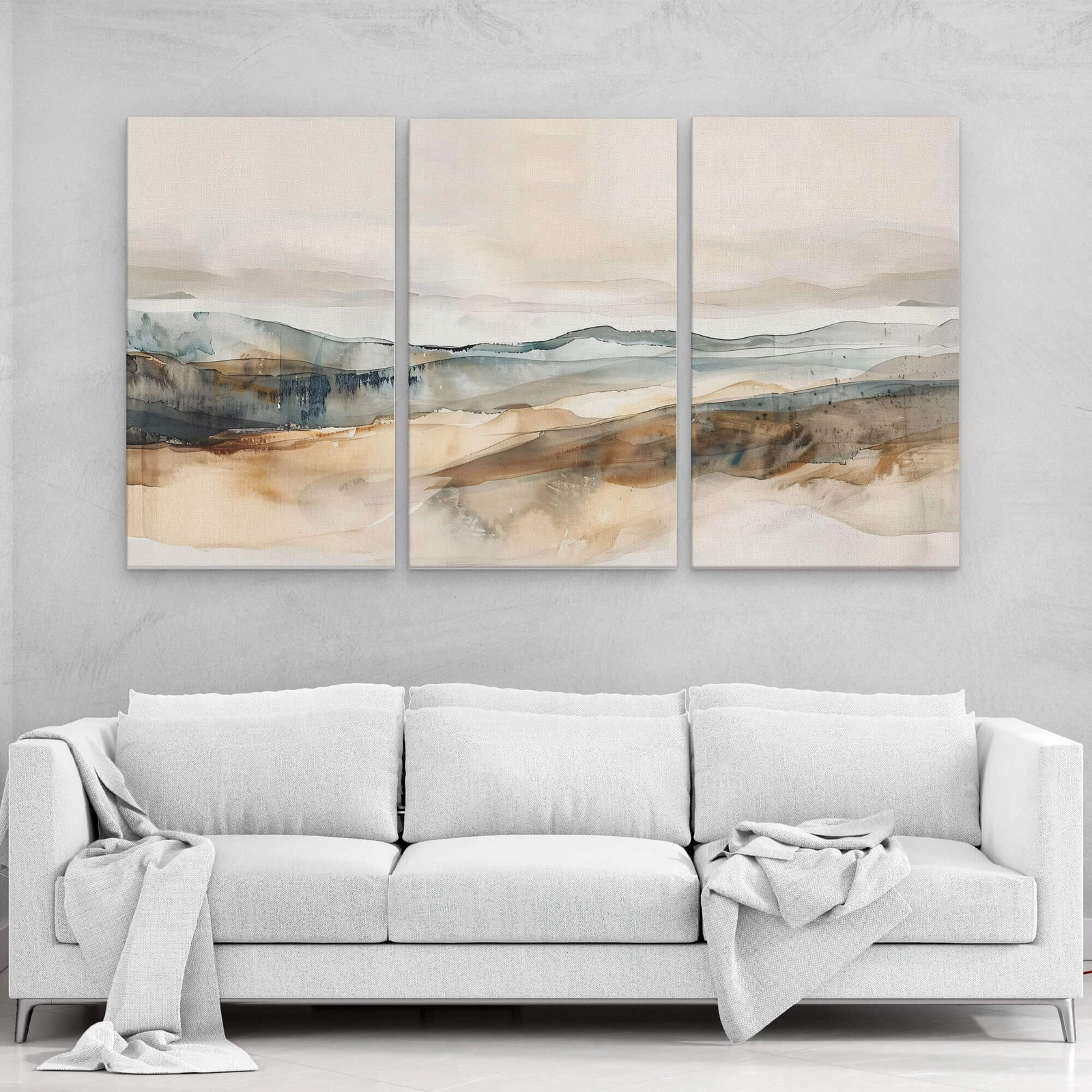 - Zestaw trzech nowoczesnych obrazów na płótnie przedstawiających abstrakcyjną panoramę górską w ciepłych beżowych i brązowych odcieniach. Minimalistyczny design z subtelnymi przejściami kolorów tworzy elegancki i uspokajający efekt.