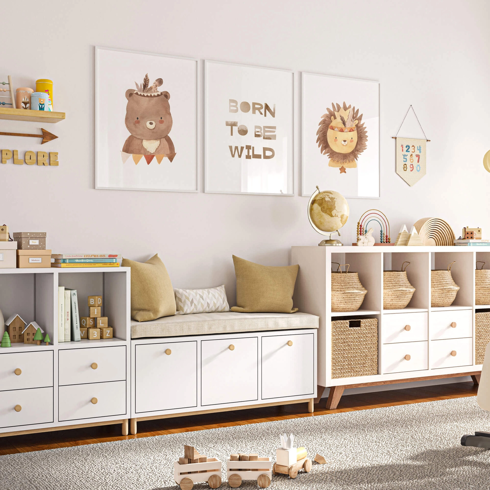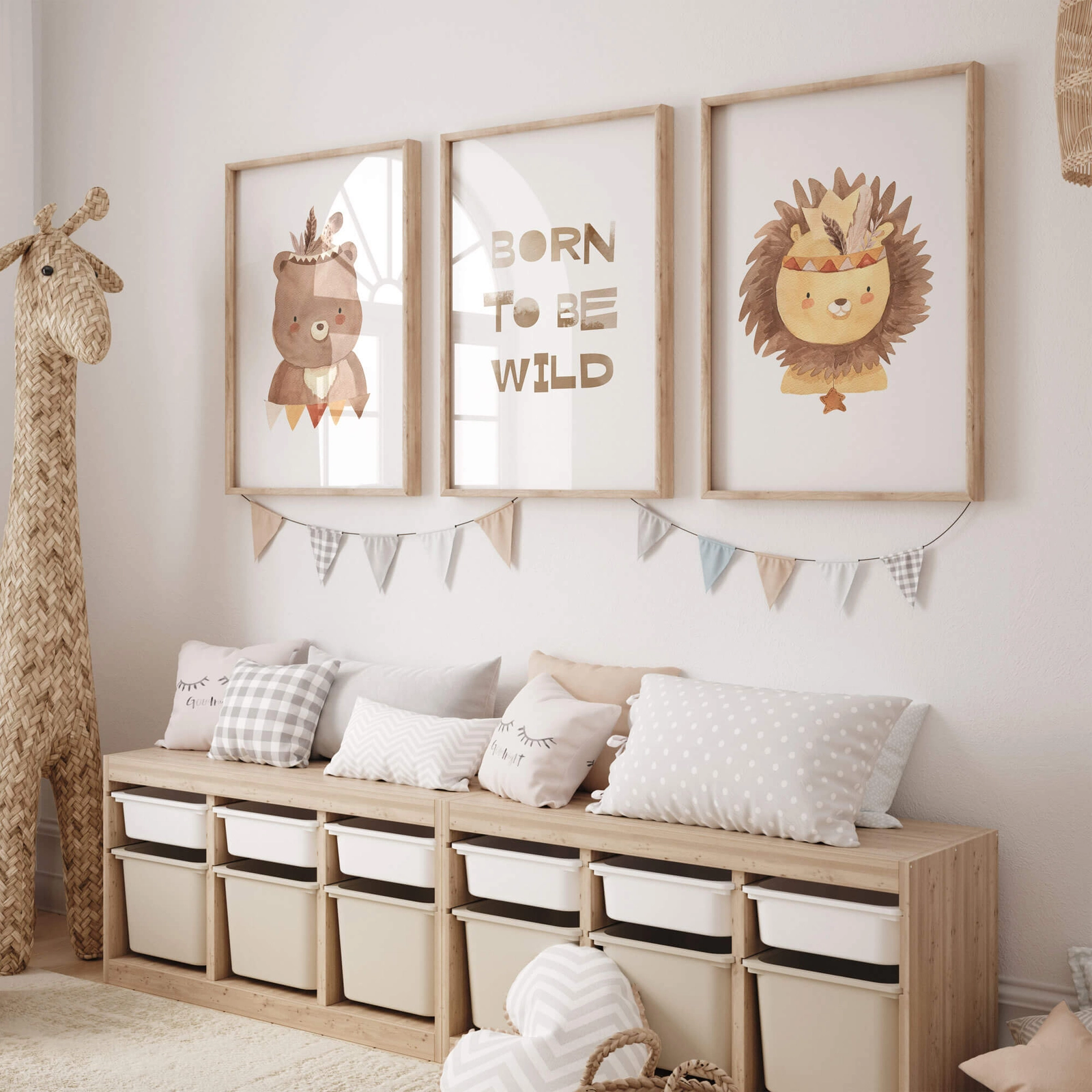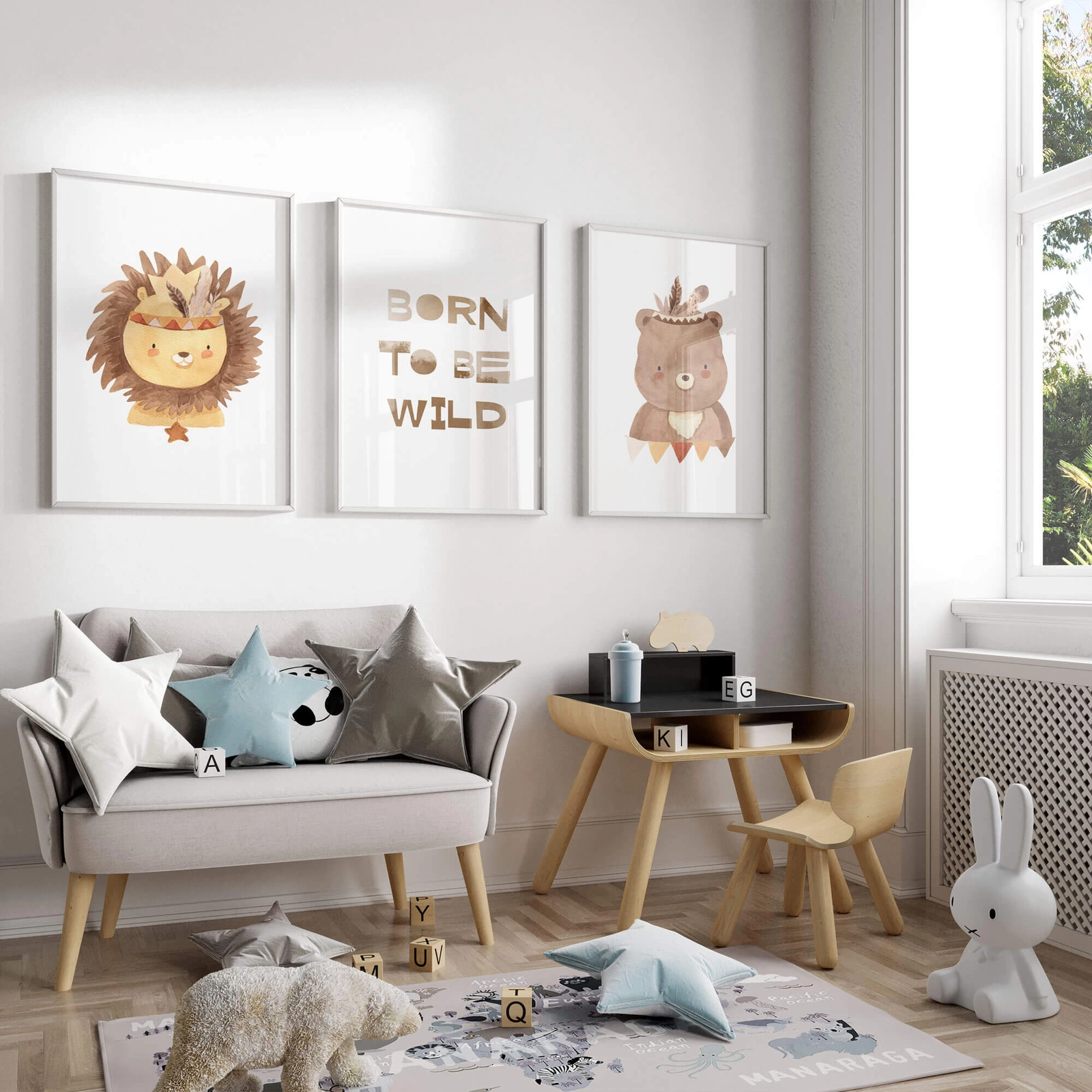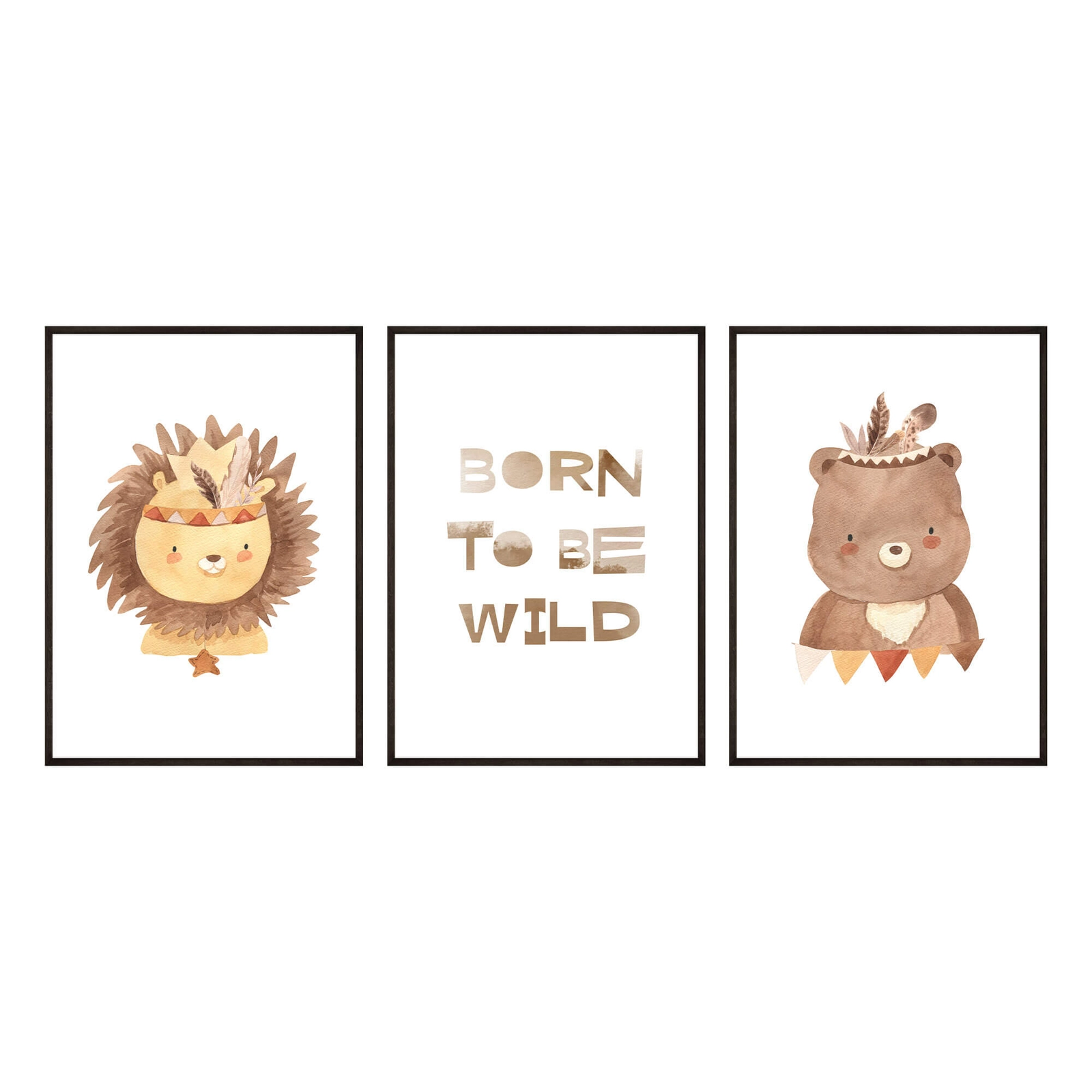 - Piękny zestaw 3 plakatów do pokoju dziecięcego w stylu boho, na który składają się dwa plakaty z akwarelowymi zwierzakami oraz plakat z napisem "Born To Be Wild". Zestaw idealnie wkomponuje się w pokój, zarówno młodszych jak i starszych dzieci.