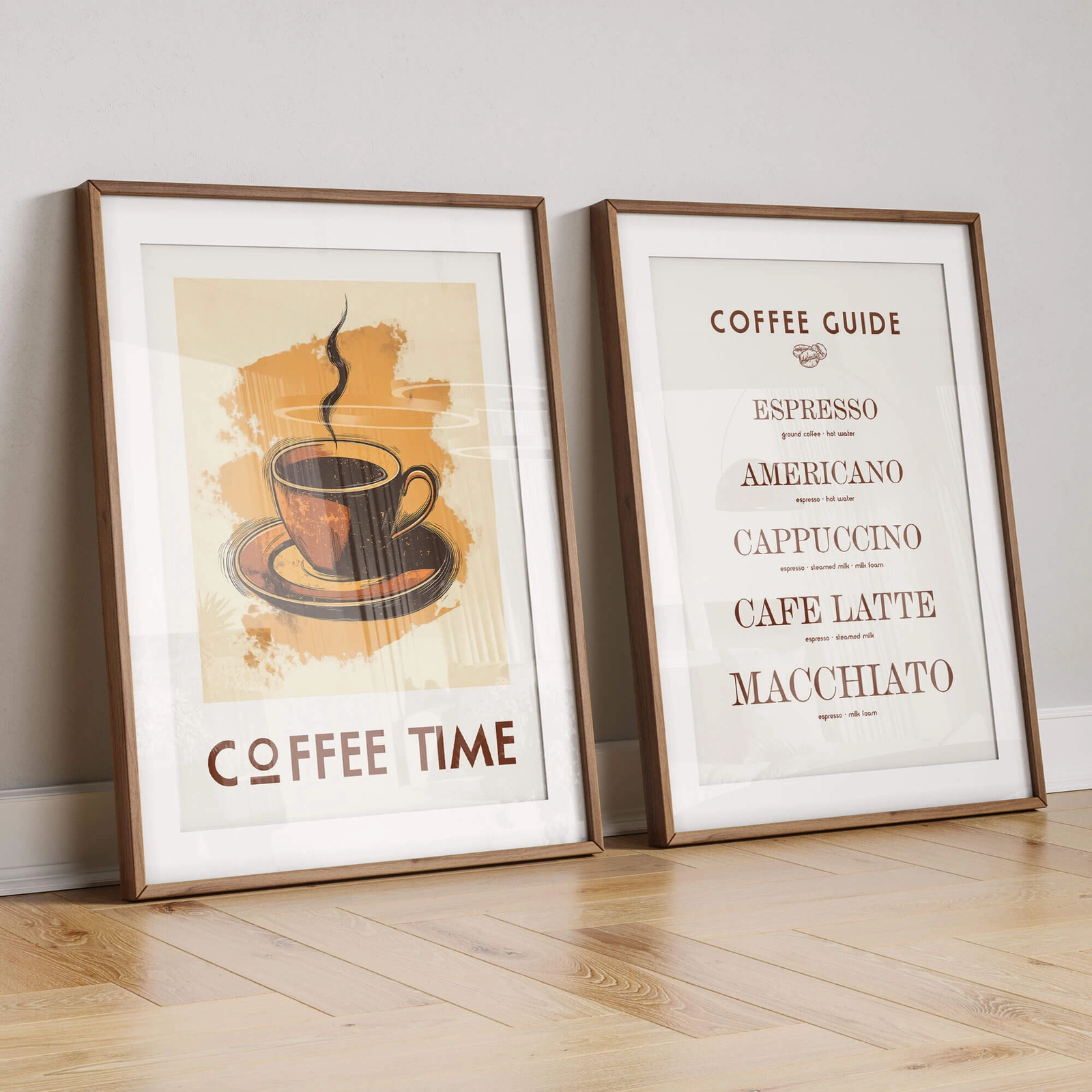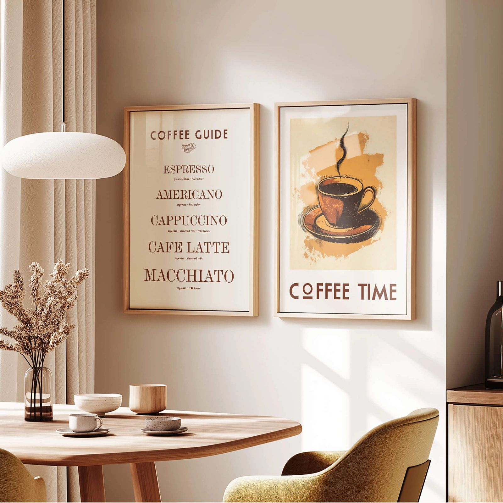 - Zestaw plakatów Coffee Time to stylowa dekoracja dla miłośników kawy. Ilustracja filiżanki oraz przewodnik po najpopularniejszych kawach wprowadzą do wnętrza ciepły klimat i dodadzą charakteru do kuchni, kawiarni, biura lub kącika kawowego.