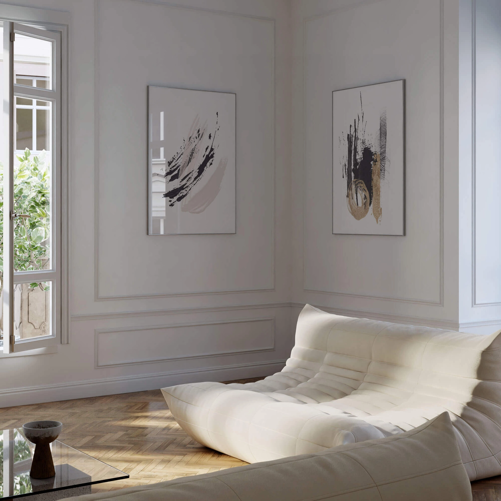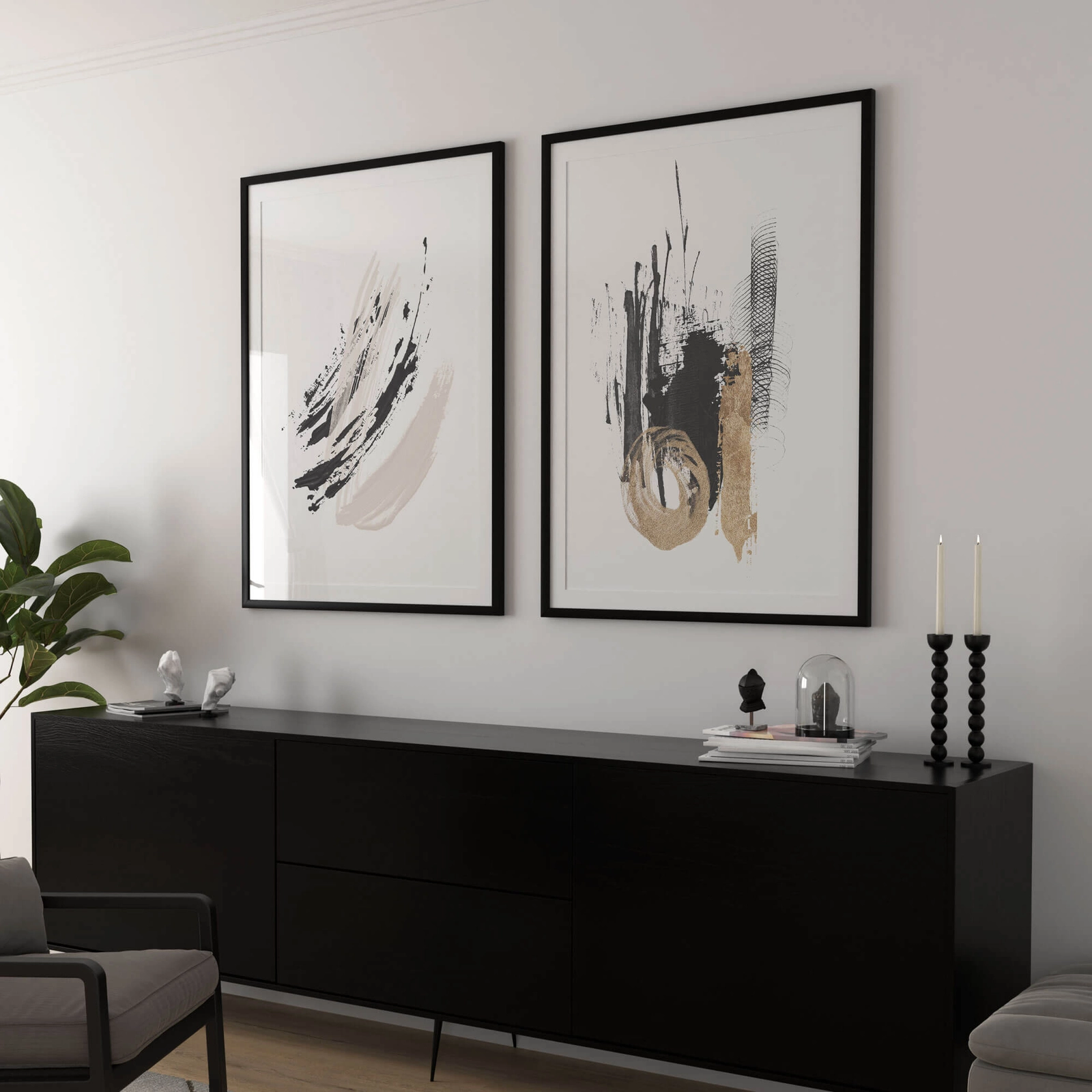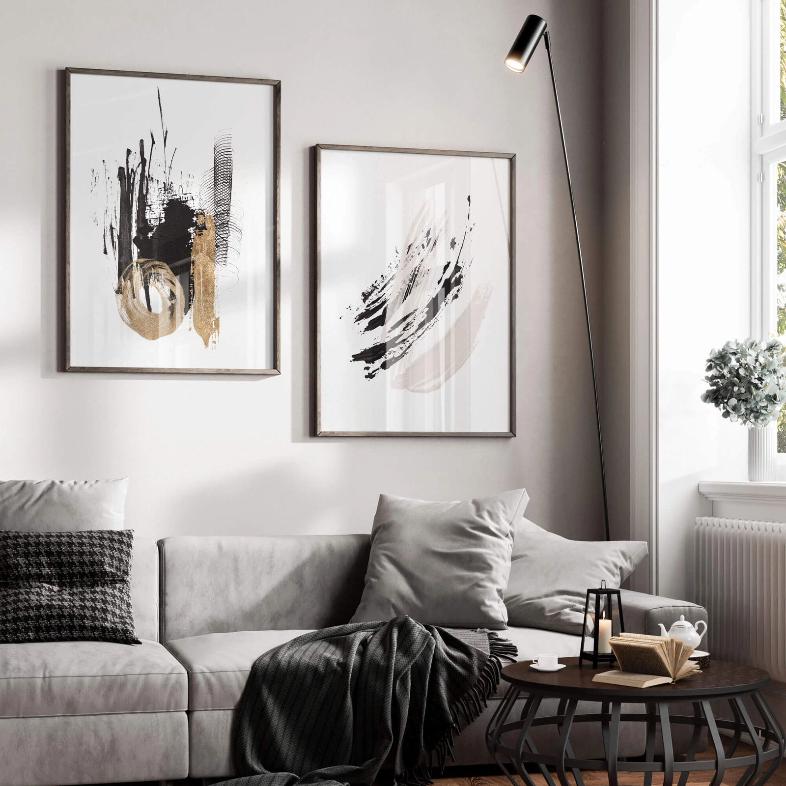 - Nowoczesny zestaw dwóch plakatów w stylu abstrakcyjnym. Dynamiczne pociągnięcia pędzla w odcieniach czerni, beżu i złota dodadzą charakteru każdemu wnętrzu. Minimalistyczna forma i eleganckie kolory tworzą wyjątkową i artystyczną kompozycję.