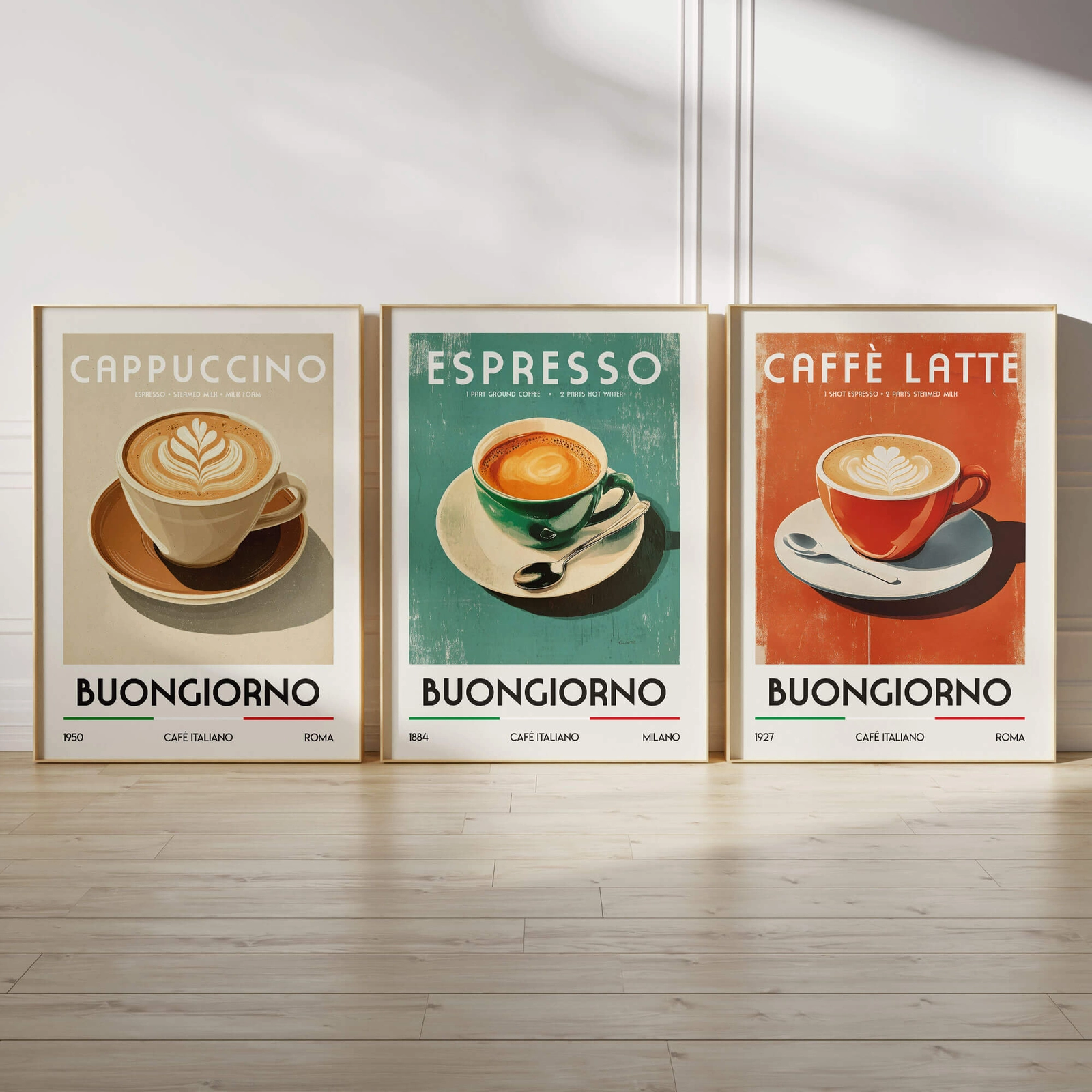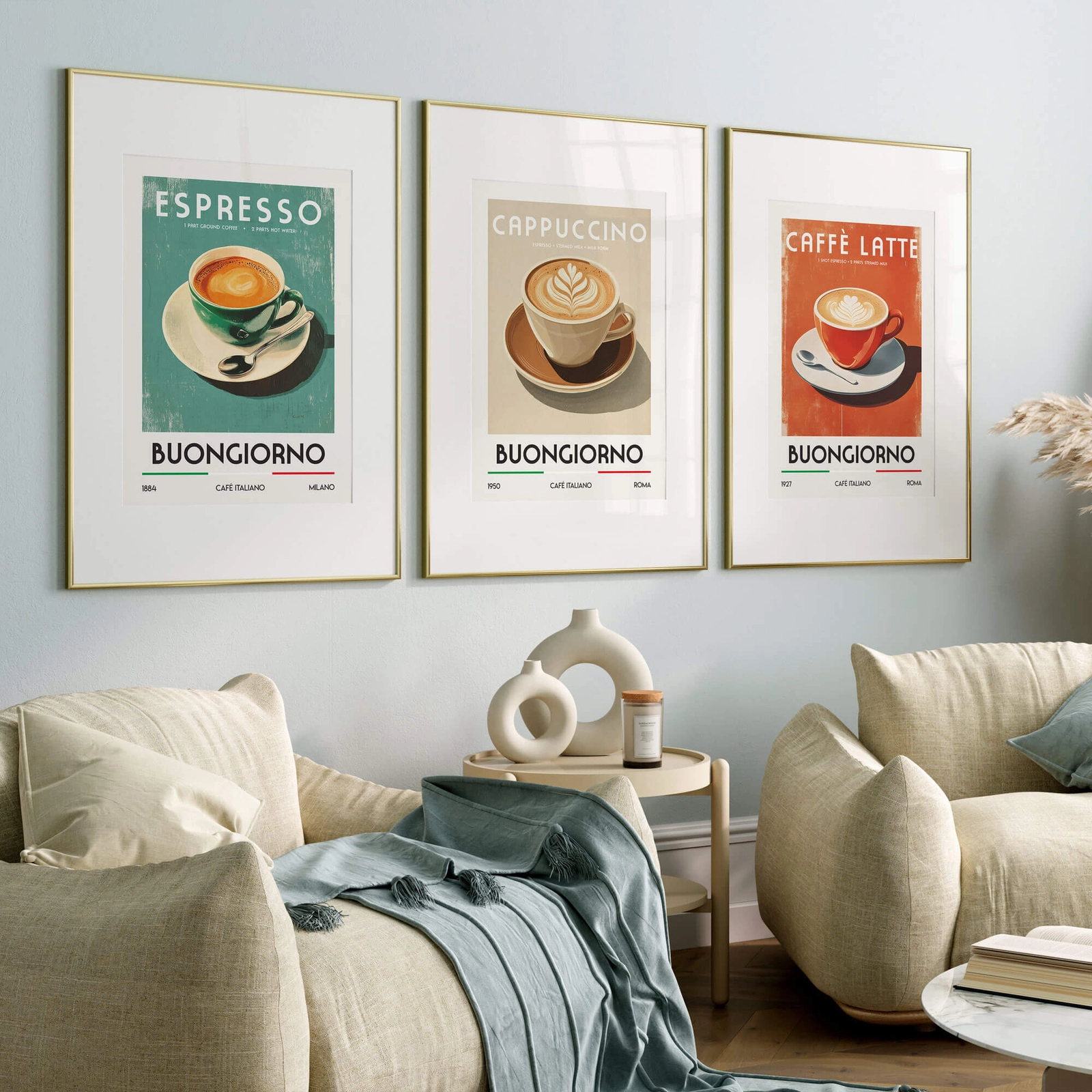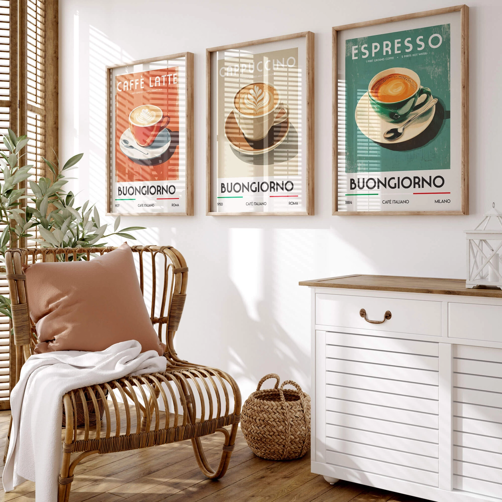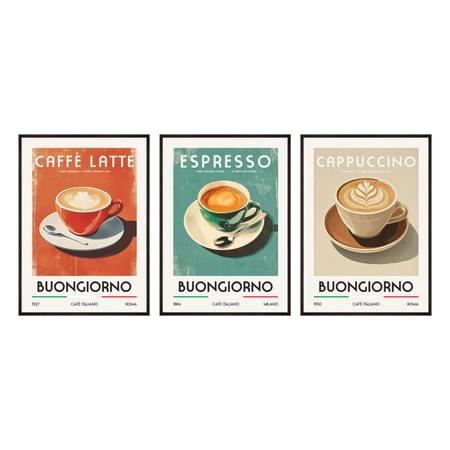 - Zestaw plakatów Kawa po włosku to stylowa dekoracja inspirowana włoskimi kawiarniami. Trzy ilustracje przedstawiające espresso, cappuccino i caffè latte dodadzą wnętrzu charakteru, koloru i aromatycznego klimatu. Idealny do kawiarni lub kawowego kącika.