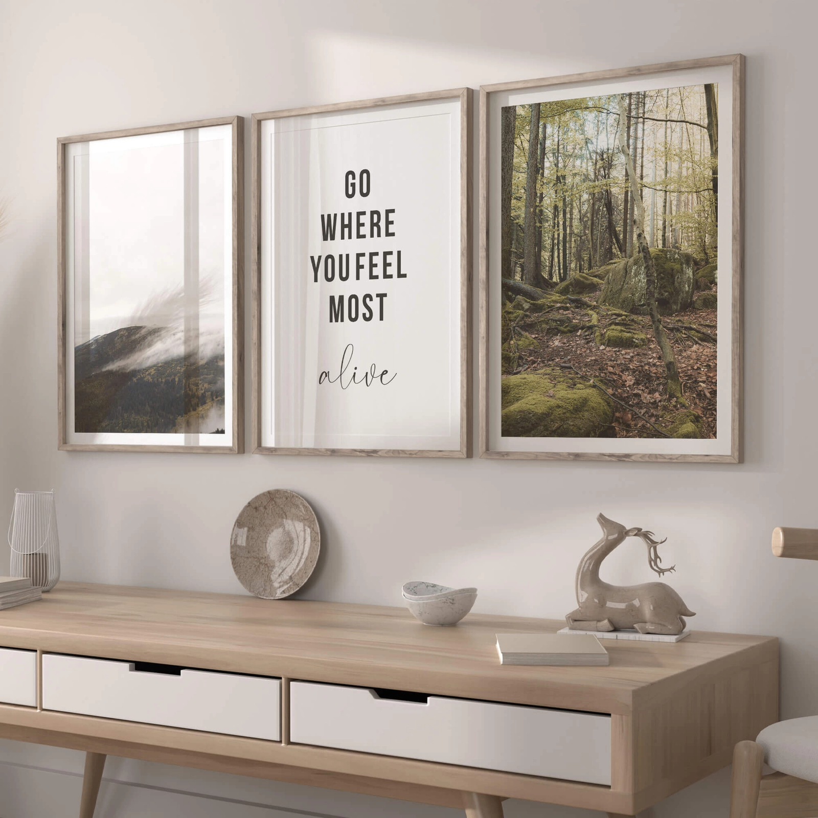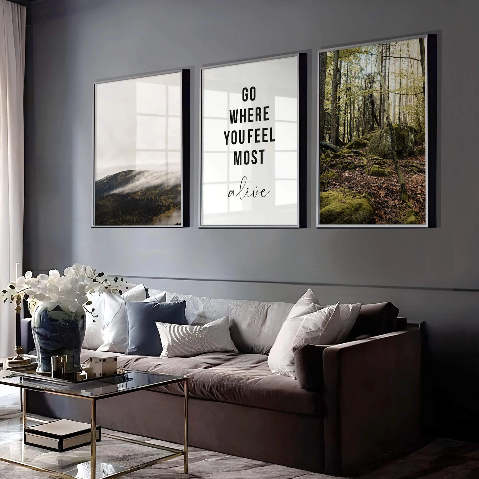 - Zestaw plakatów most alive to dwa krajobrazowe zdjęcia autorskie oraz jeden plakat typograficzny, który uzupełnia i doskonale łączy cały zestaw. Powieszony na ścianie w salonie czy sypialni doda wnętrzu spokoju oraz przytulności.