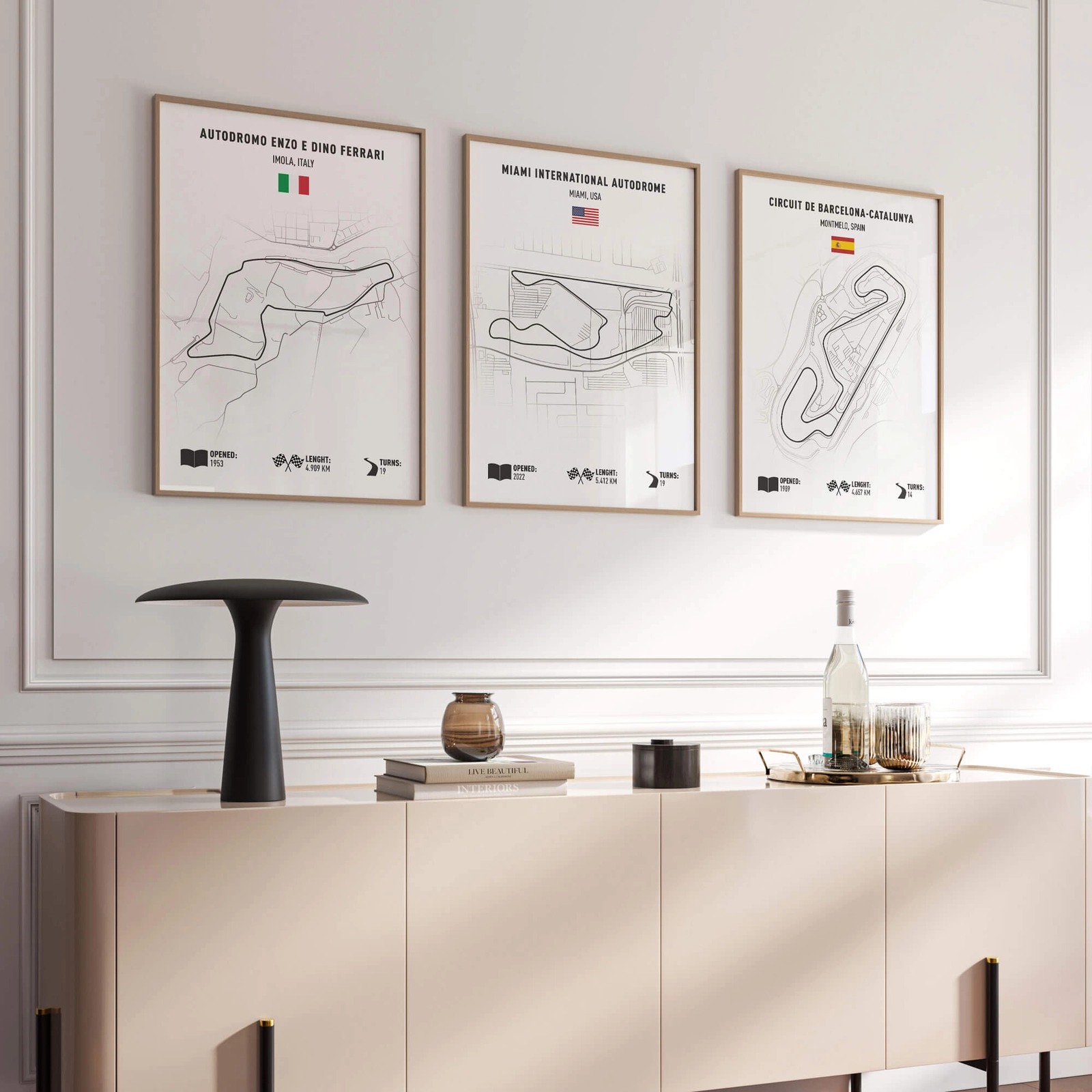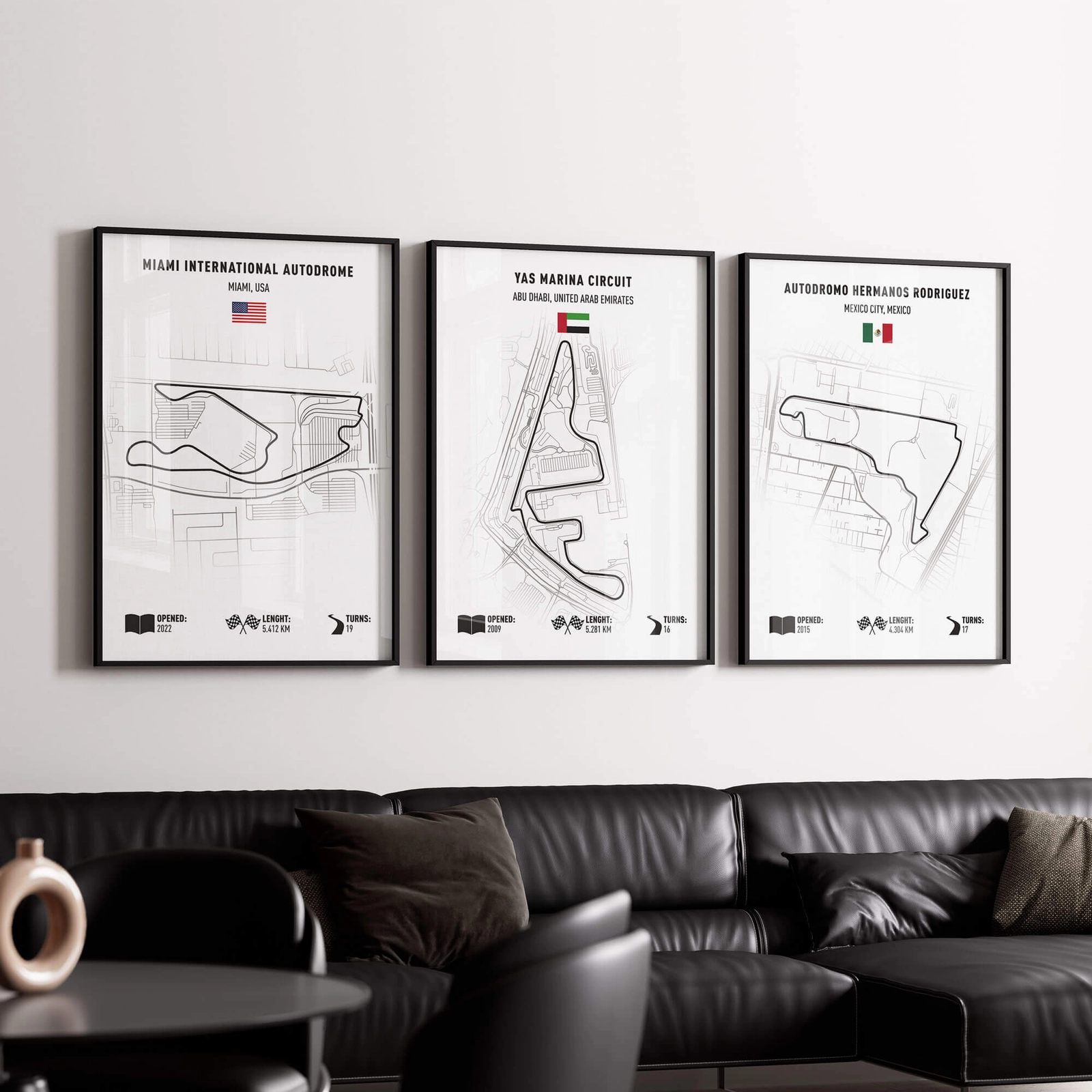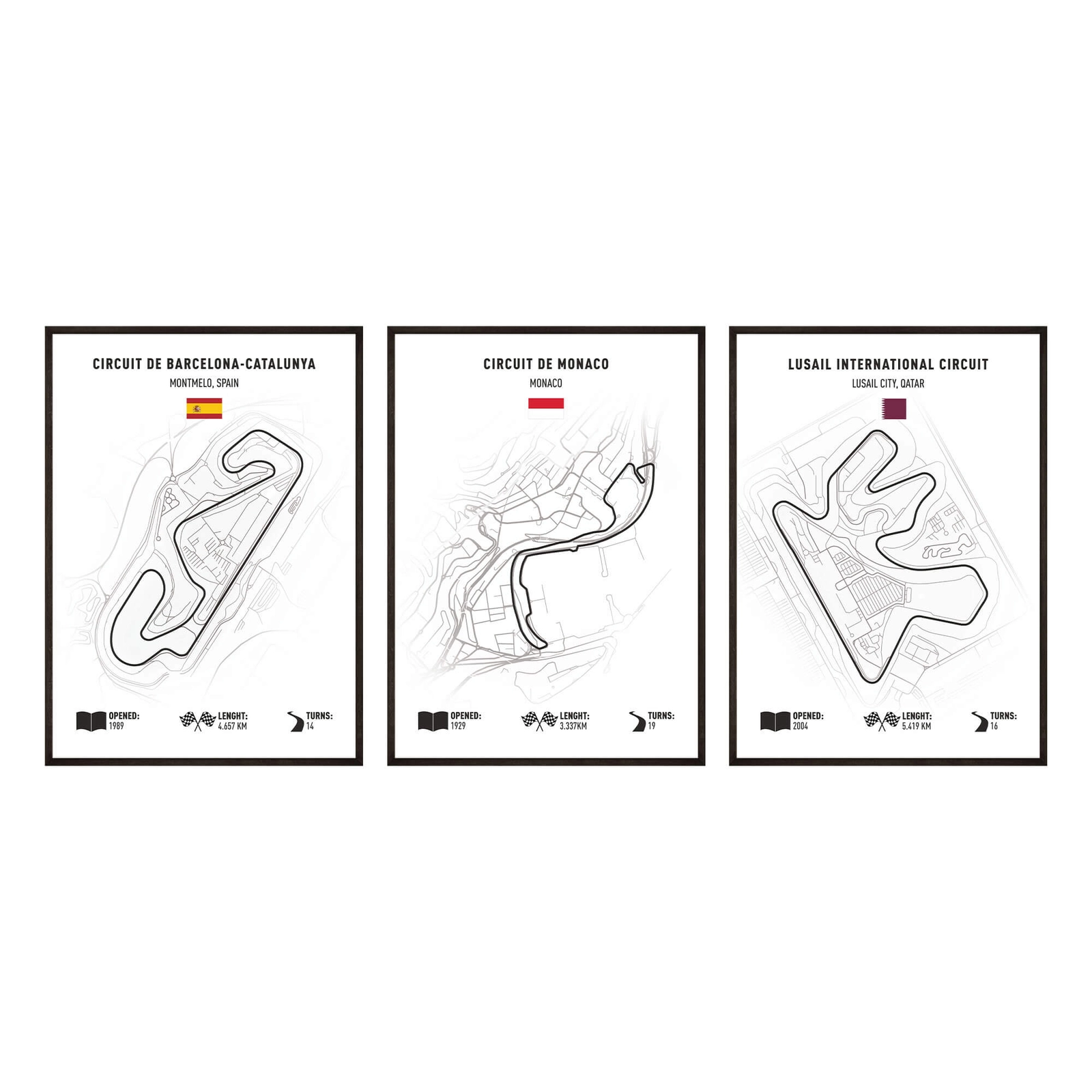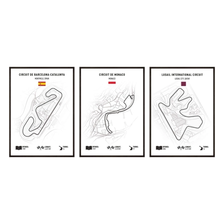 - Zestaw 3 minimalistycznych plakatów z mapami legendarnych torów wyścigowych to stylowa dekoracja dla fanów motorsportu i nowoczesnych wnętrz. Spójna, czarno-biała estetyka z subtelnymi detalami tworzy bardzo efektowną galerię ścienną.