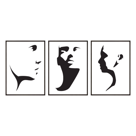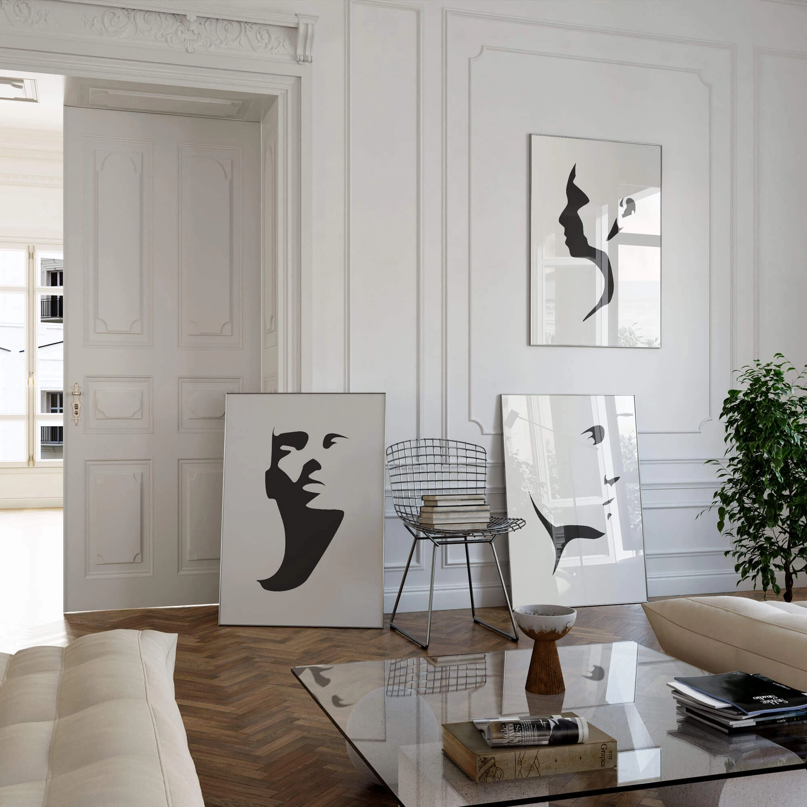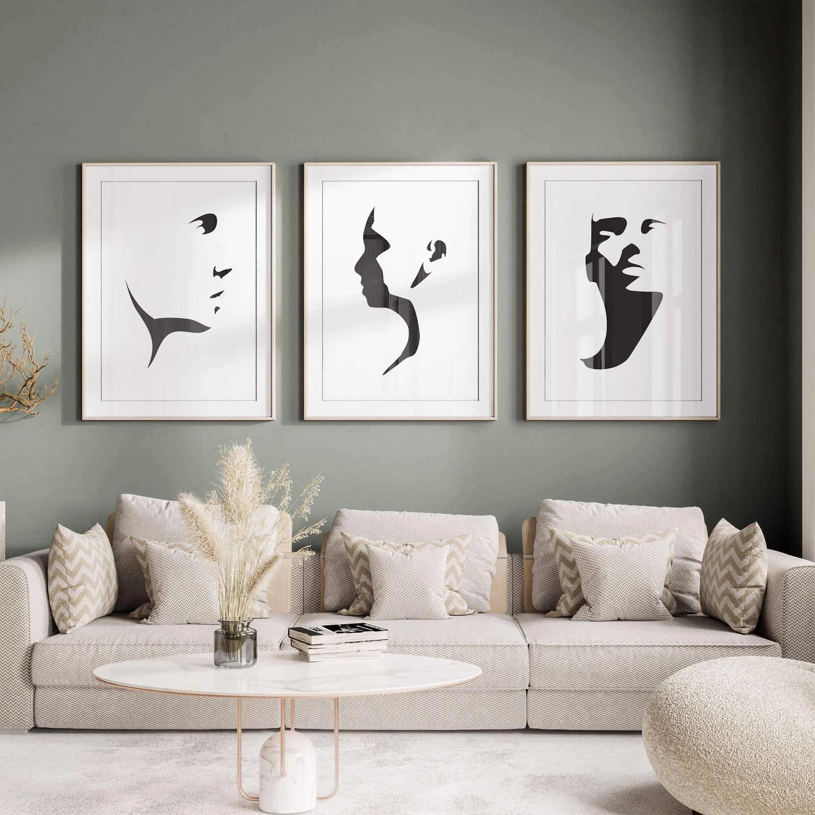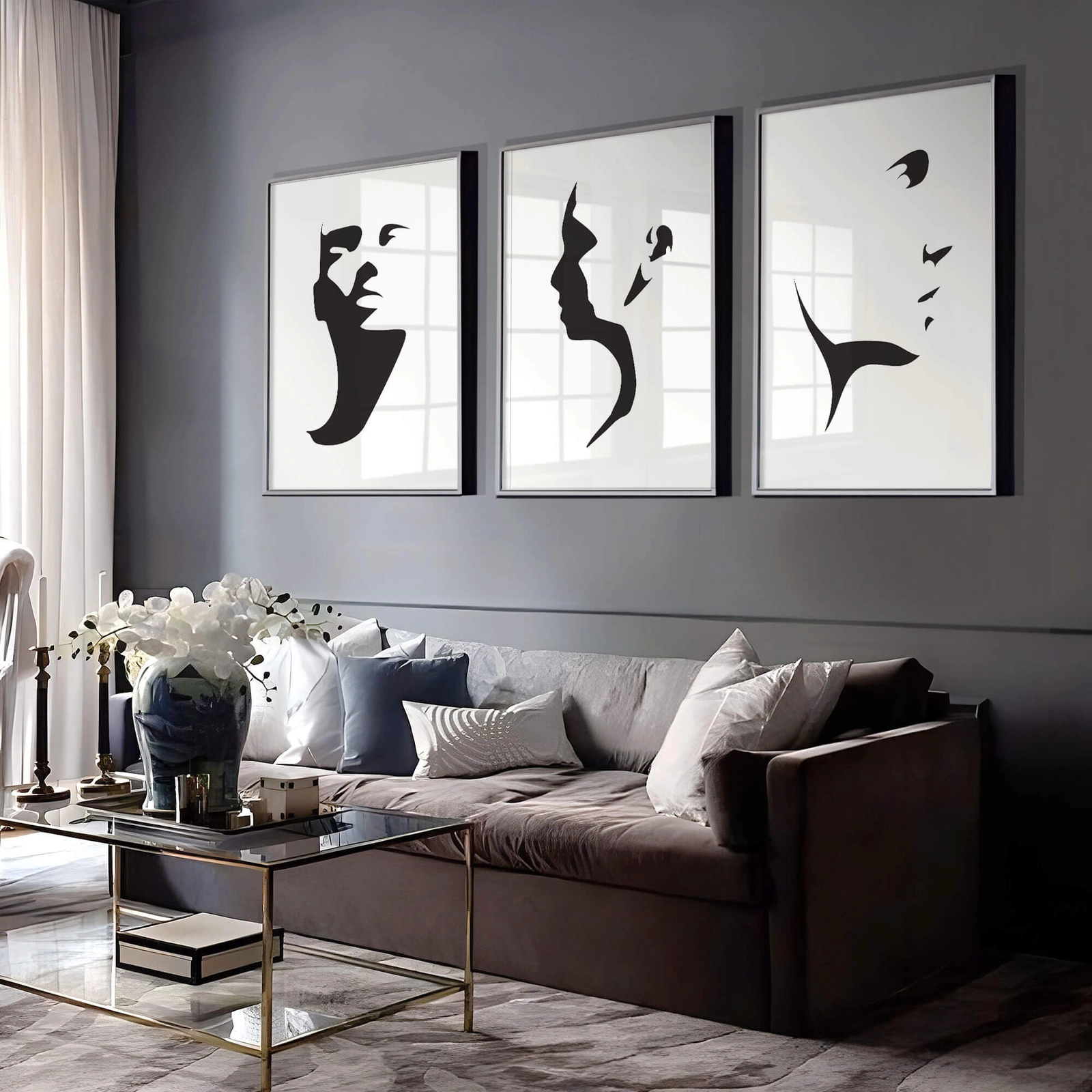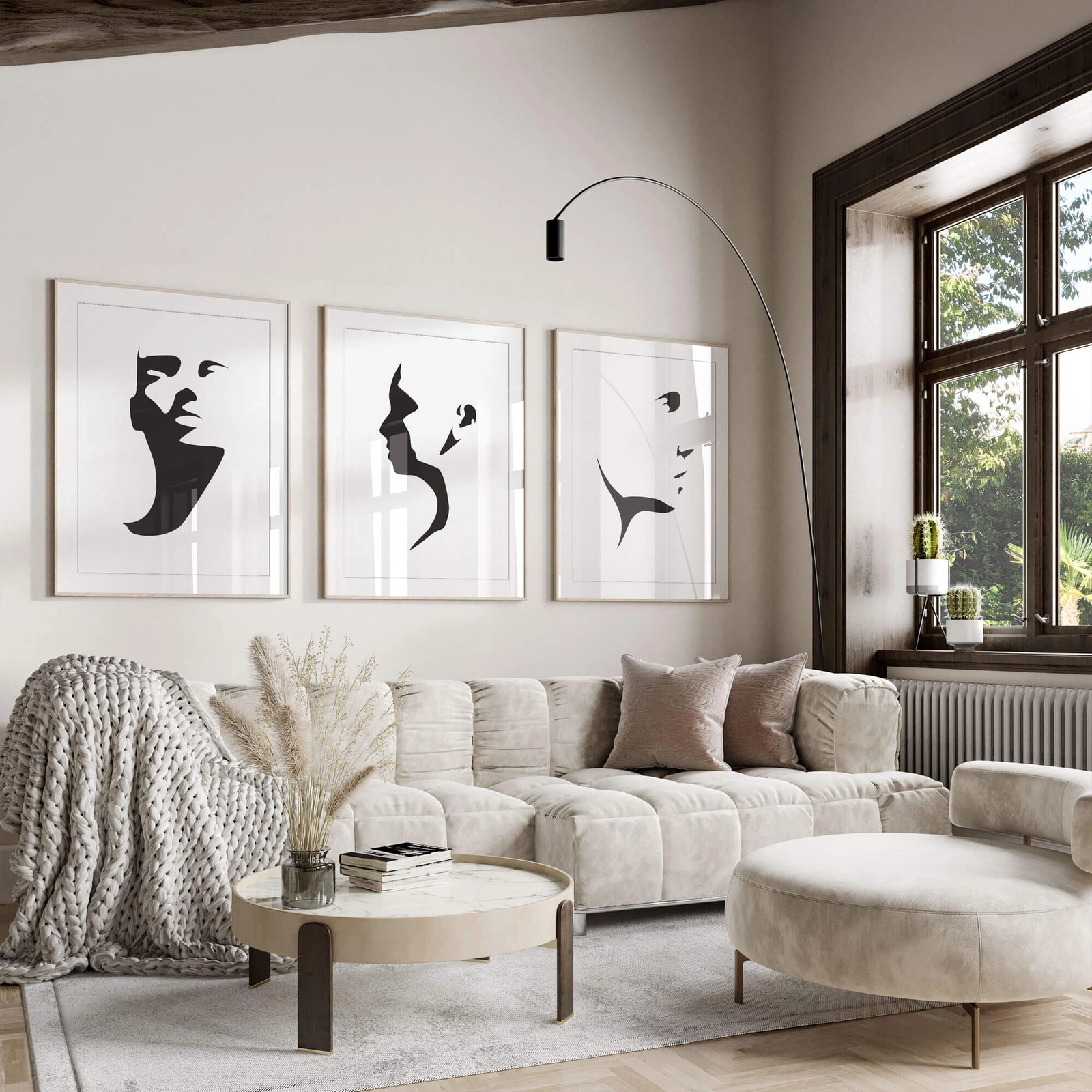 - Zestaw plakatów trzy twarze to zestaw bardzo nowoczesny, modernistyczny a zarazem minimalistyczny. Przedstawia rysowane twarze w różnych pozycjach. Jest wręcz idealnie skrojony pod nowoczesne wnętrza.