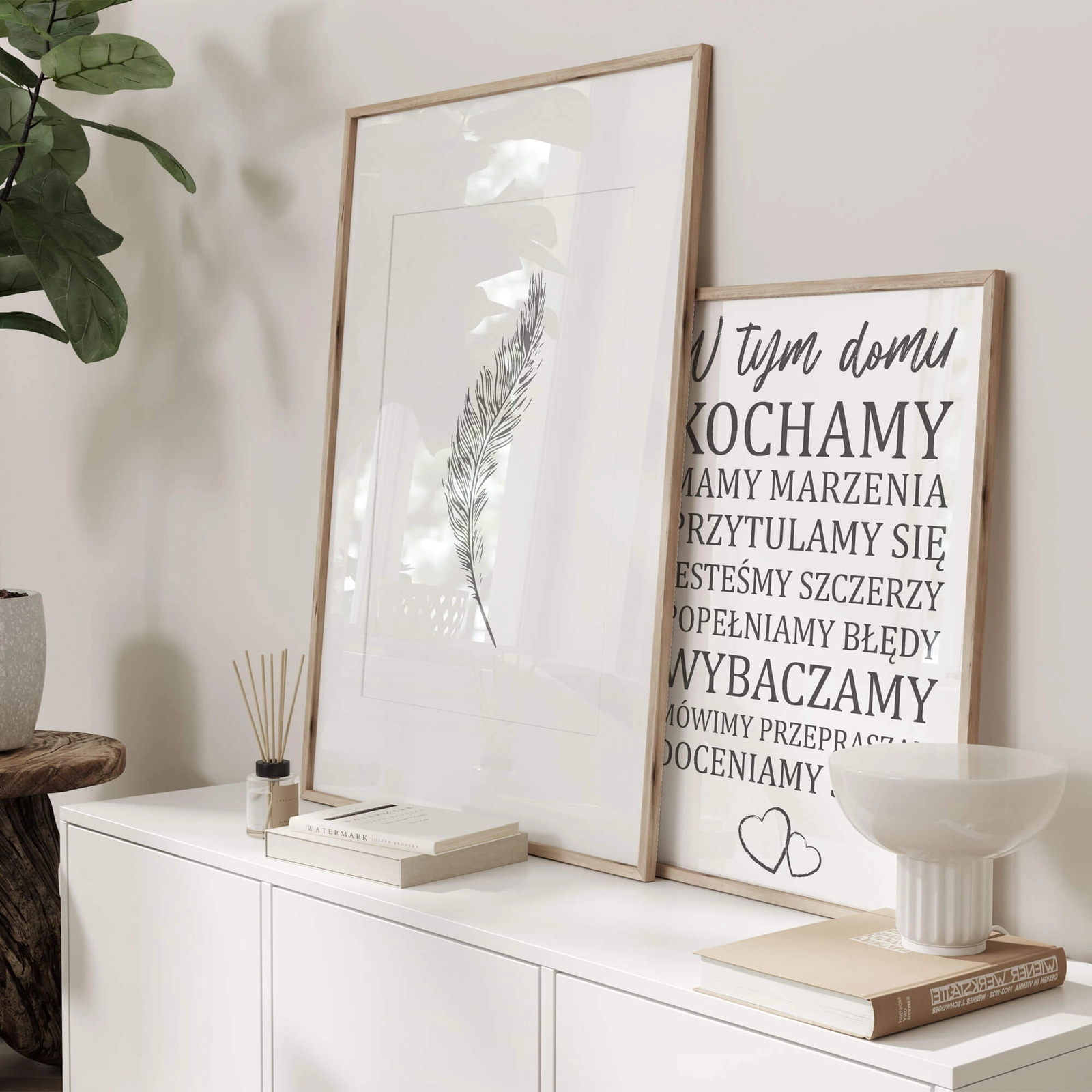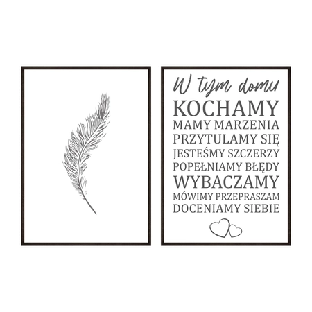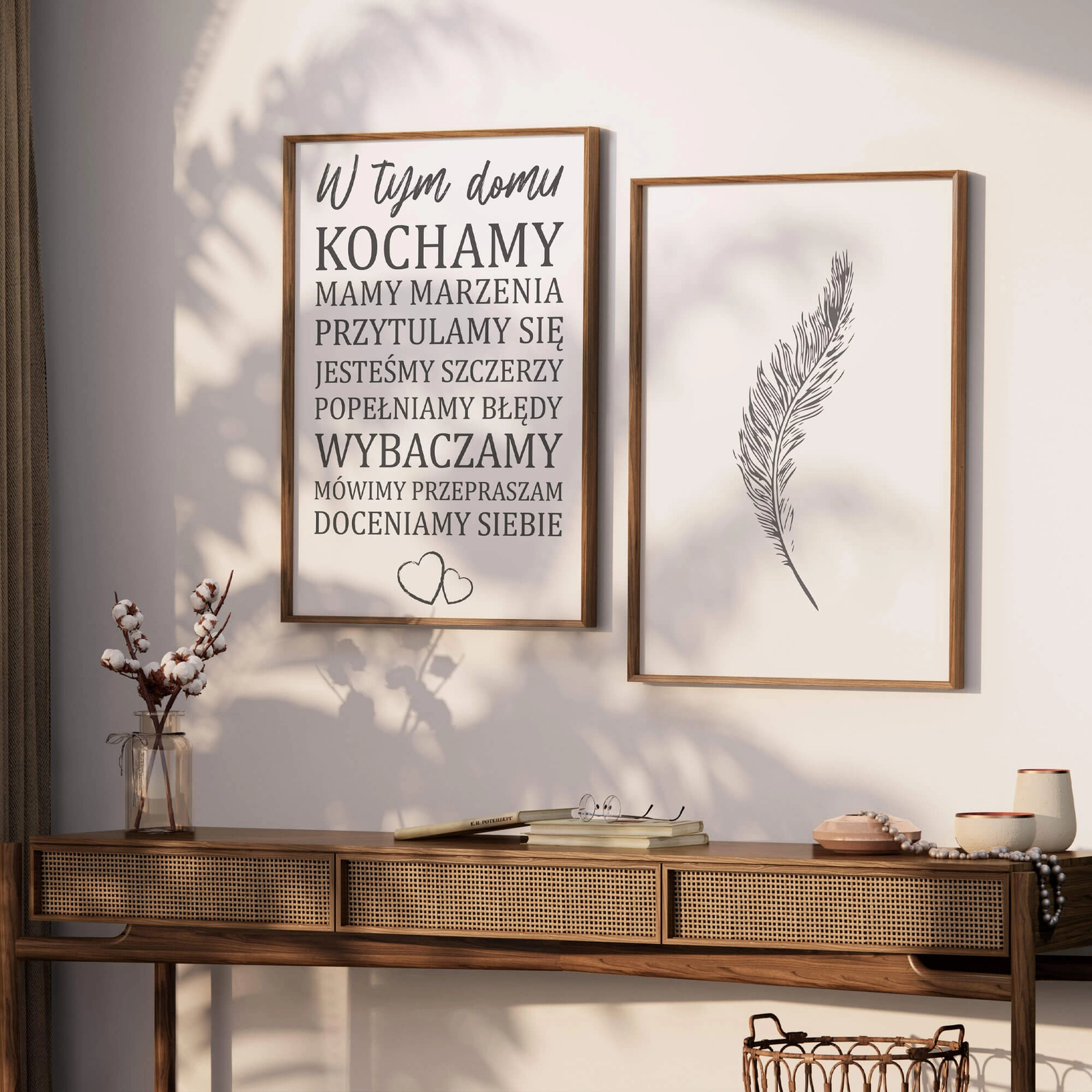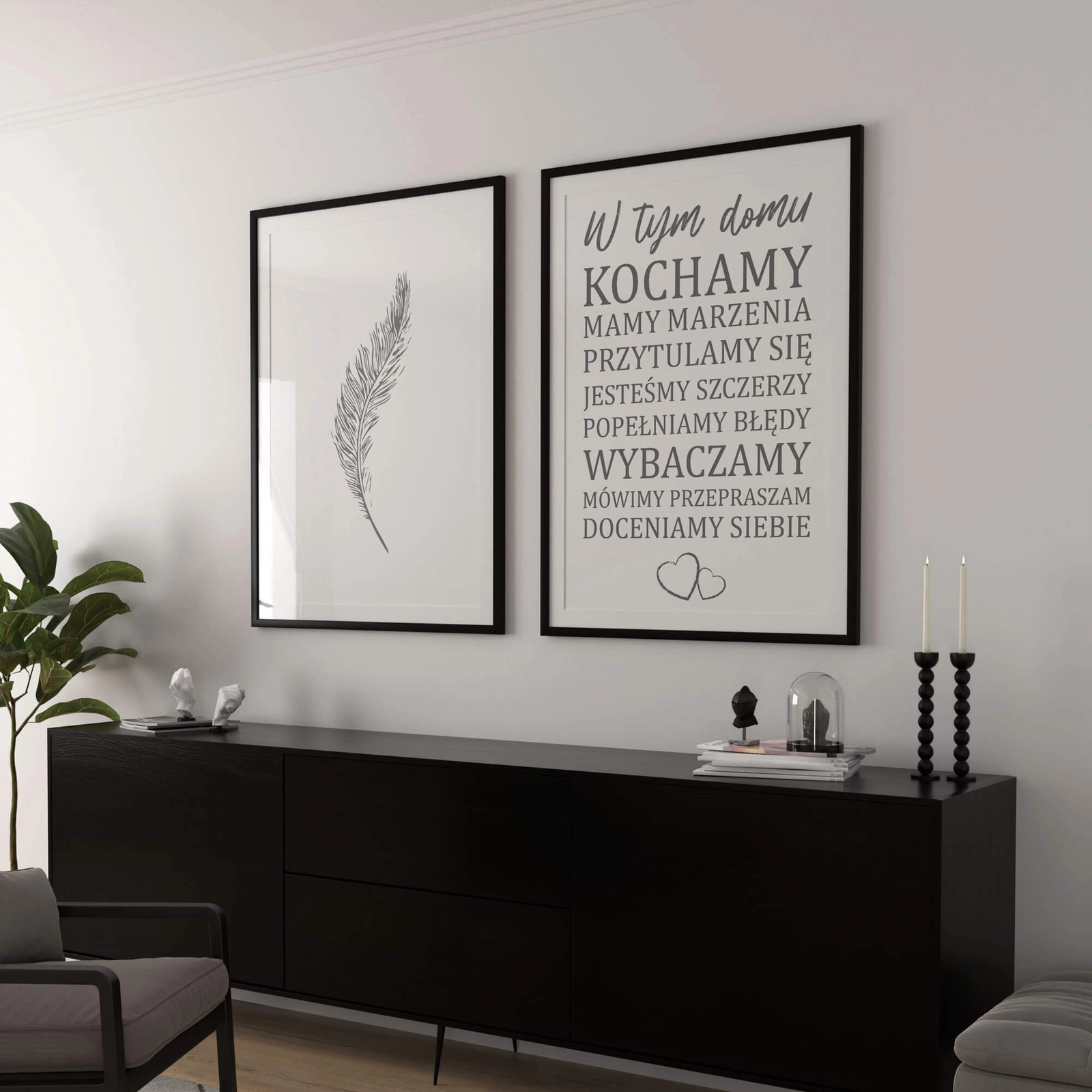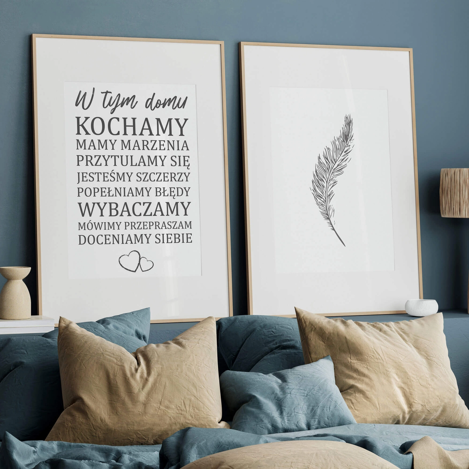- Zestaw plakatów w tym domu to jeden plakat typograficzny i jeden plakat graficzny. Plakat typograficzny w kilku słowach i zdaniach przypomina o najważniejszych wartościach każdej rodziny. Całość uzupełniona została plakatem z motywem piórka.