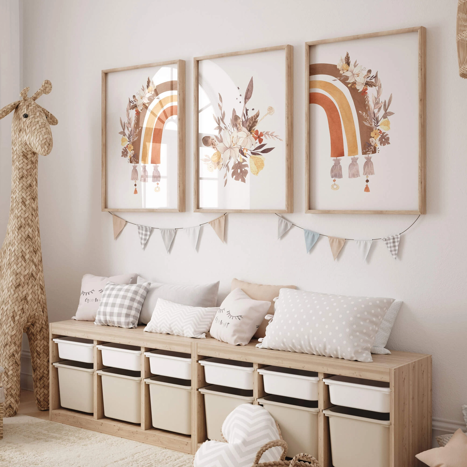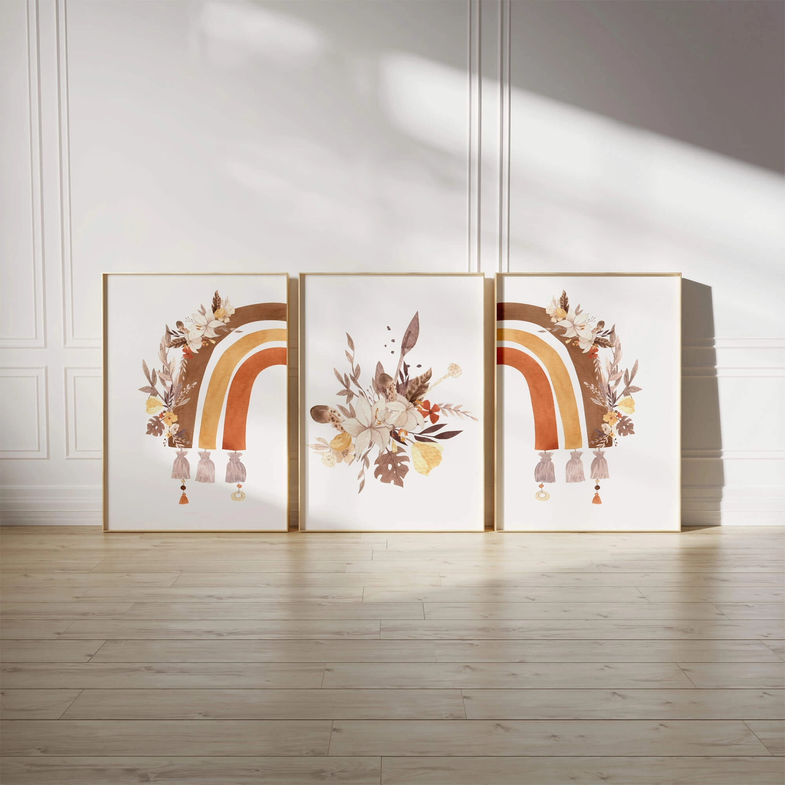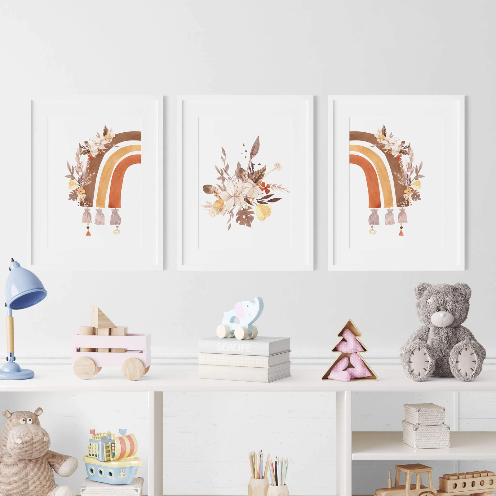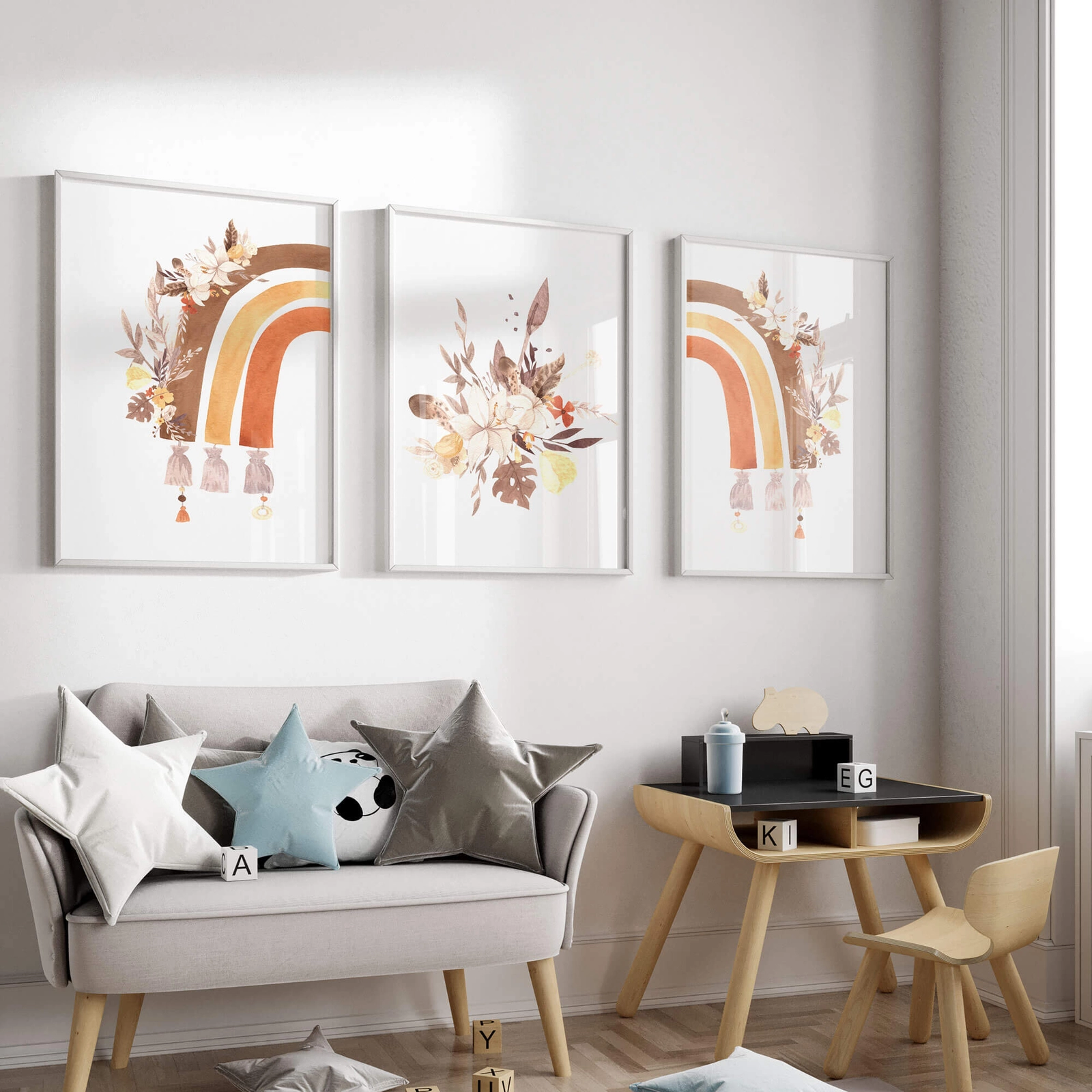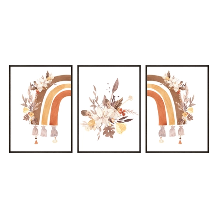 - Zestaw plakatów wildflower rainbow to dekoracja skierowana głównie do pokoju dziewczynki. Są to dwa plakaty z tęczą i jeden z bukietem kwiatów. A wszystko utrzymane w stylu boho. Ten zestaw będzie wspaniałym dodatkiem dekoracyjnym do pokoju dziecięcego.