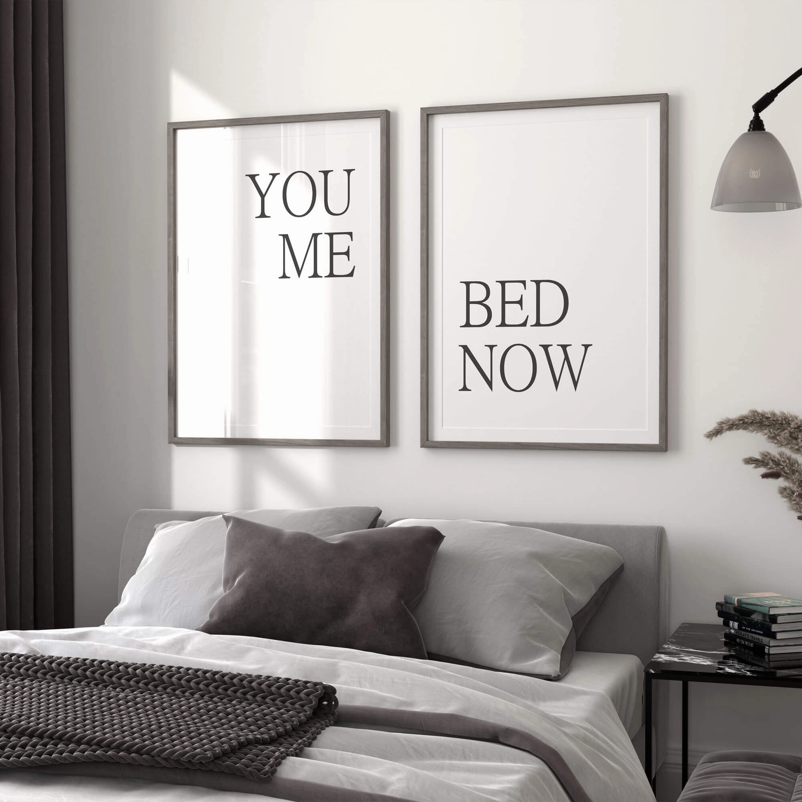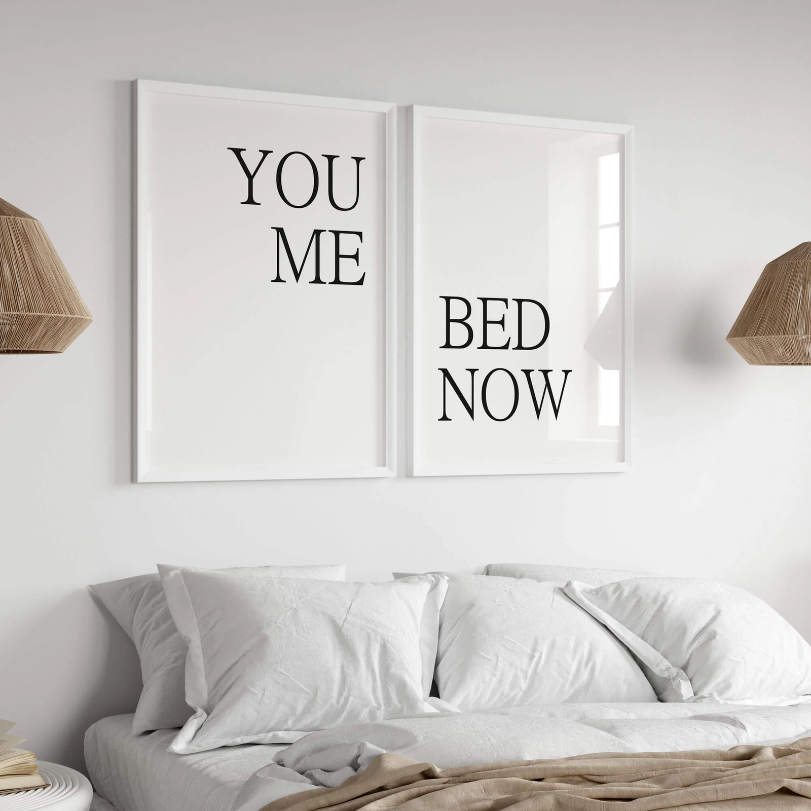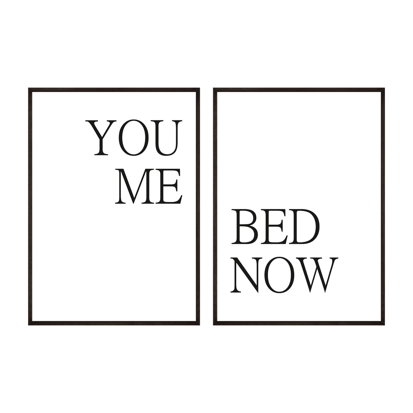 - Zestaw plakatów you me bed now to zestaw dwóch plakatów z czarnym tekstem wydrukowanym na białym tle. Będzie to doskonały dodatek aranżacyjny każdej sypialni, bez względu na styl w jakim została urządzona.