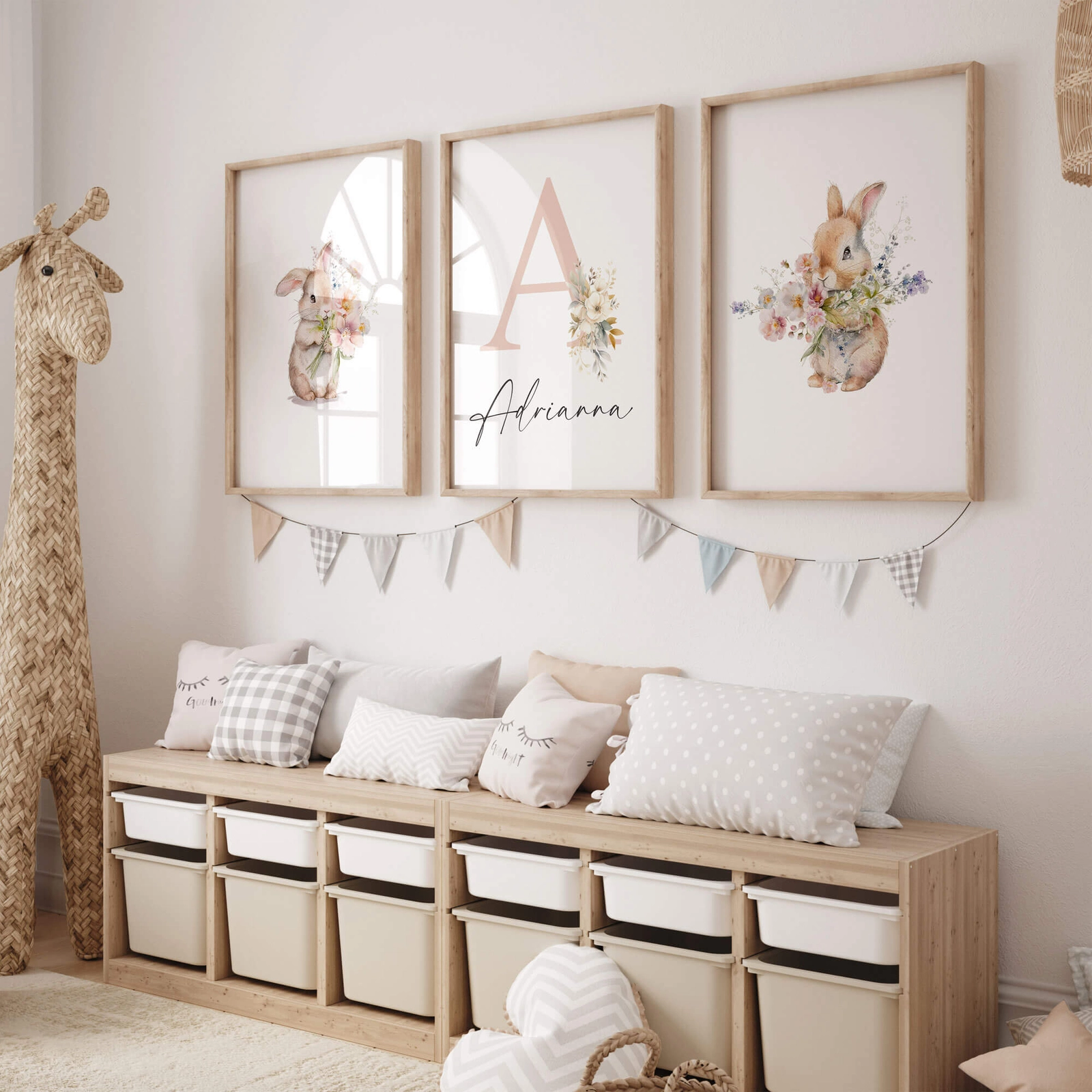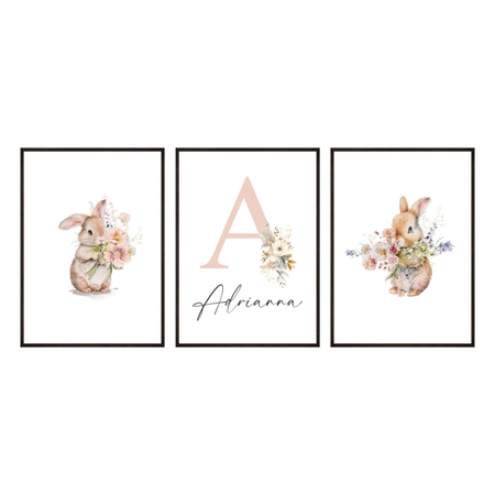 - Przepiękny, personalizowany zestaw 3 plakatów dla dzieci, na których znajdują się króliczki oraz imię dziecka. Kolorowe, pastelowe odcienie króliczków oraz osobisty akcent sprawiają, że plakaty doskonale wpisują się w różne aranżacje pokojów dziecięcych.